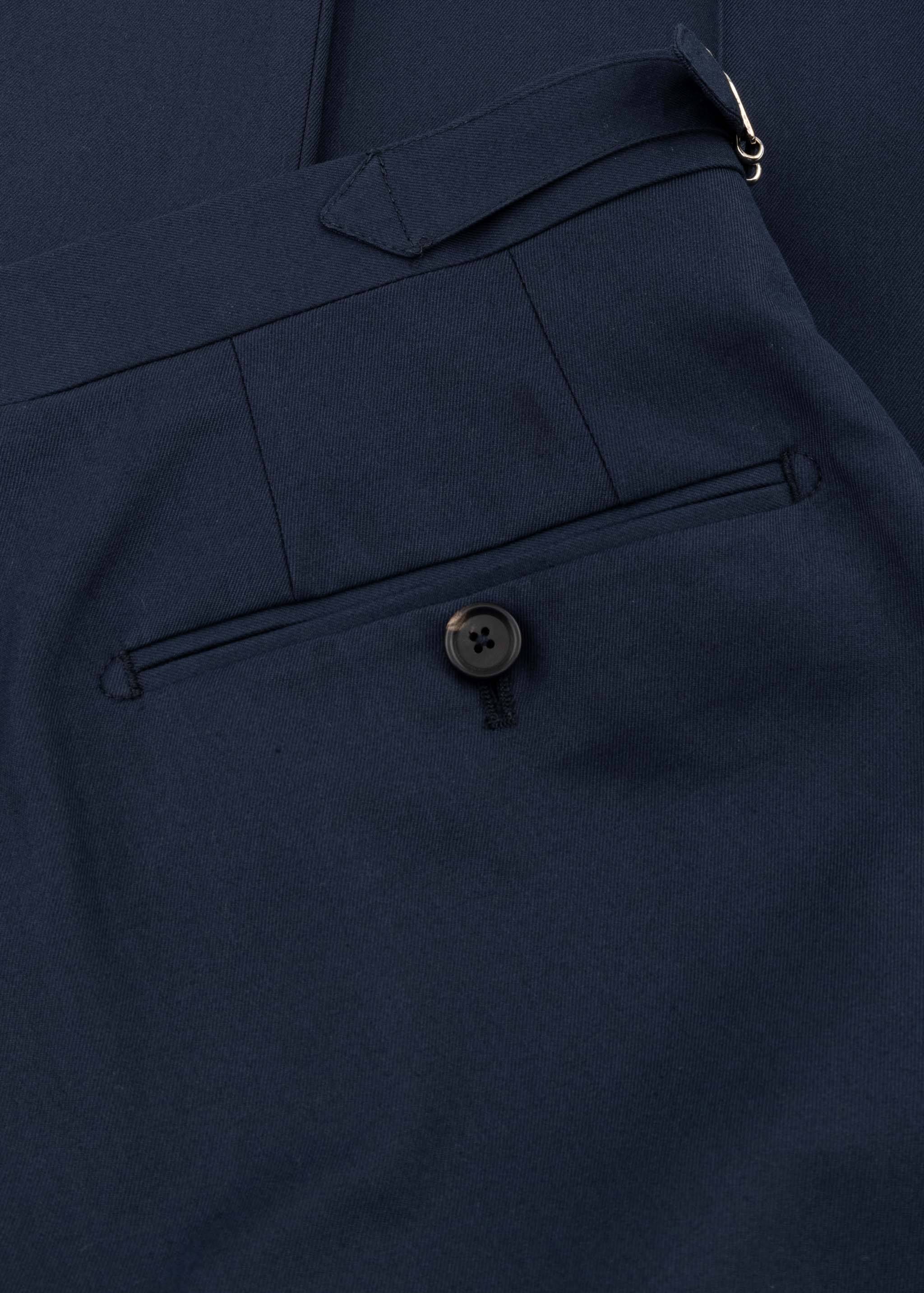 Trousers with button placket and zipper, adjustable tabs at the sides of the waistband, pressed pleats and pleats, side pockets, coin pocket, back pockets with button closure, open hem.