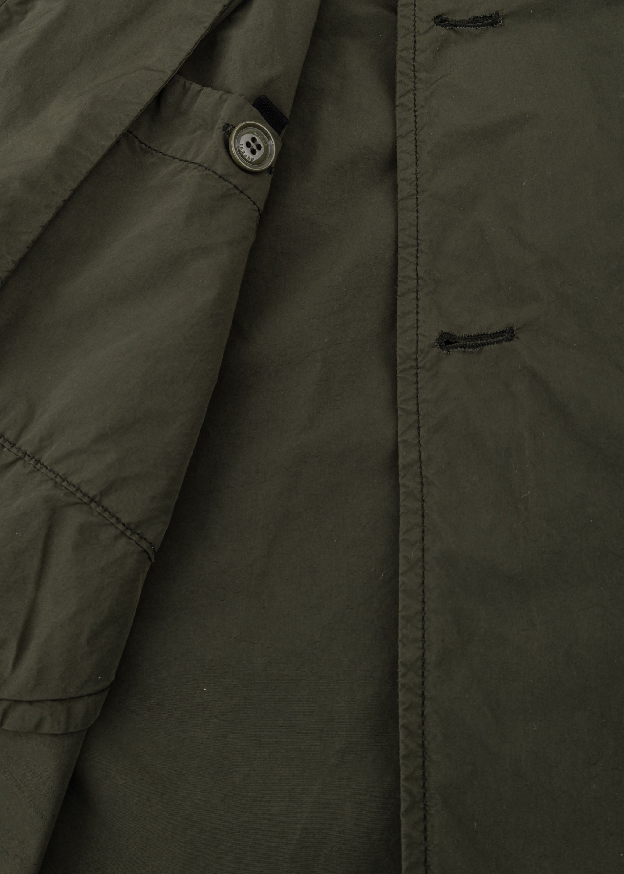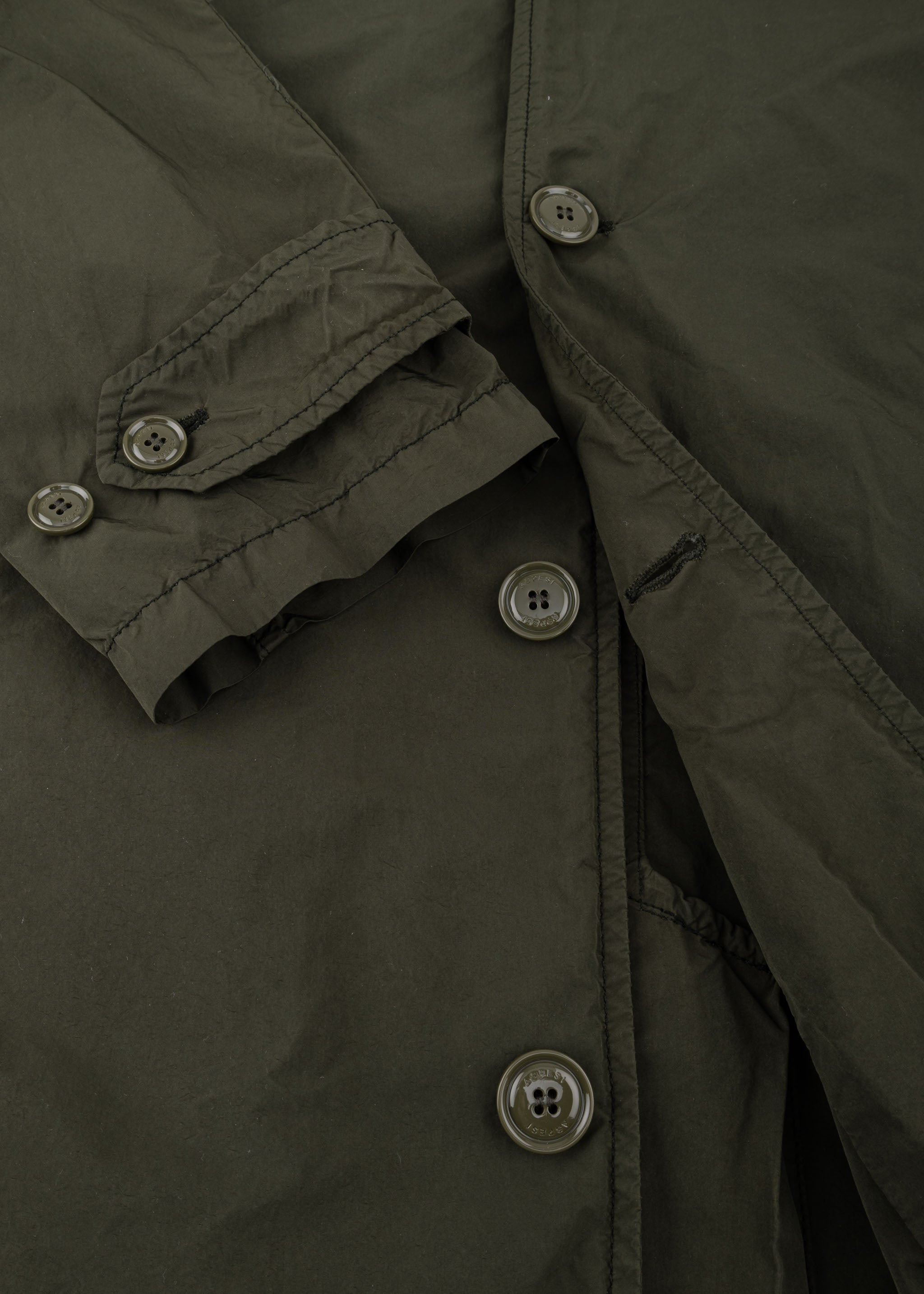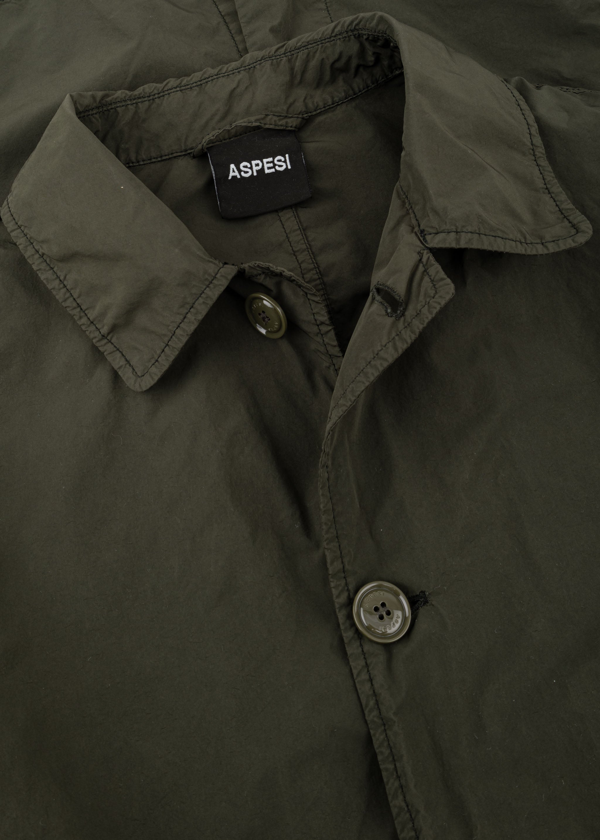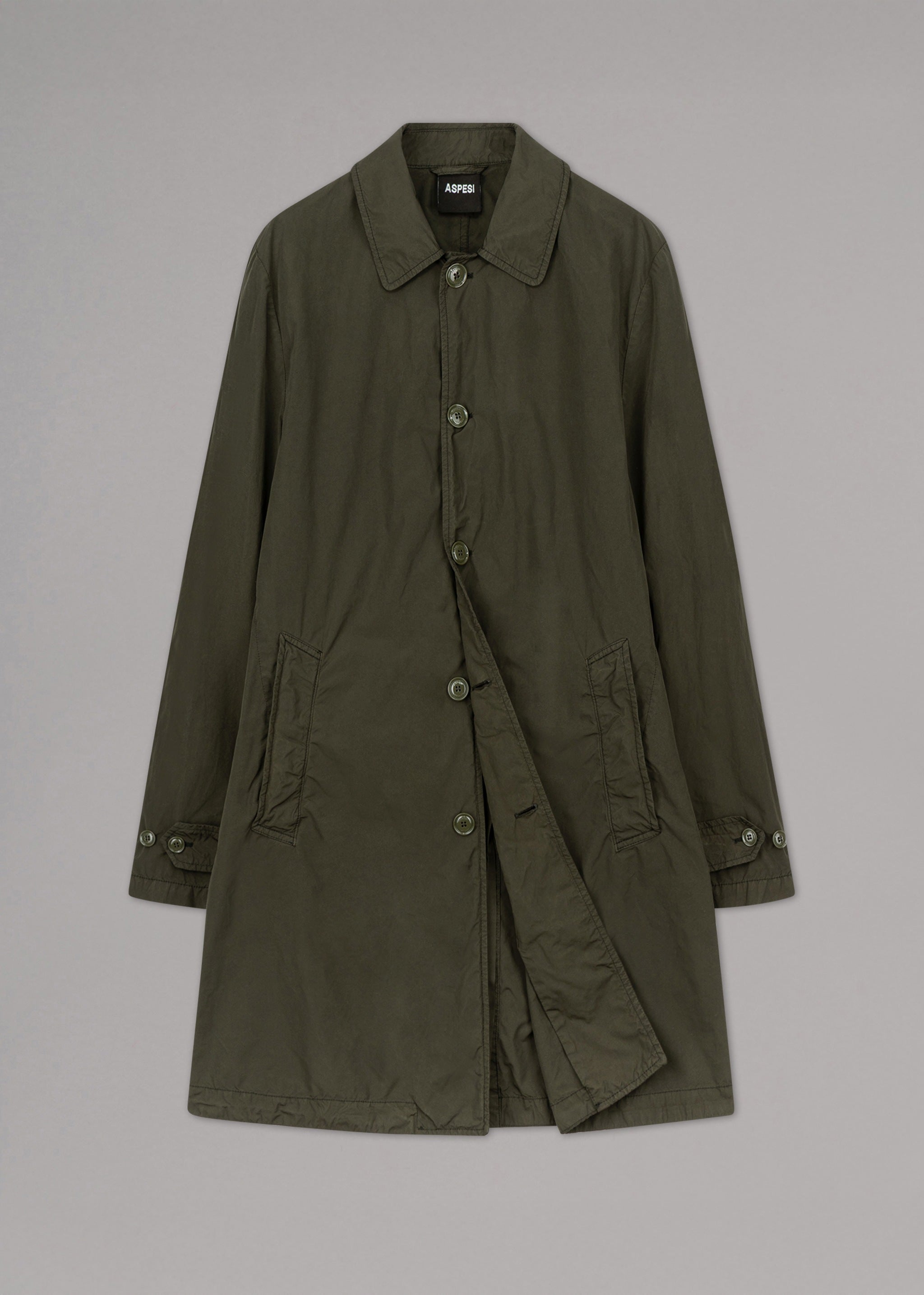 'Lemon' raincoat by Aspesi, classic collar, sleeves with adjustable tab and buttons, full-length button placket, side slit pockets, one internal pocket, straight hem with back vent.