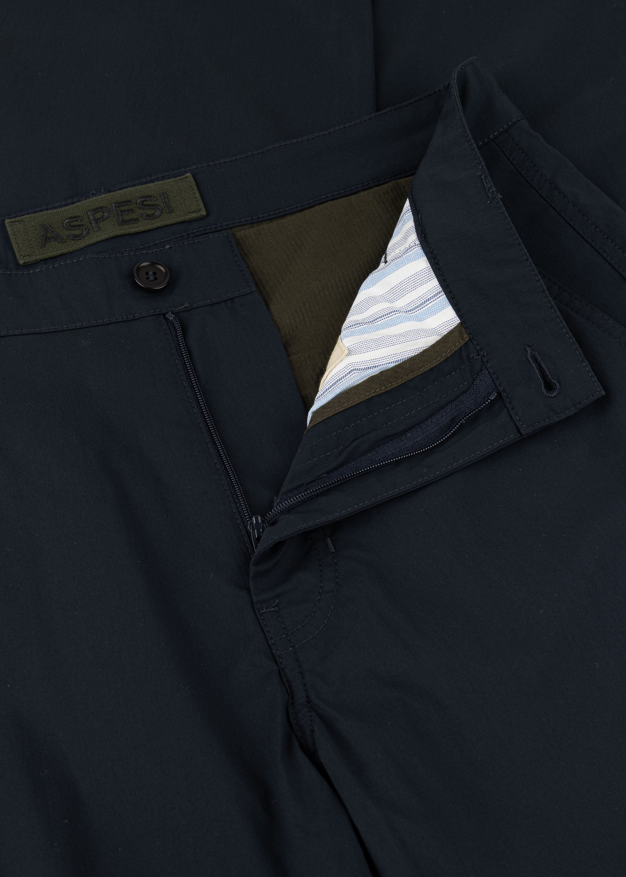 Slim-fit trousers by Aspesi made from a lightweight technical material blend, belt loops, button and zip fastening, side pockets, jetted back pockets, soft feel, slight sheen.