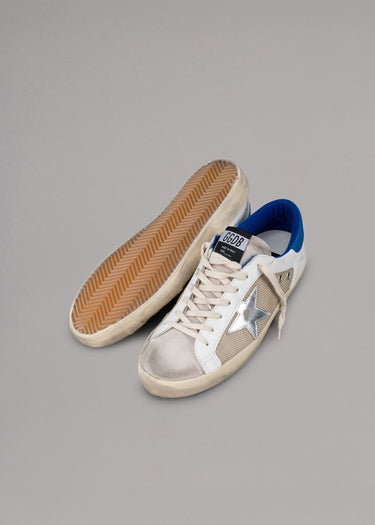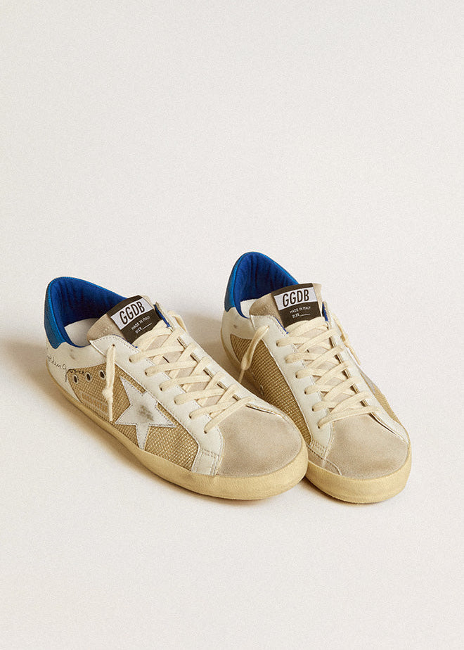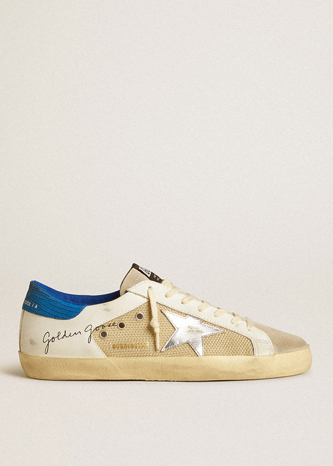 Golden Goose 'Super-Star' sneakers in smooth leather and canvas, blue heel counter, lettering, vintage treatment.