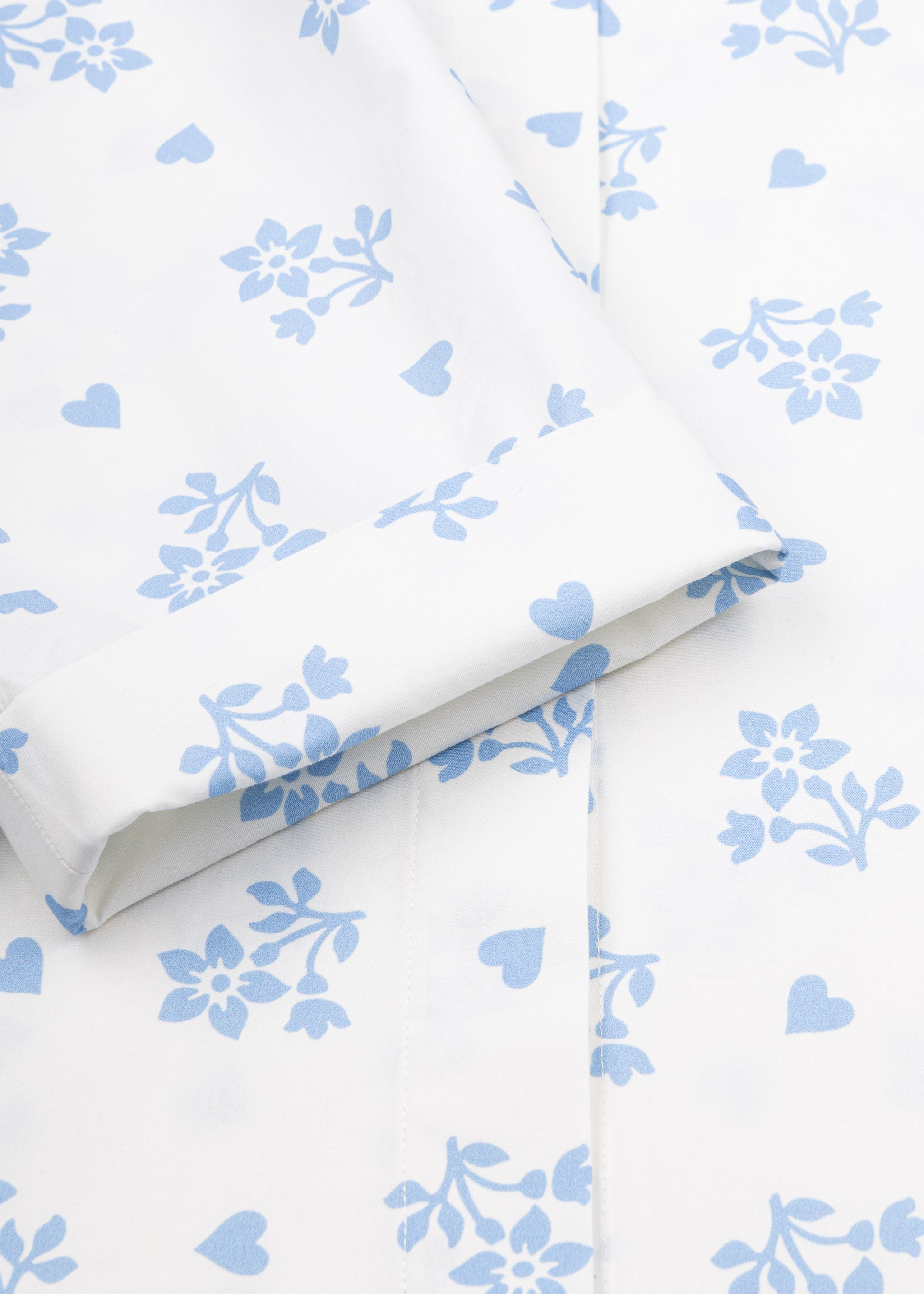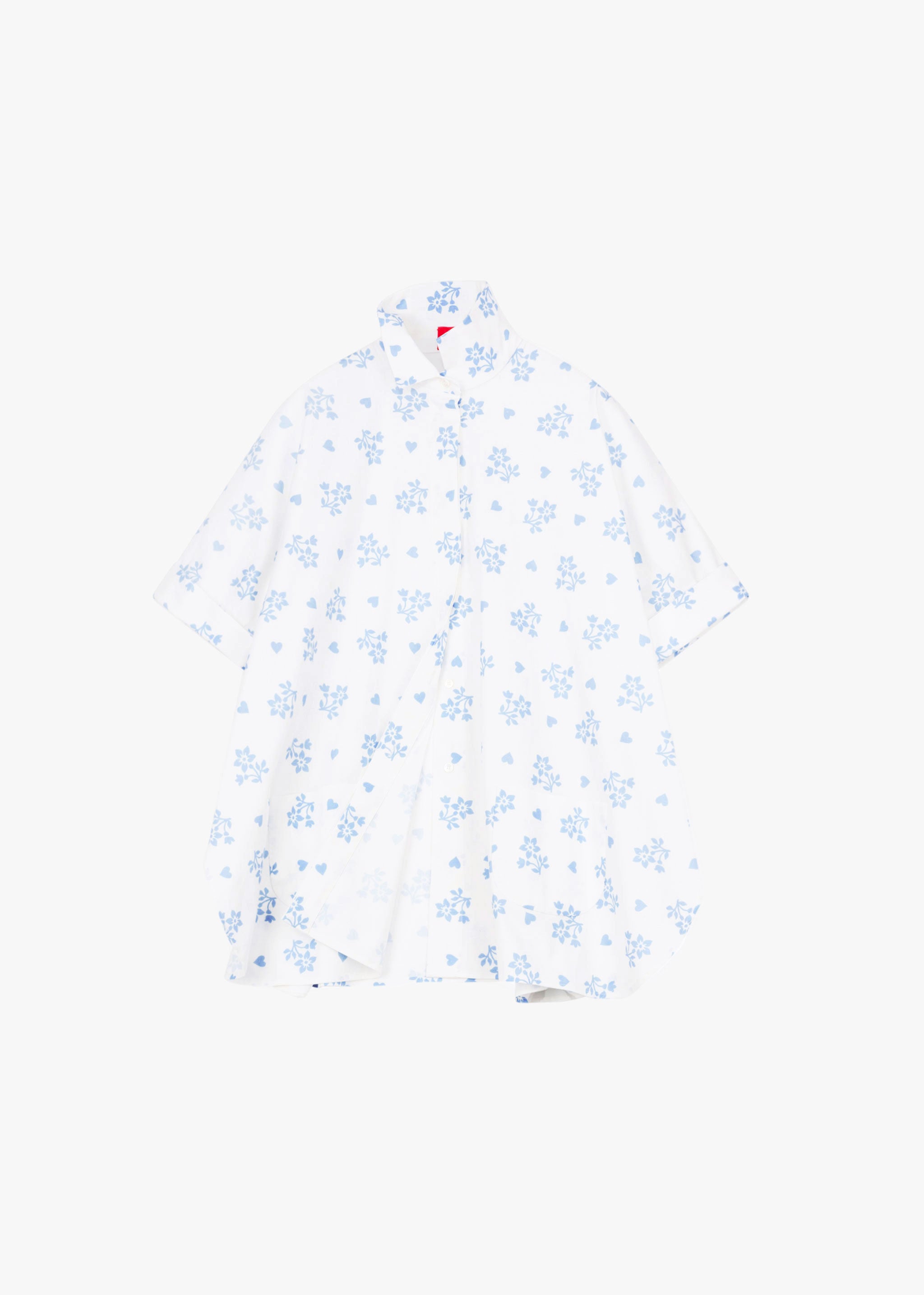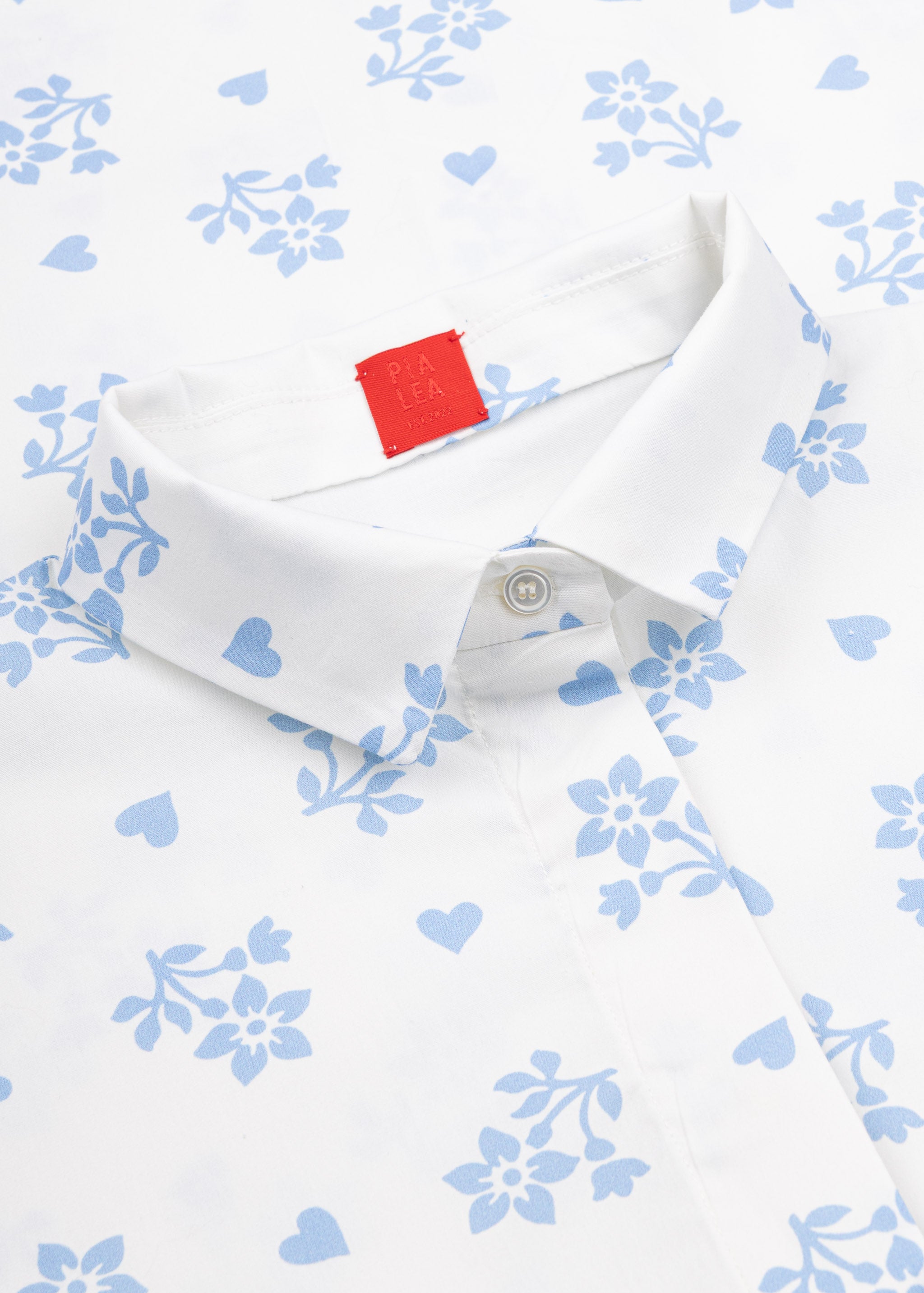 Loose blouse by PiaLea, pointed collar, concealed button placket, short sleeves with turn-ups, two patch pockets, rounded hem.