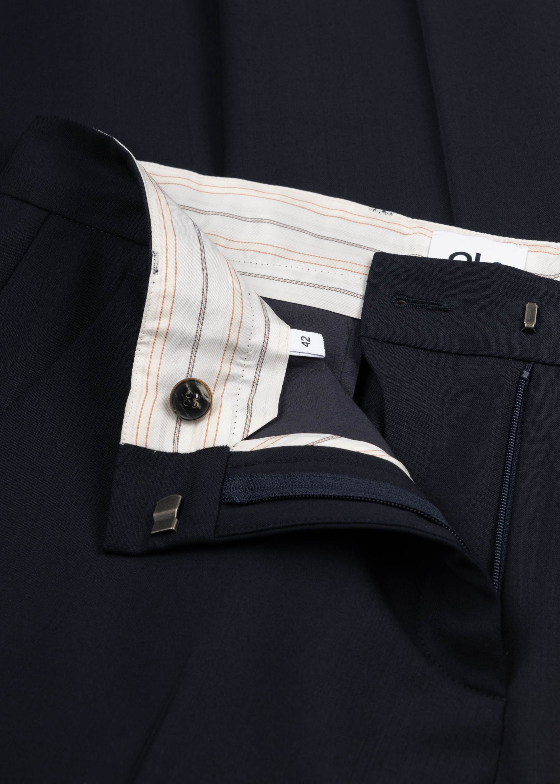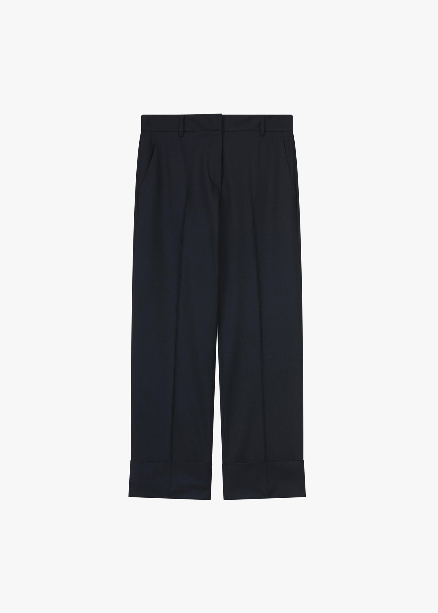 Cotton trousers 'Maura' by Quelle Due, medium-high waistband, hook and zip fastening, belt loops, side pockets, back pockets, shortened straight legs with wide hem cuffs.