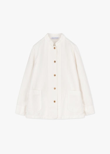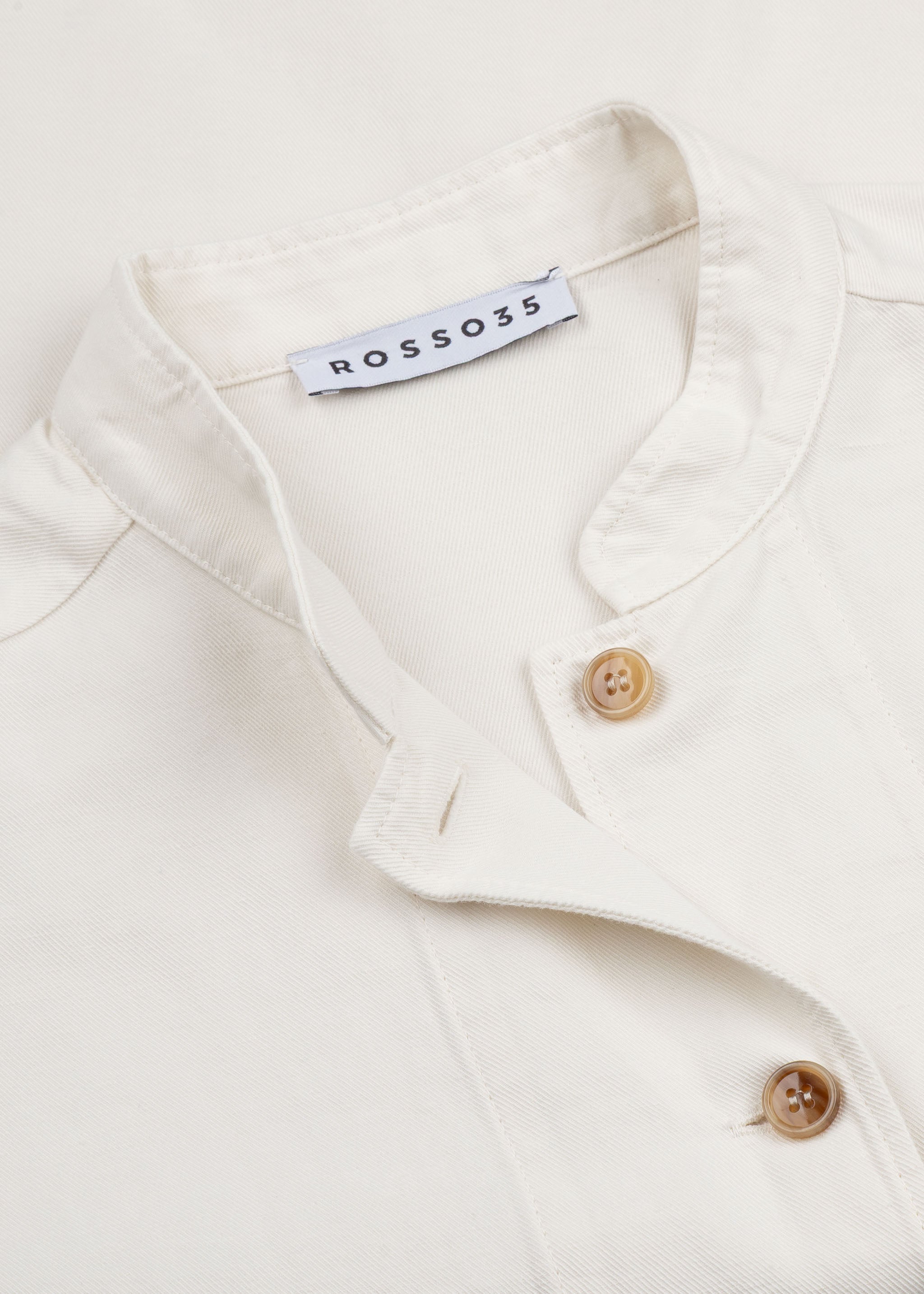 Jacket by Rosso 35 made from a soft cotton-linen blend, stand-up collar, fitted shoulders, long sleeves, button placket, two patch pockets, straight hem, unlined finish.