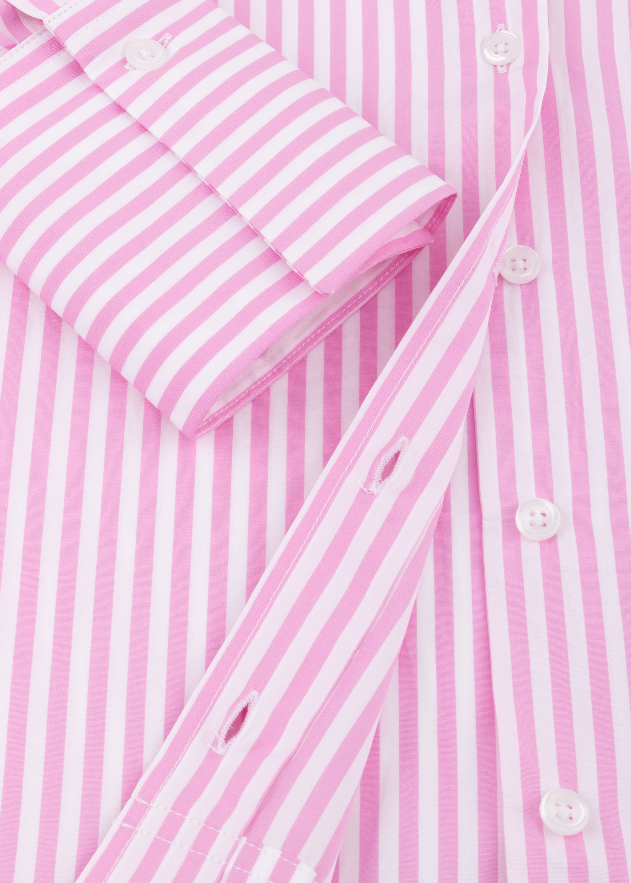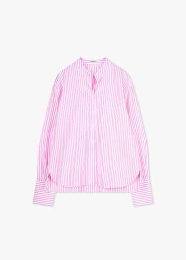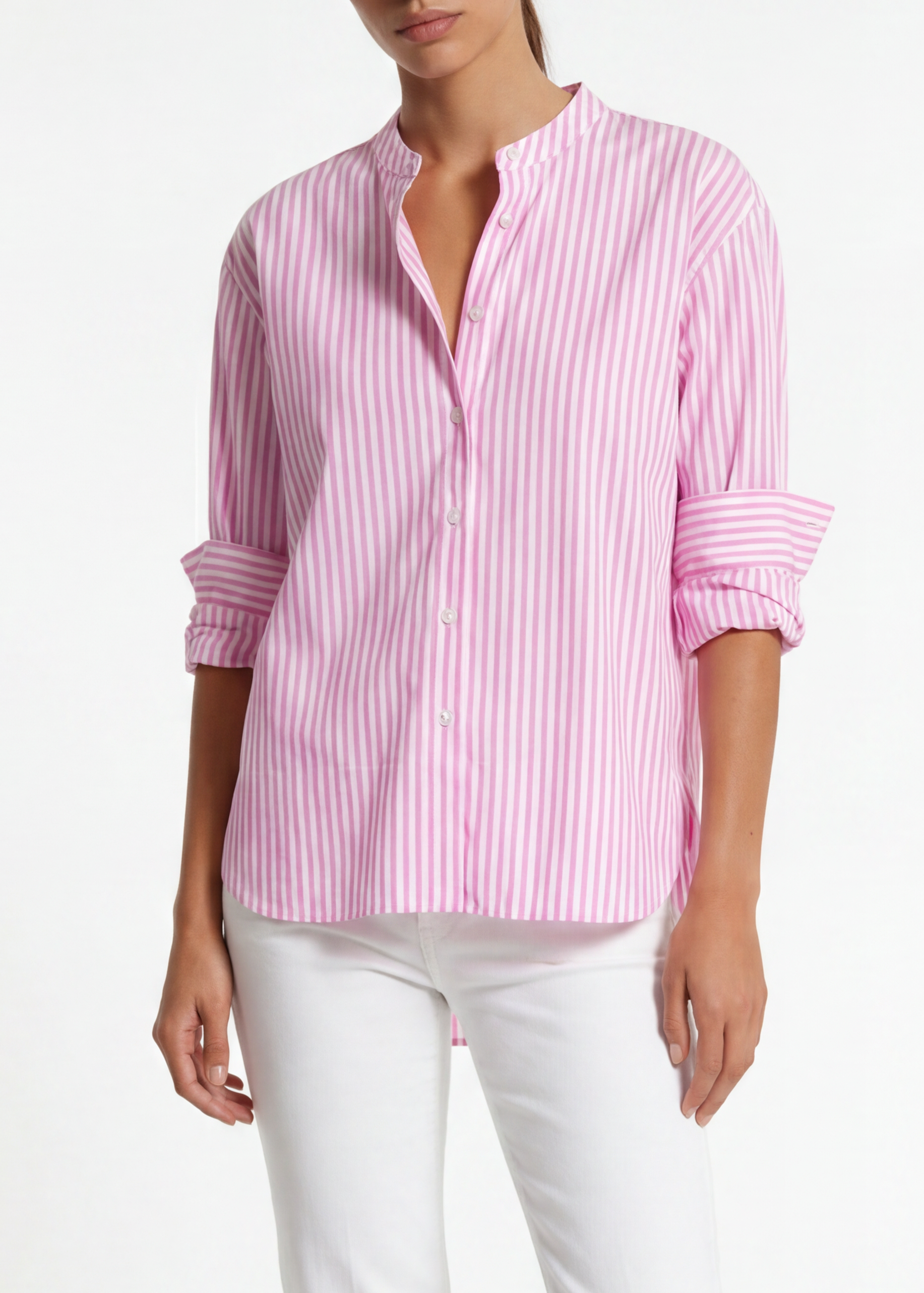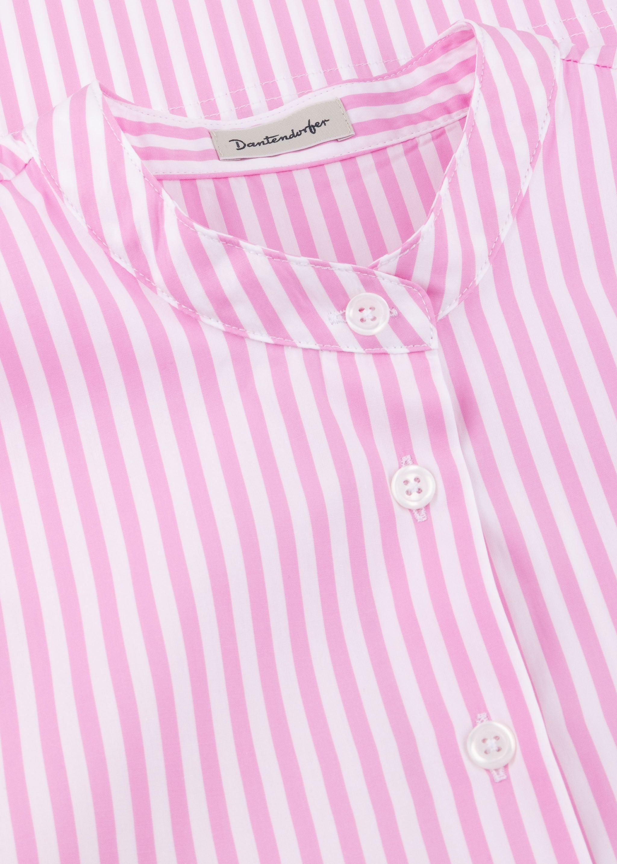 Loose blouse from Dantendorfer made of fine cotton, stand-up collar, fitted shoulders, long sleeves with wide button cuffs, full button placket, rounded hem, soft feel.