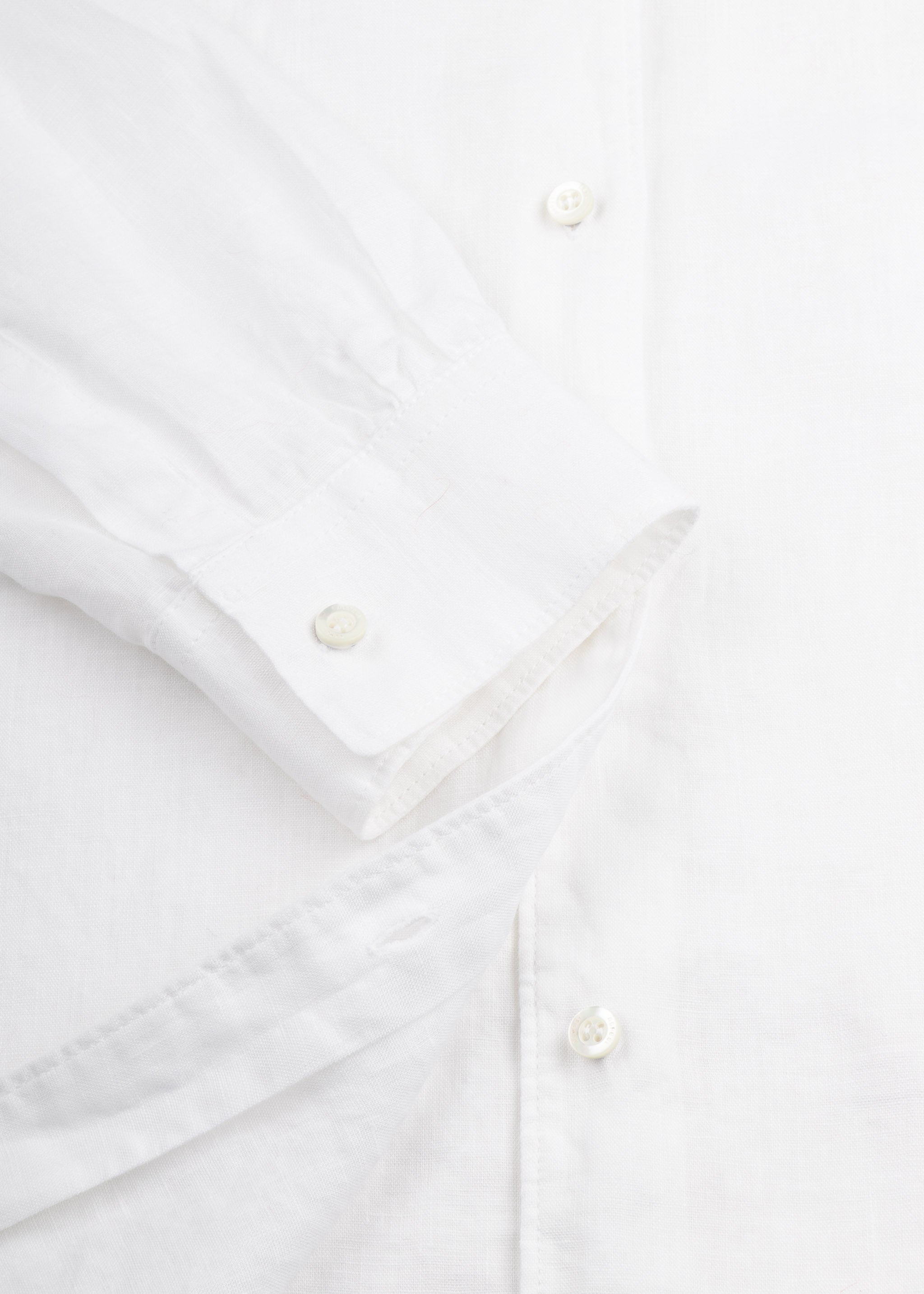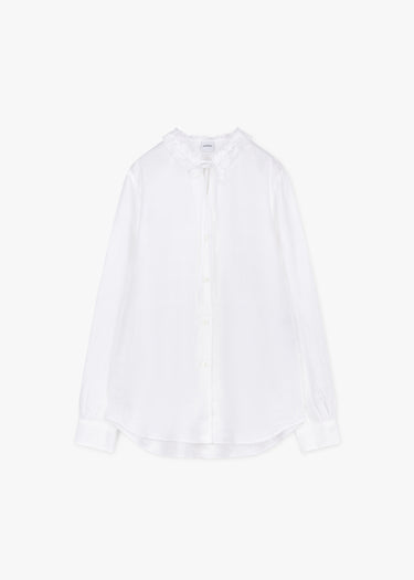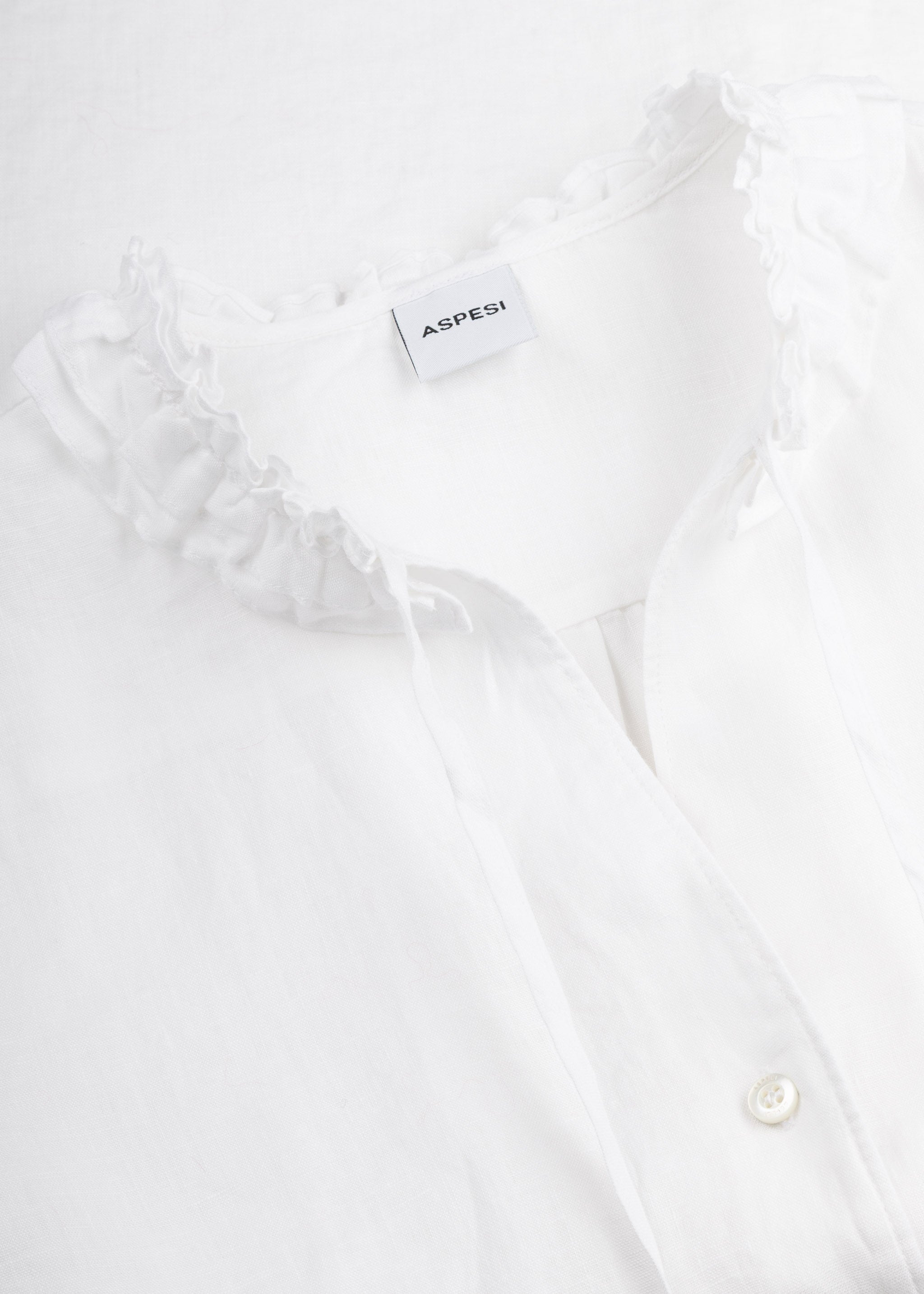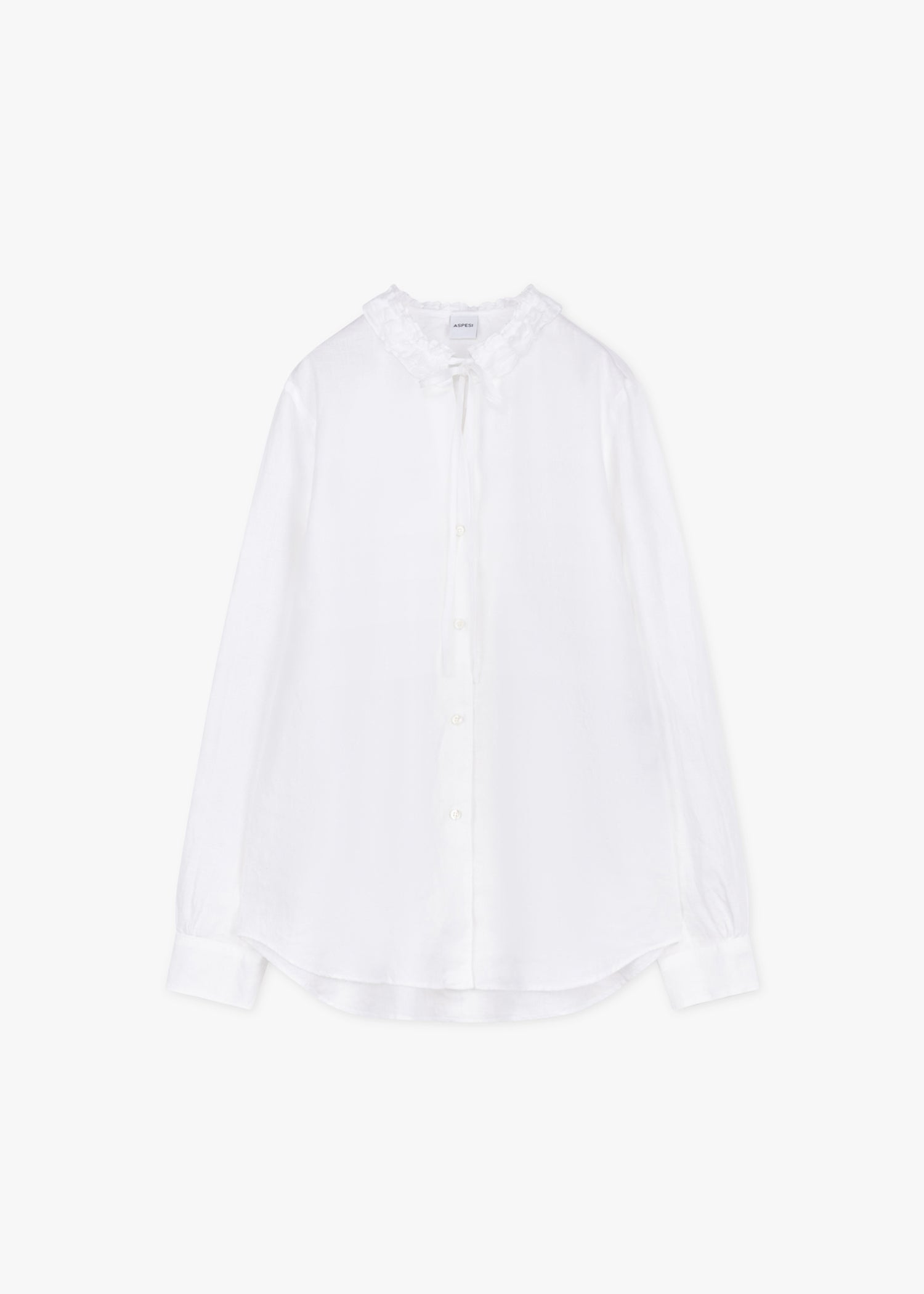Loose-fitting linen blouse from Aspesi, screw neck with tie-on ruffles, back yoke with pleats, full button placket, long sleeves with buttoned cuffs, rounded hem, slightly transparent.