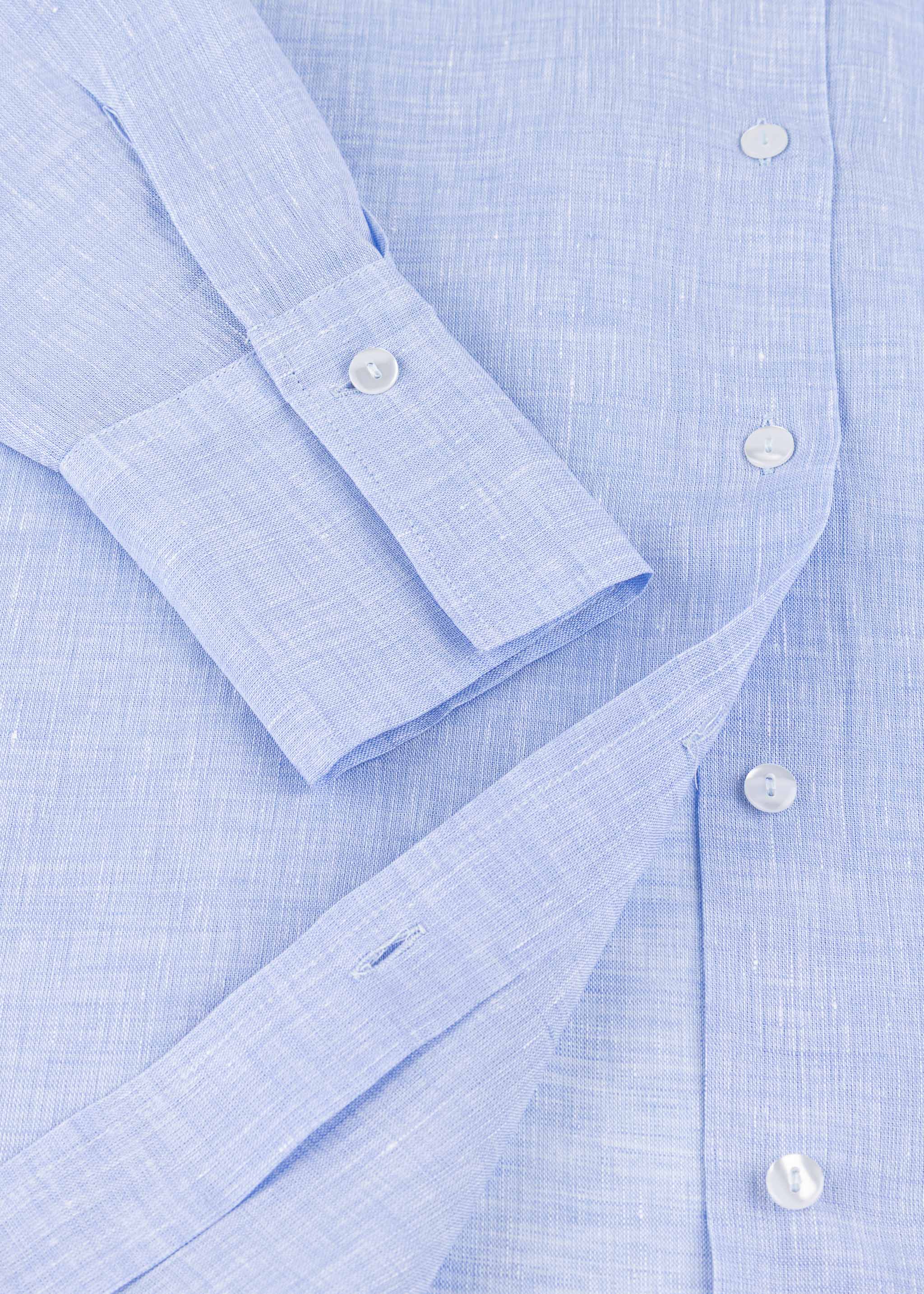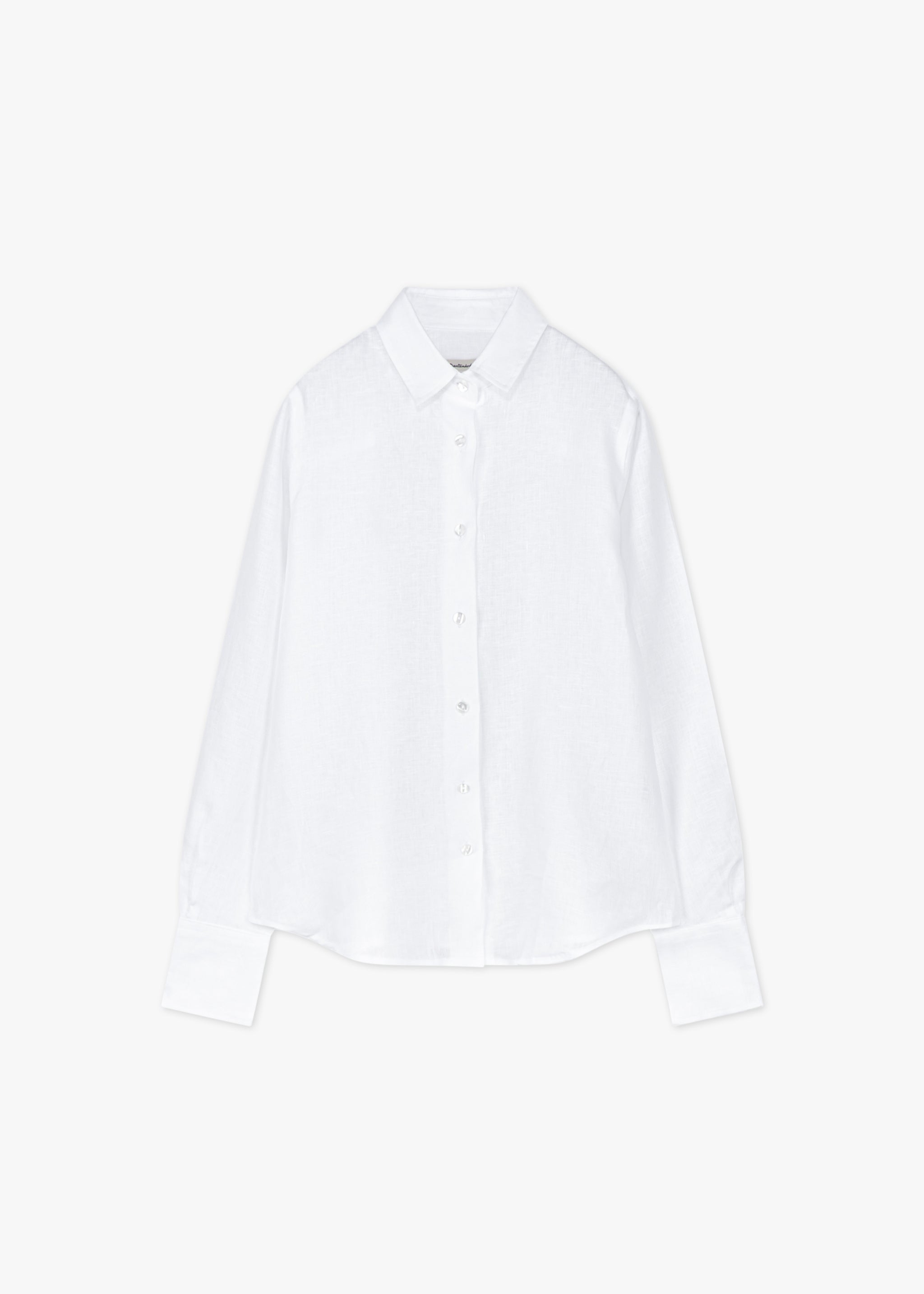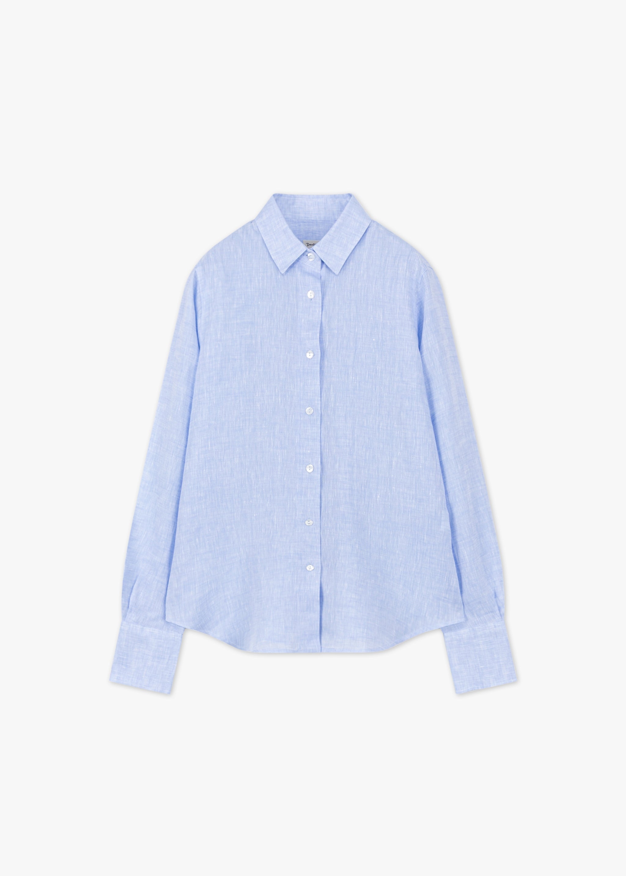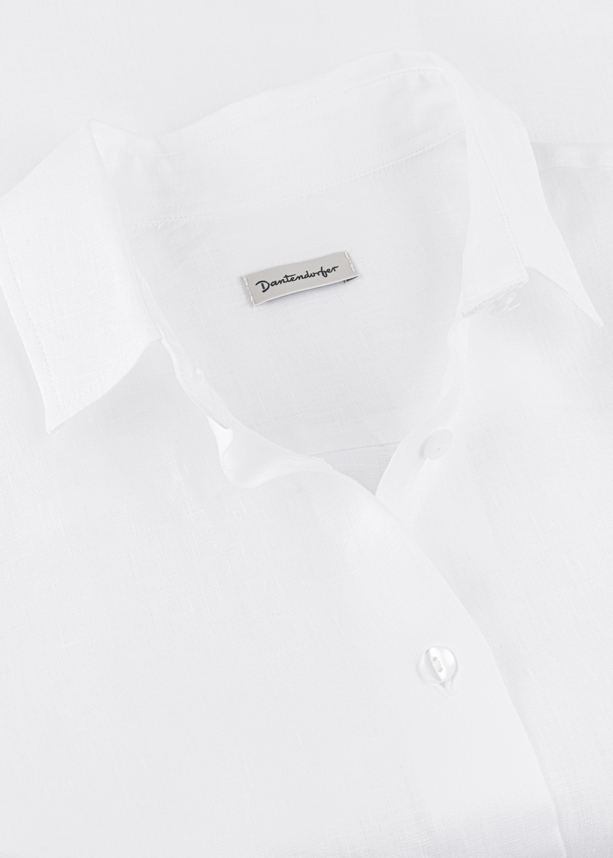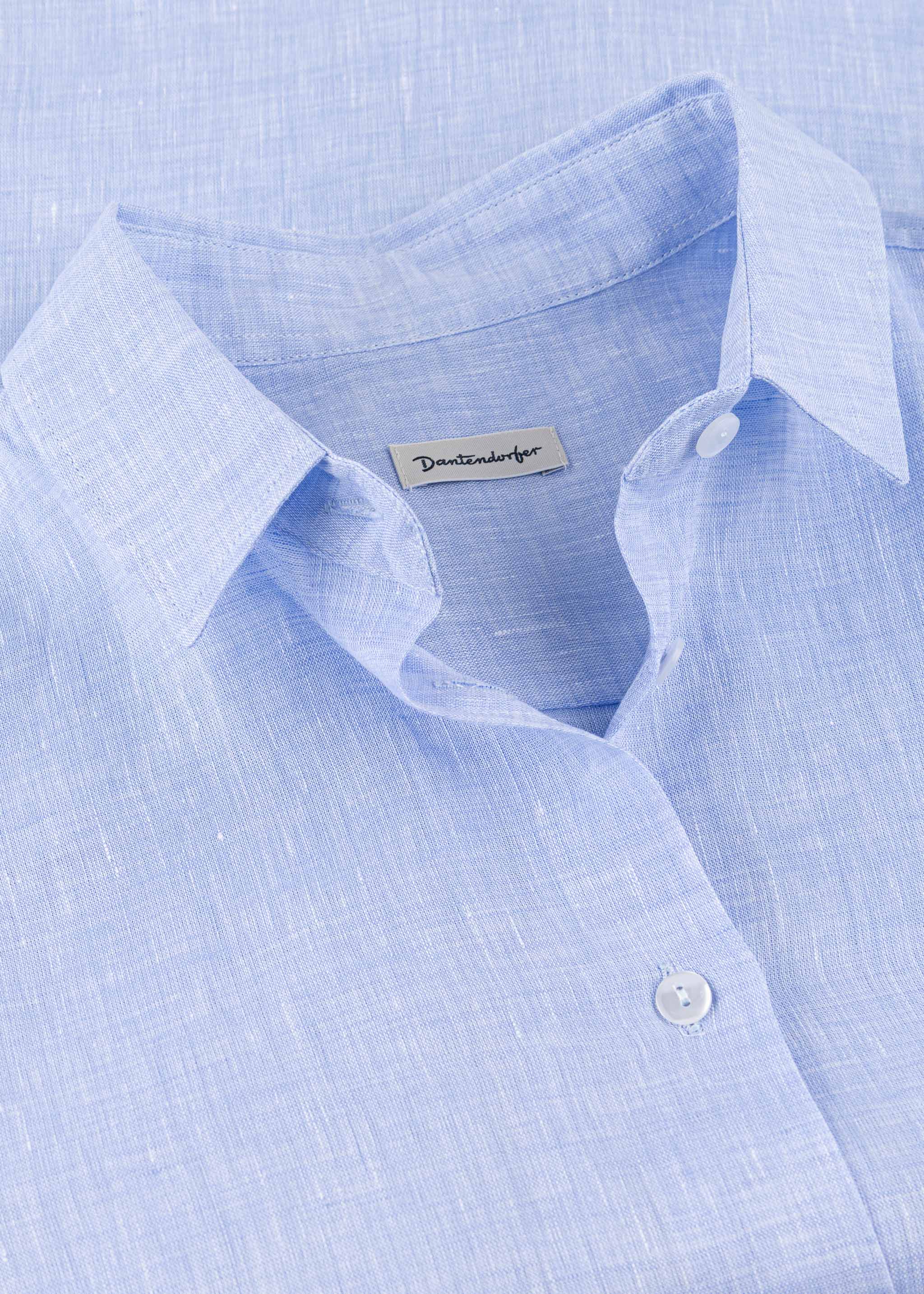 Blouse by Dantendorfer made of airy linen, classic collar, fitted shoulders, long sleeves with wide buttoned cuffs, full-length button placket, back yoke with box pleat, rounded hem, soft feel, subtly mottled.