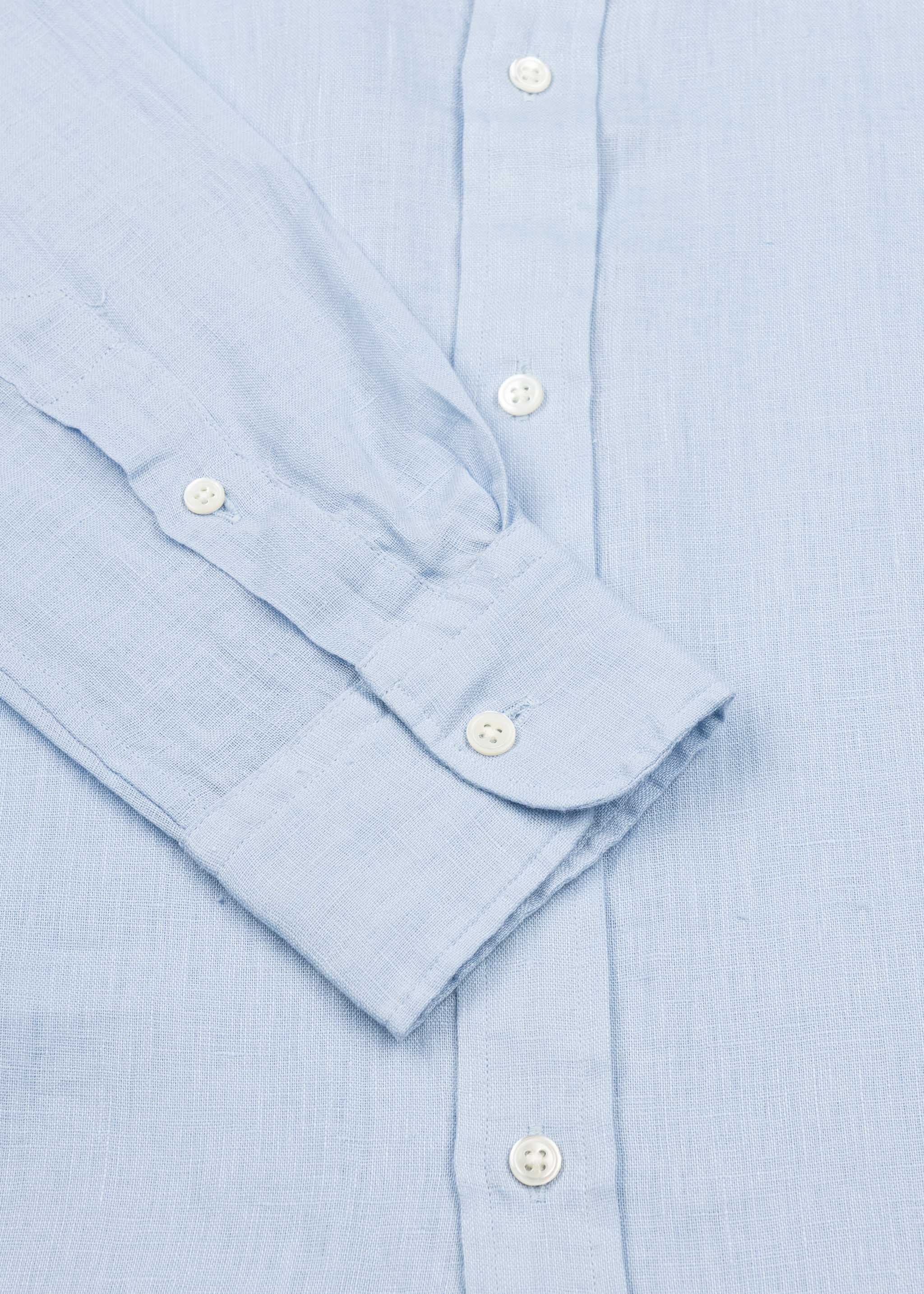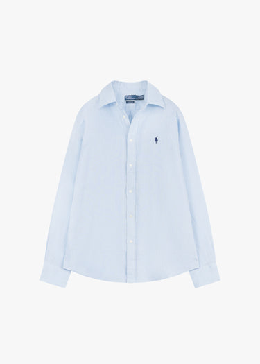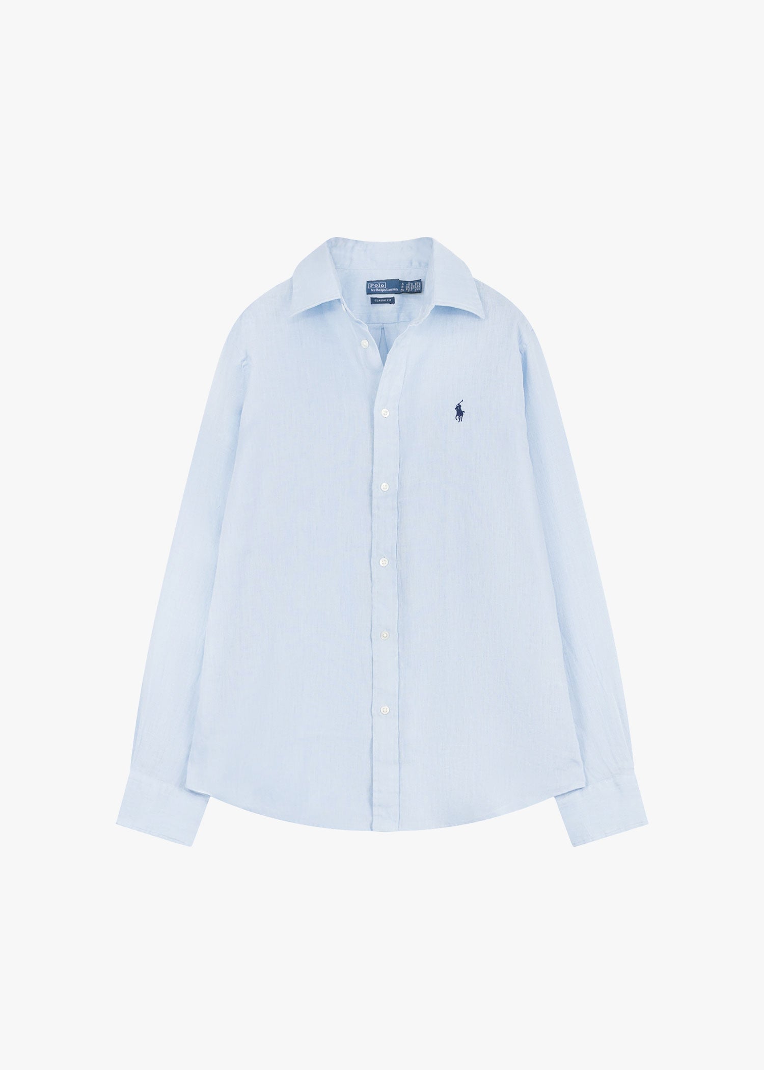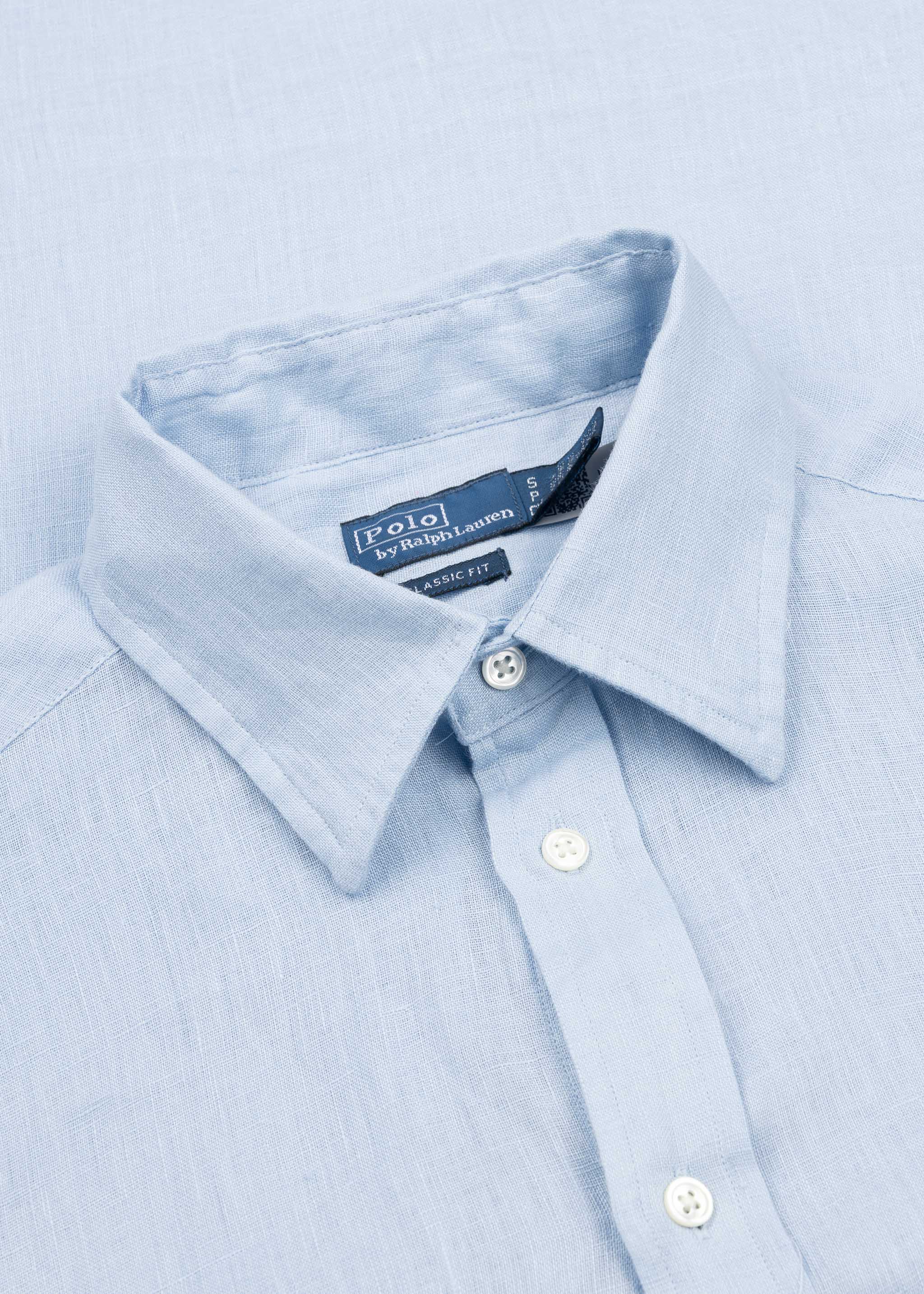Linen shirt blouse by Polo Ralph Lauren, classic collar, back yoke with pinch pleat, long sleeves with button cuffs, signature embroidered Pony logo, rounded hem.