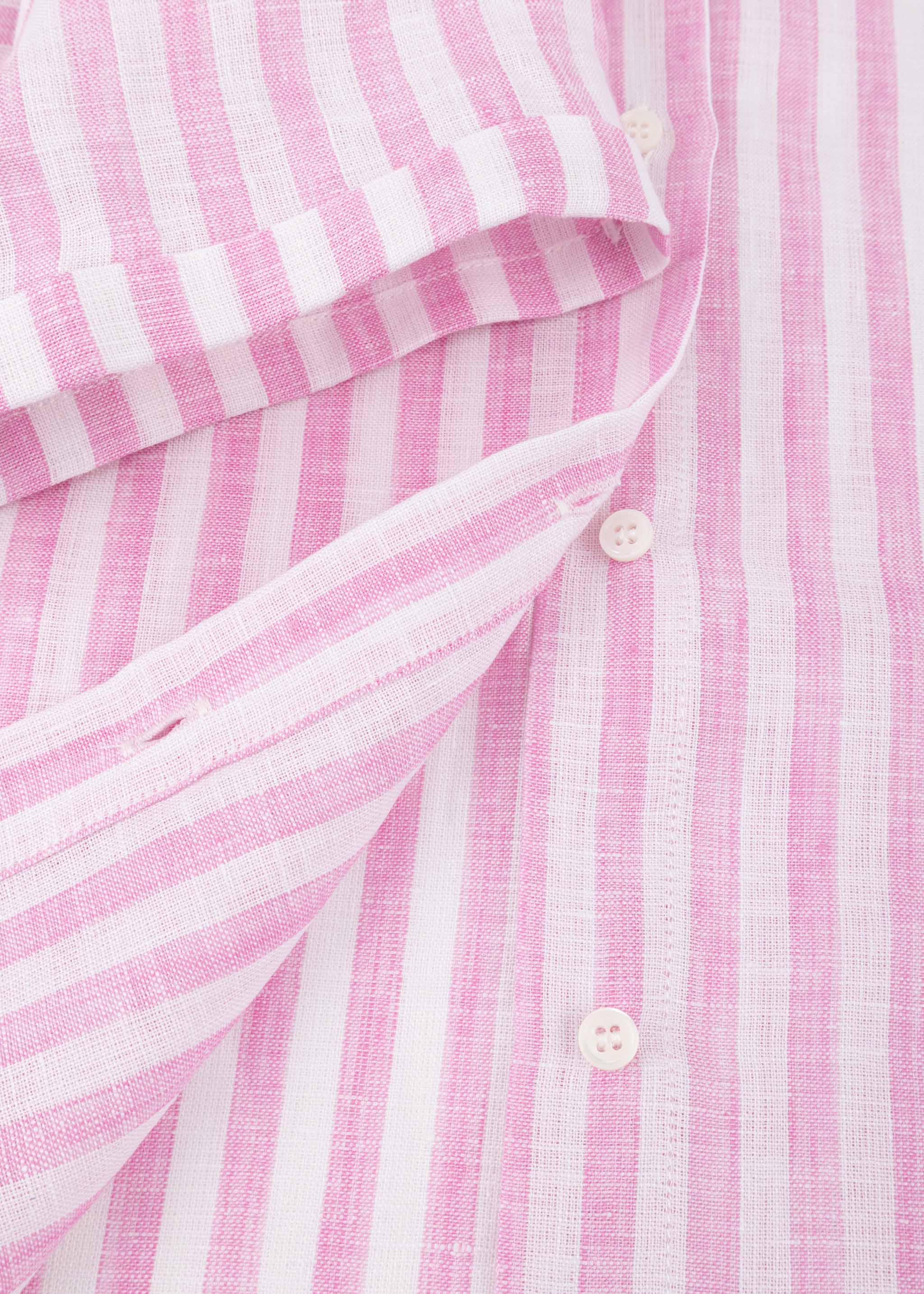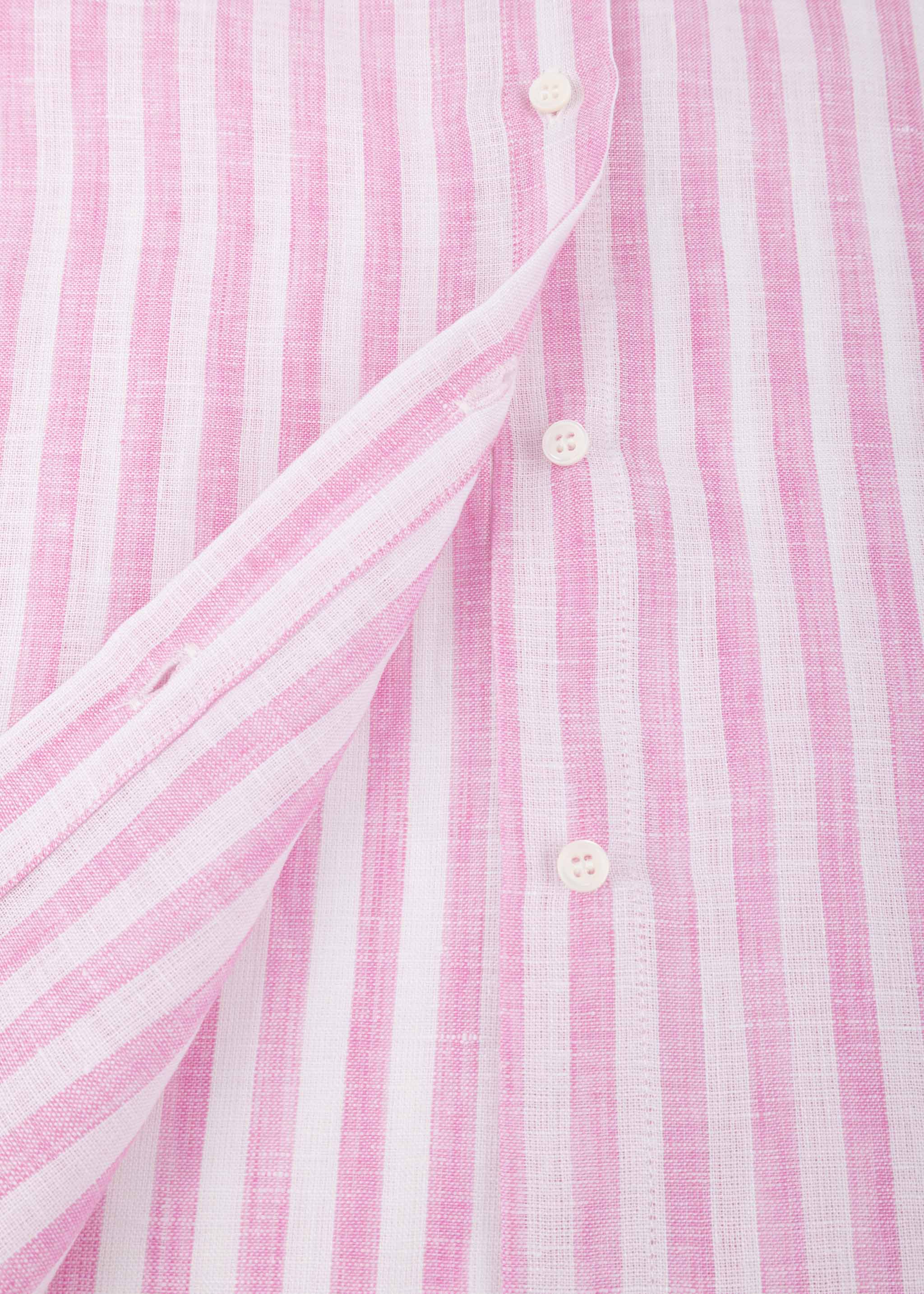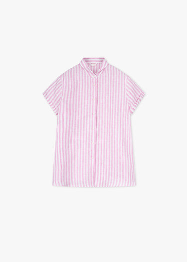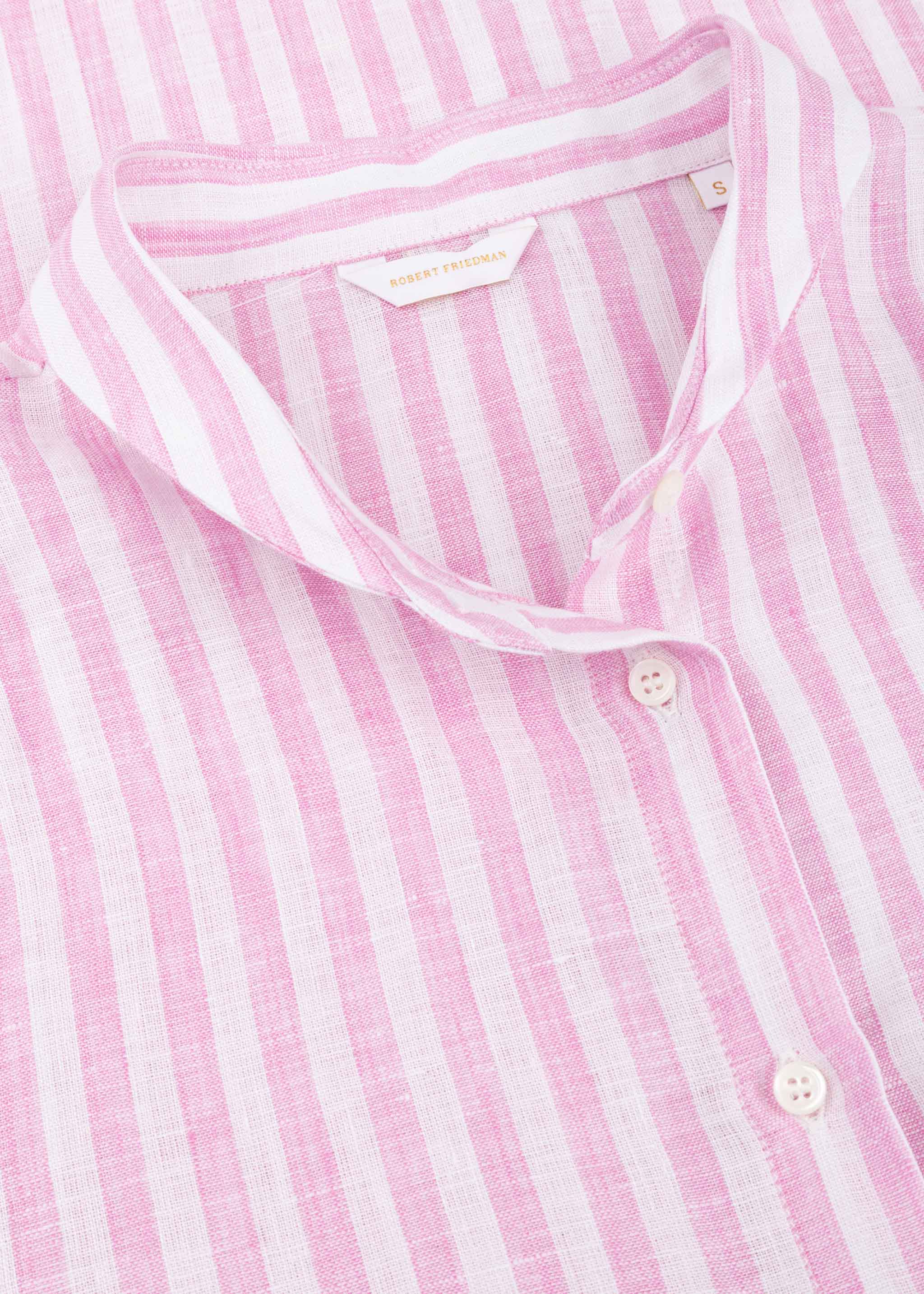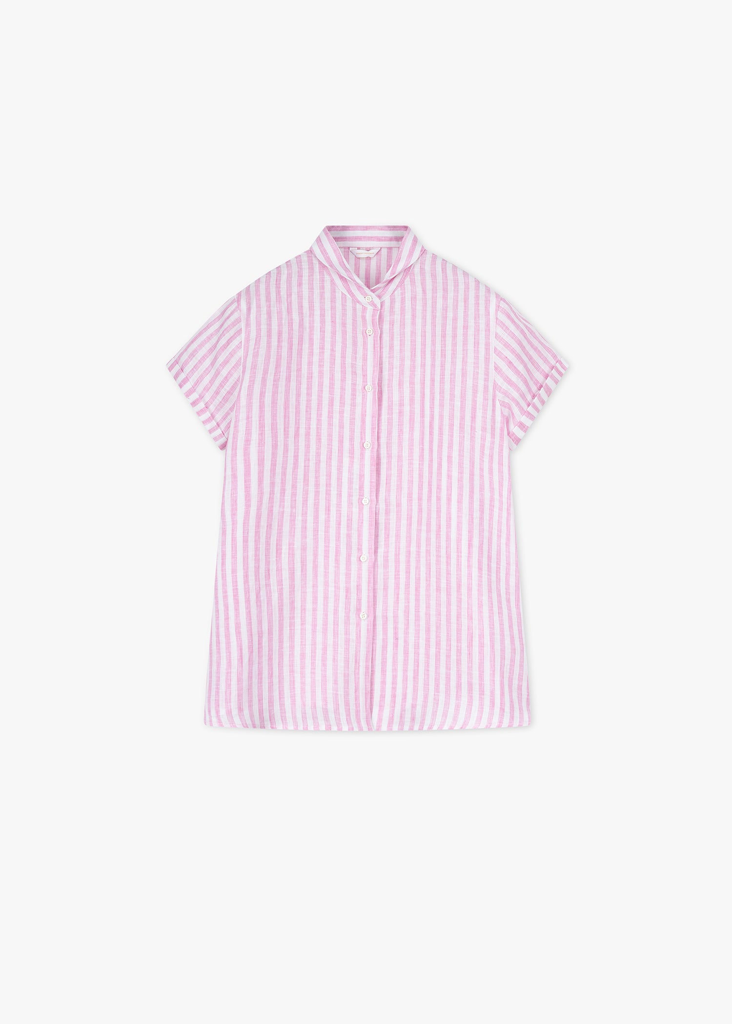 'Ara' striped blouse by Robert Friedman made of airy linen, narrow collar, short sleeves with turn-up cuffs, full-length button placket, rounded hem, smooth feel.