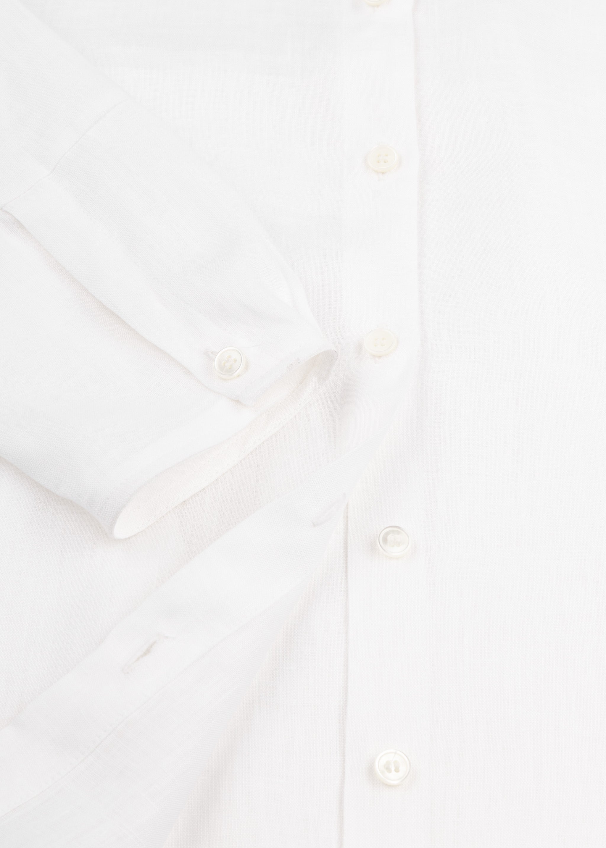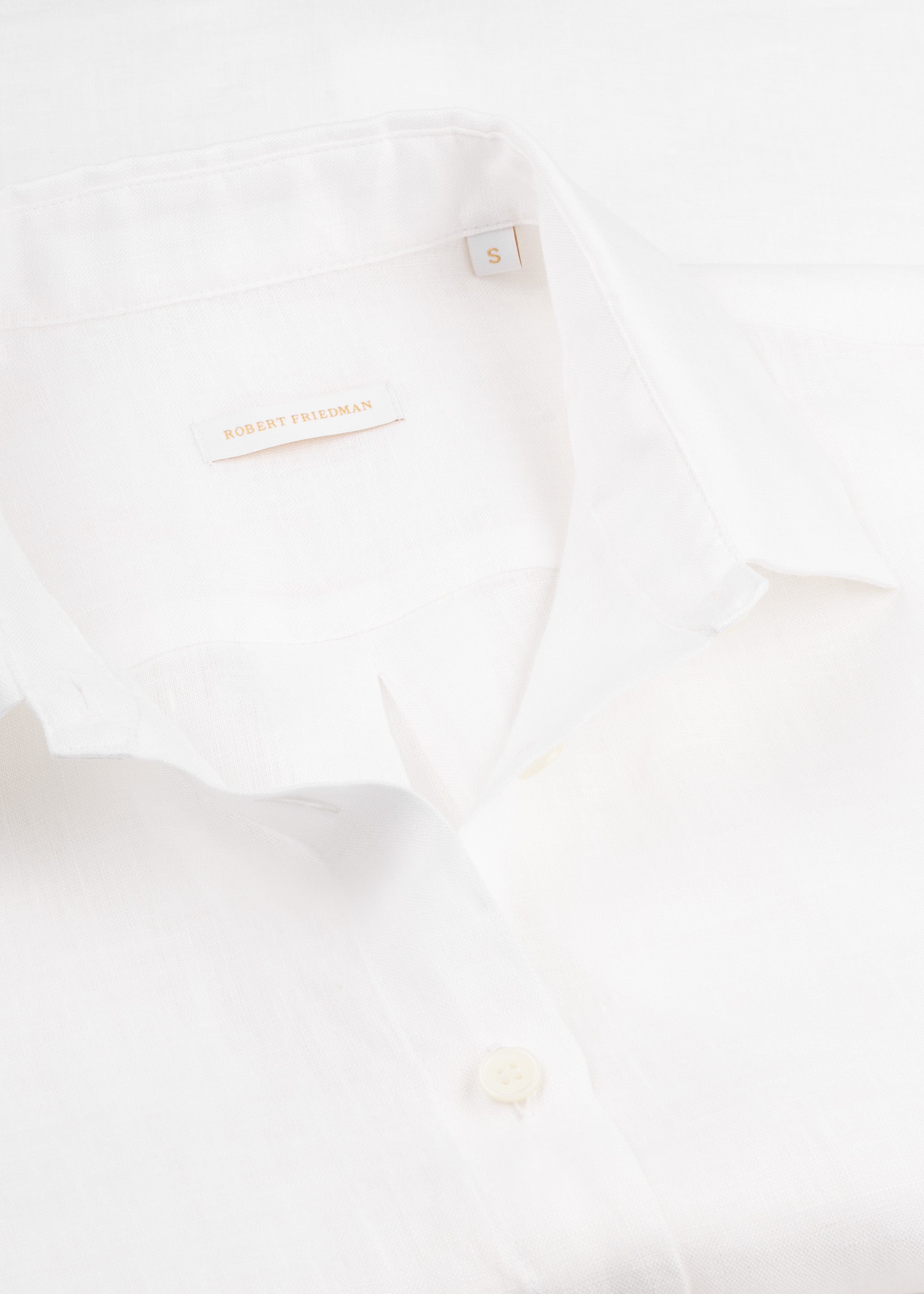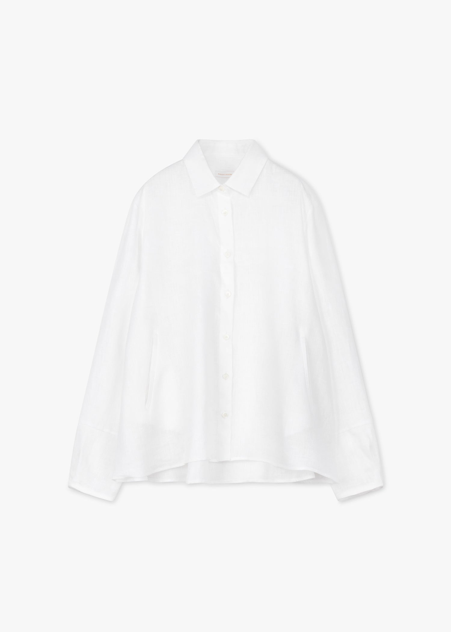 A-line blouse 'Tini' by Robert Friedman in linen, classic collar, back yoke with box pleat, button placket, long sleeves with bell hem and button, side pockets, slightly transparent, high-low hem.