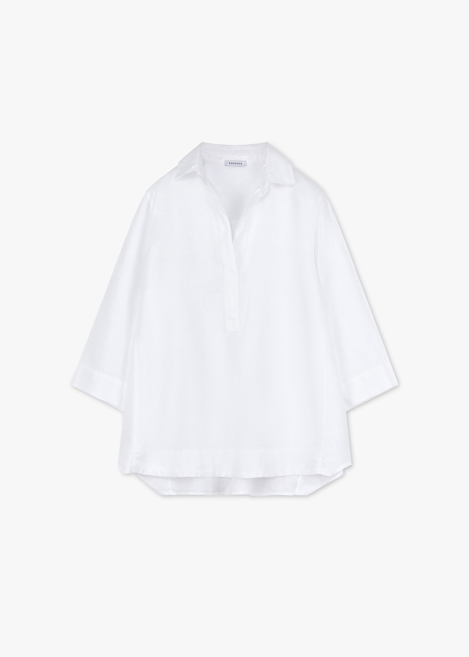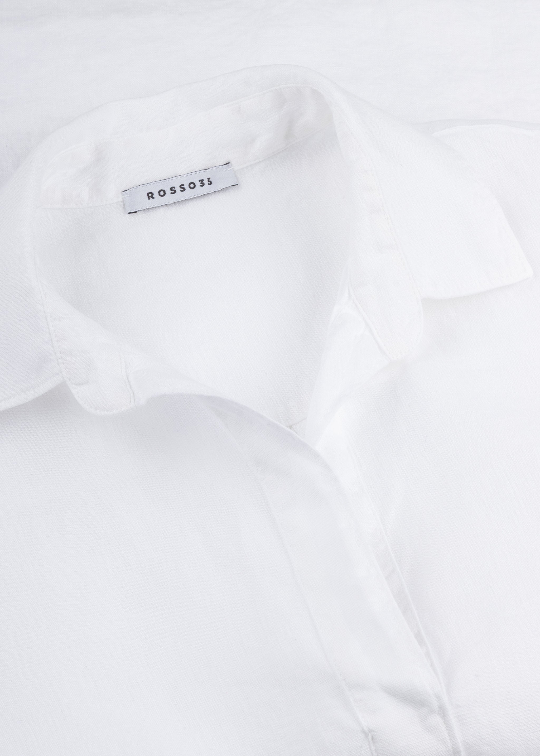 Blouse by Rosso35 made of linen, classic collar with button closure and V-neck, back yoke with box pleat, 3/4 sleeves, high-low hem.