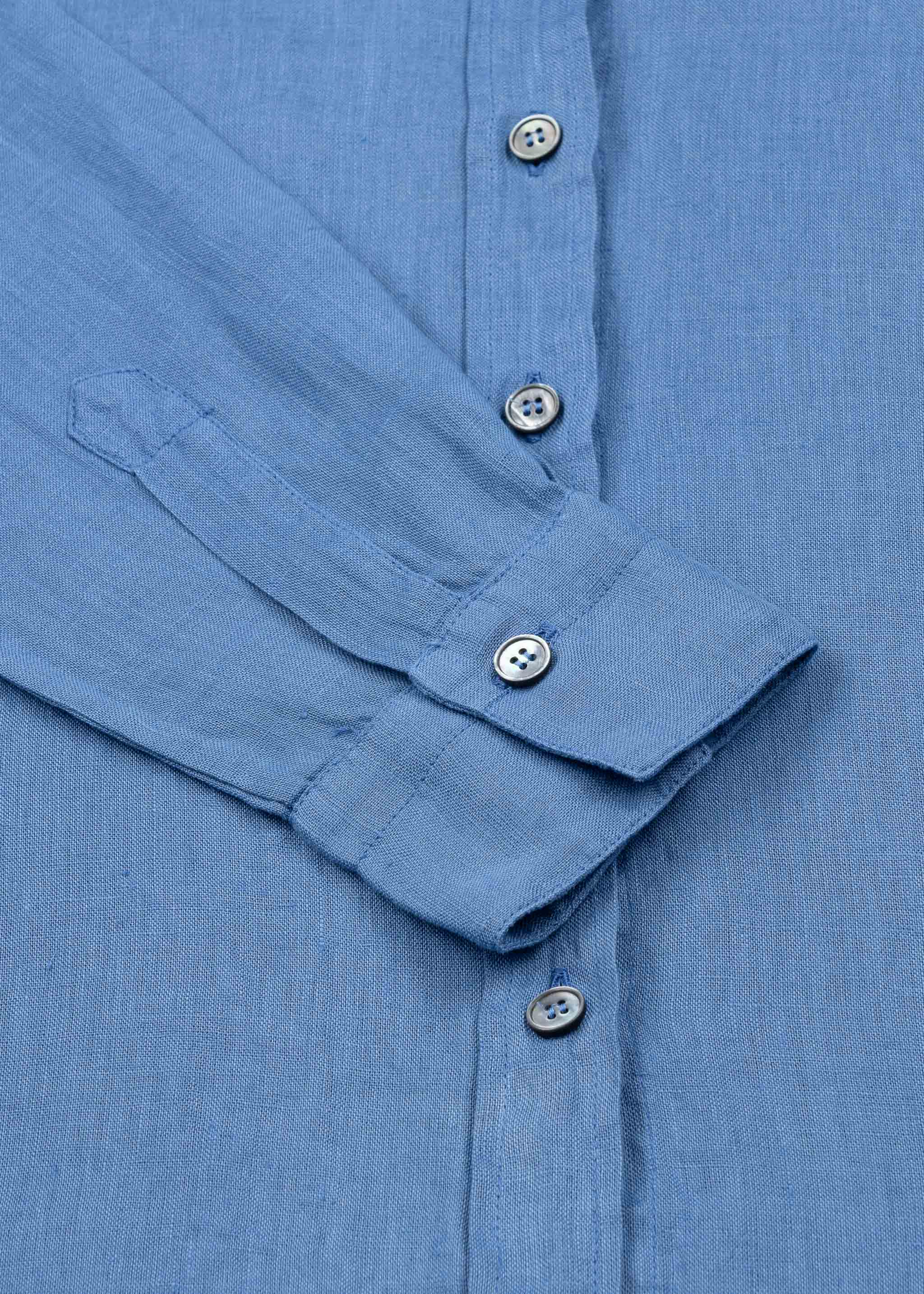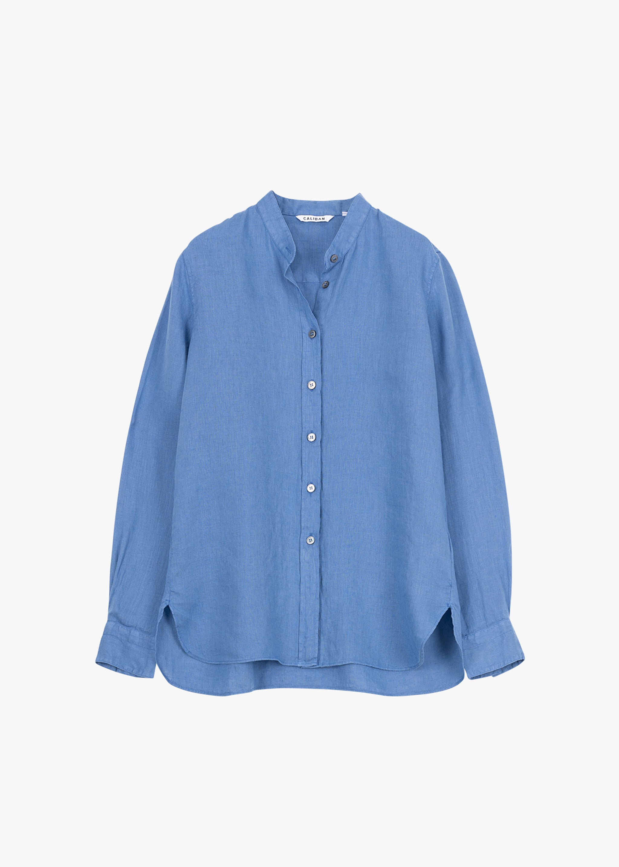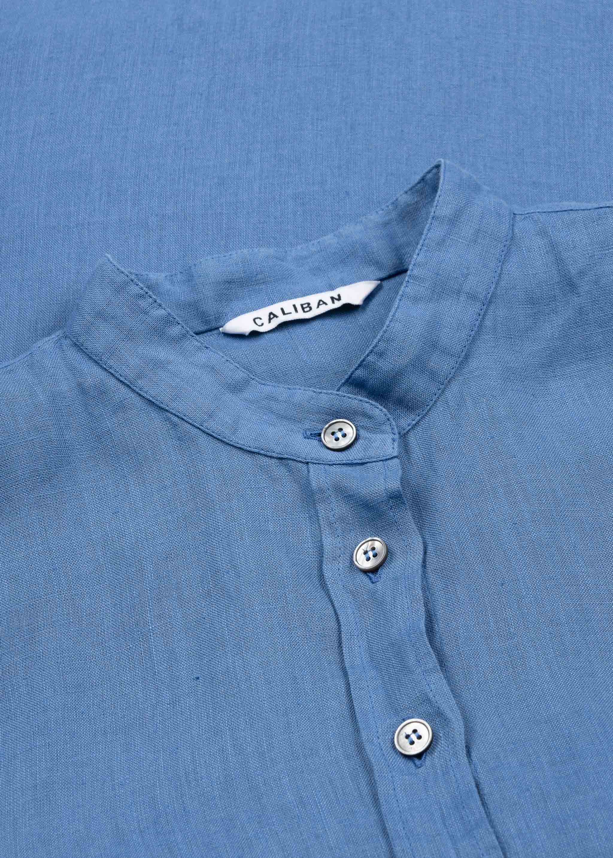 Linen blouse by Caliban, stand-up collar, back yoke, full-length mother-of-pearl button placket, sleeves with button cuffs, rounded hem.