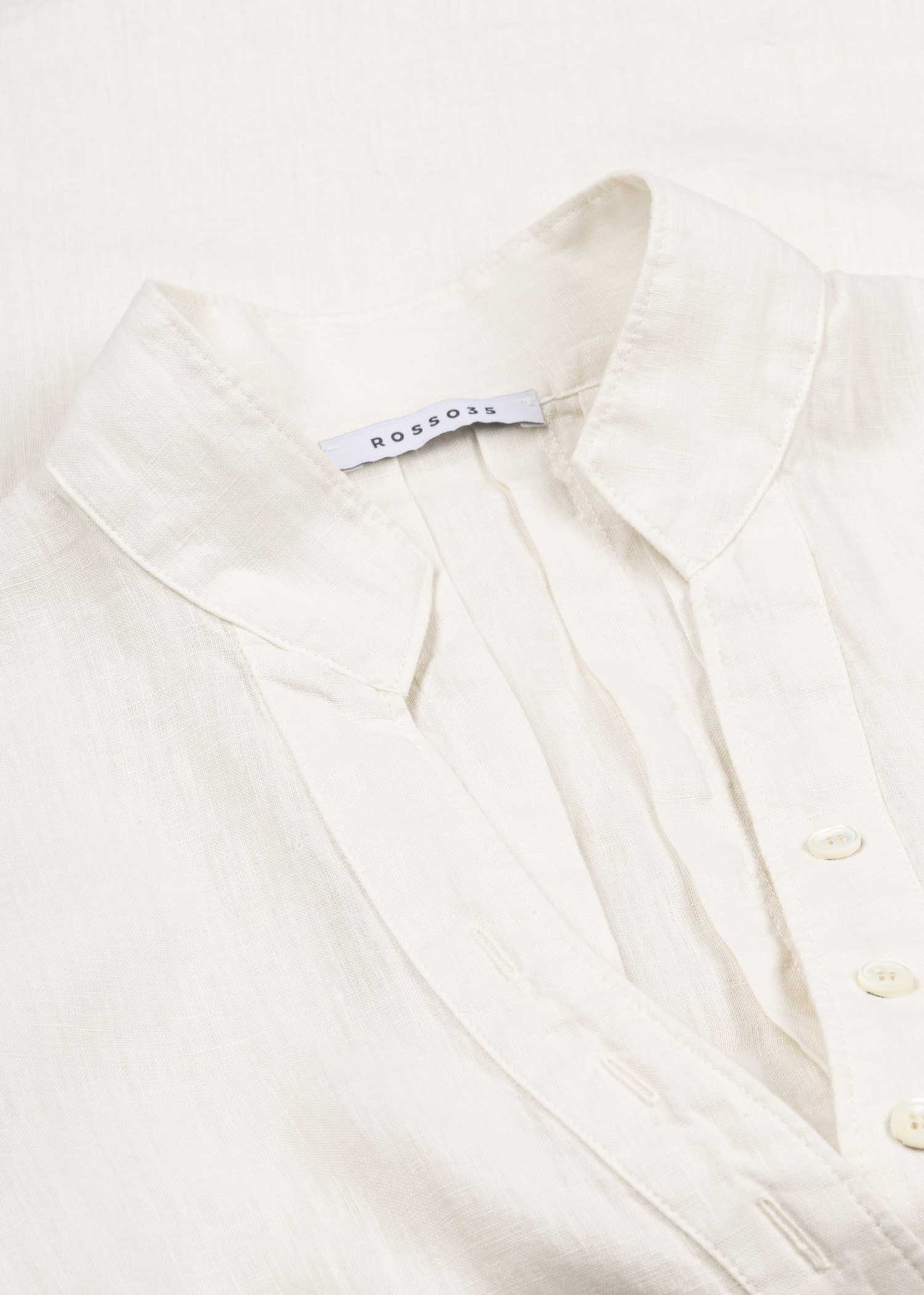 Loose blouse by Rosso35 made of linen, stand-up collar with V-neck, short button placket, 3/4 sleeves with button cuffs, pleats in the back, shortened hem at the front.