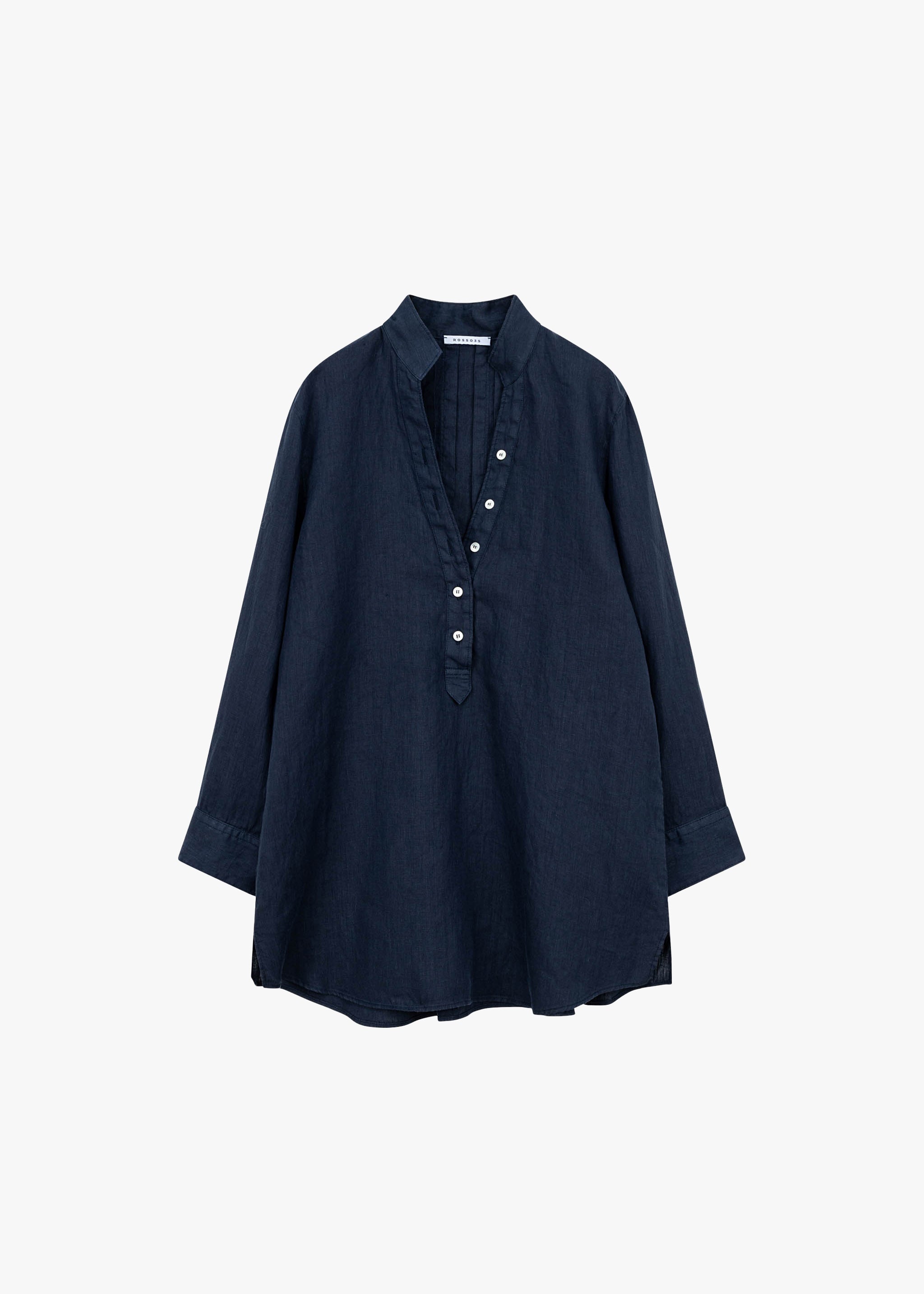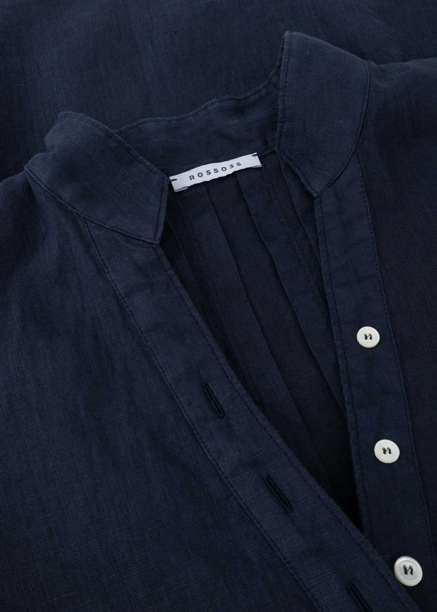 Loose blouse by Rosso35 made of linen, stand-up collar with V-neck, short button placket, 3/4 sleeves with button cuffs, pleats in the back, shortened hem at the front.