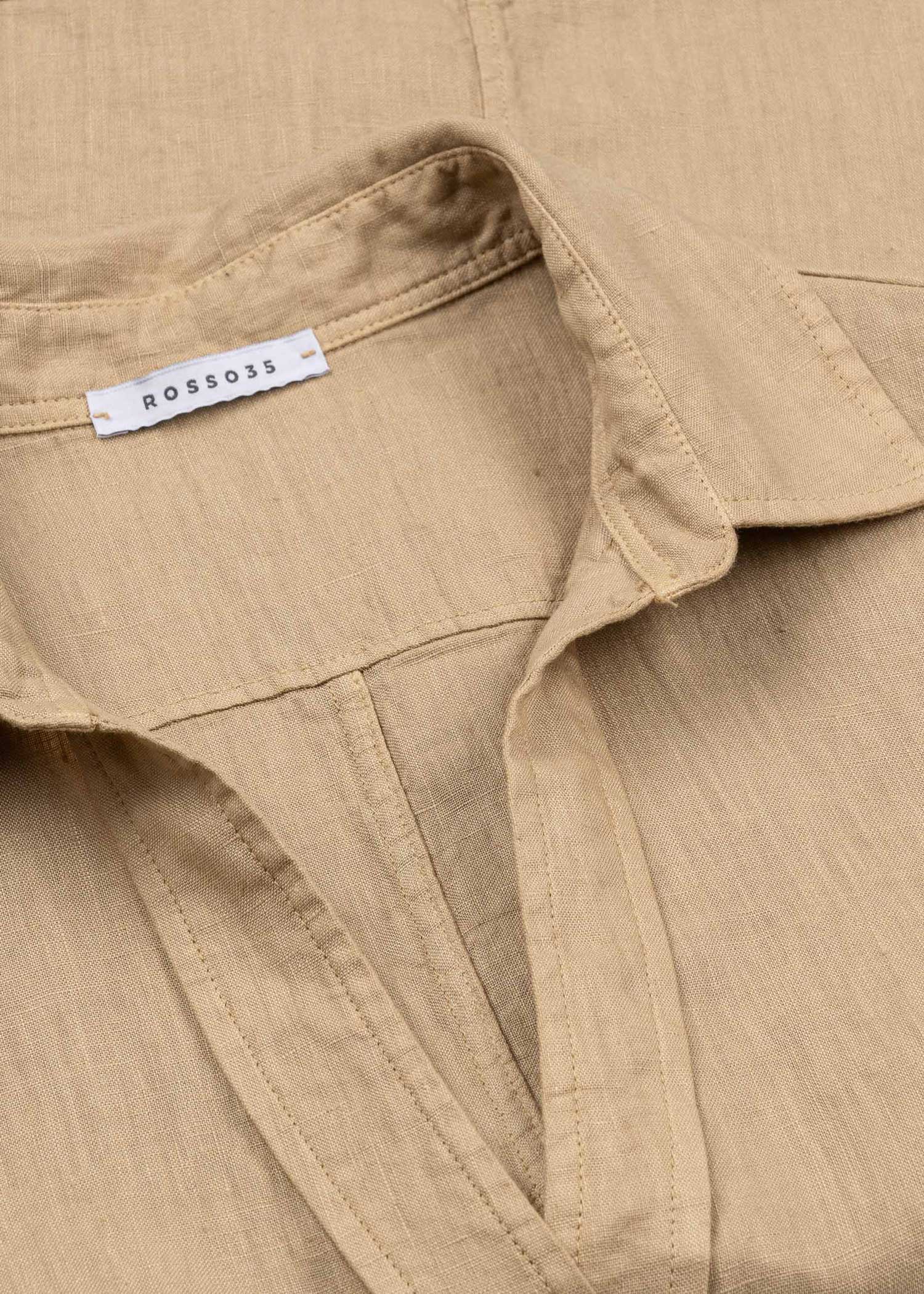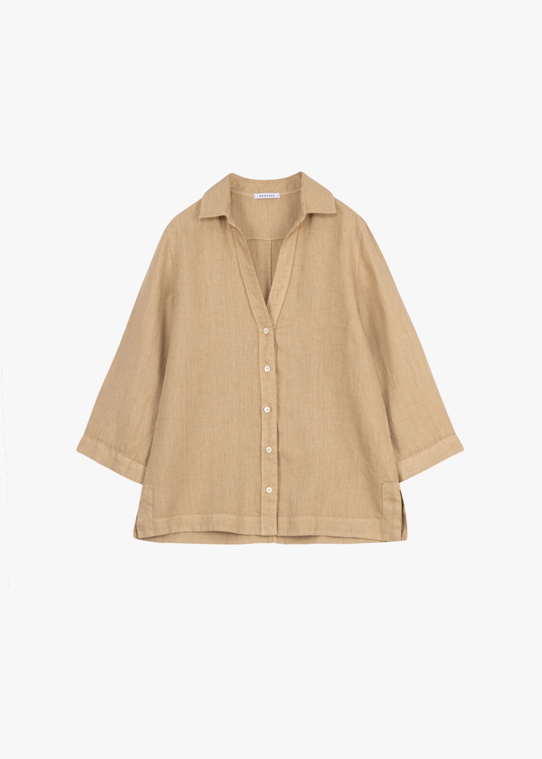 Blouse by Rosso35 made of linen, classic collar with V-neck, full-length button placket, 3/4 sleeves with button cuffs, back yoke, straight hem.