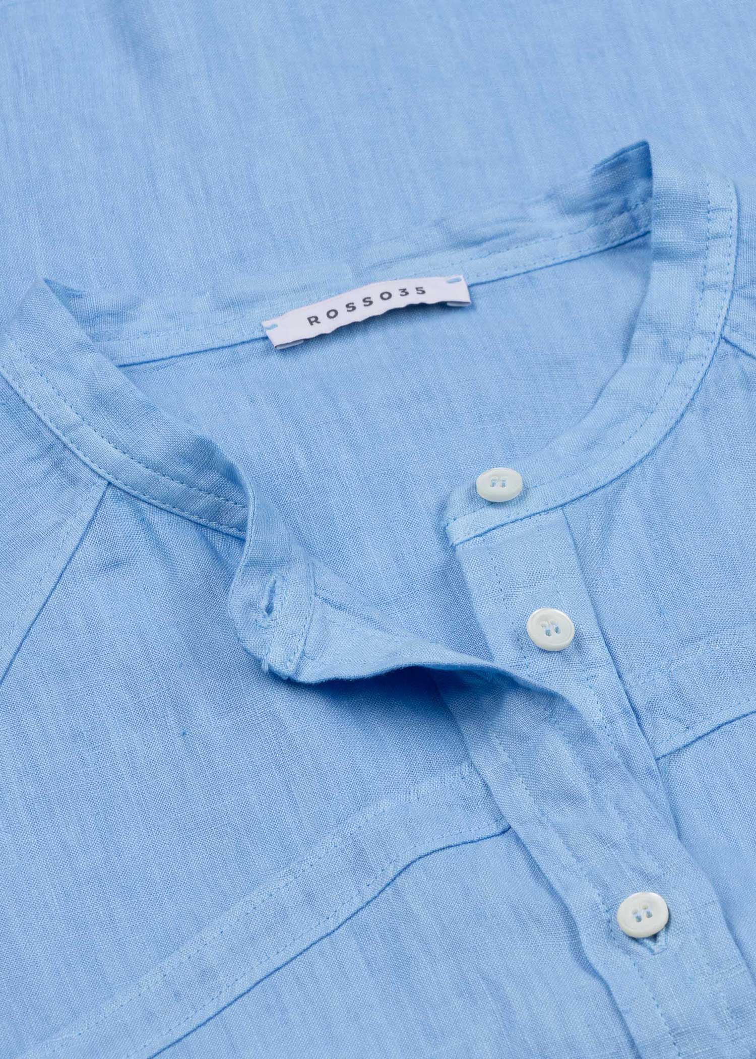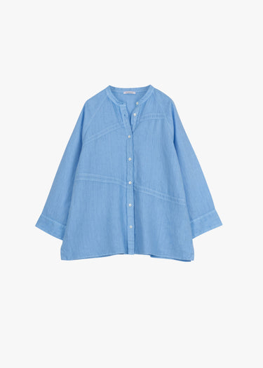Relaxed blouse by Rosso35 made of linen, stand-up collar, full-length button placket, 3/4 raglan sleeves with button cuffs, asymmetric decorative seams, straight hem with side slits.