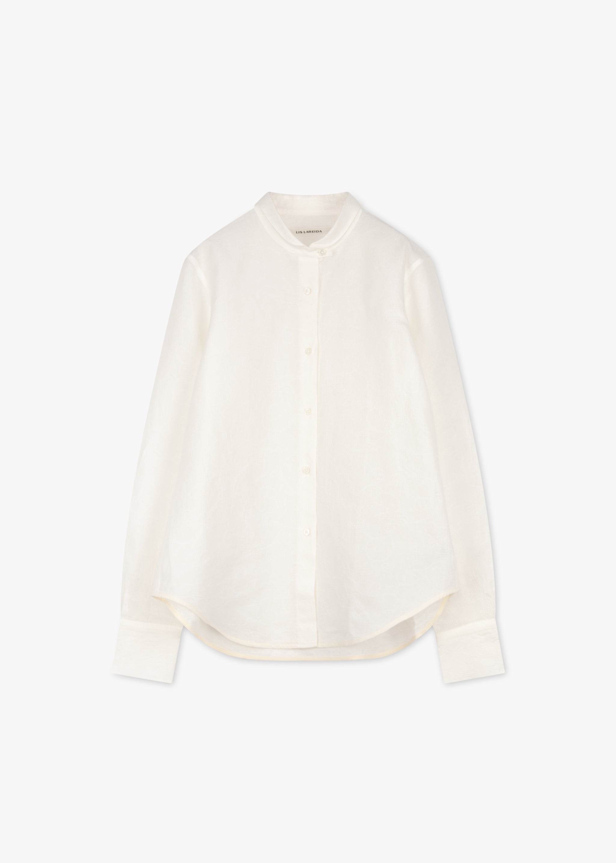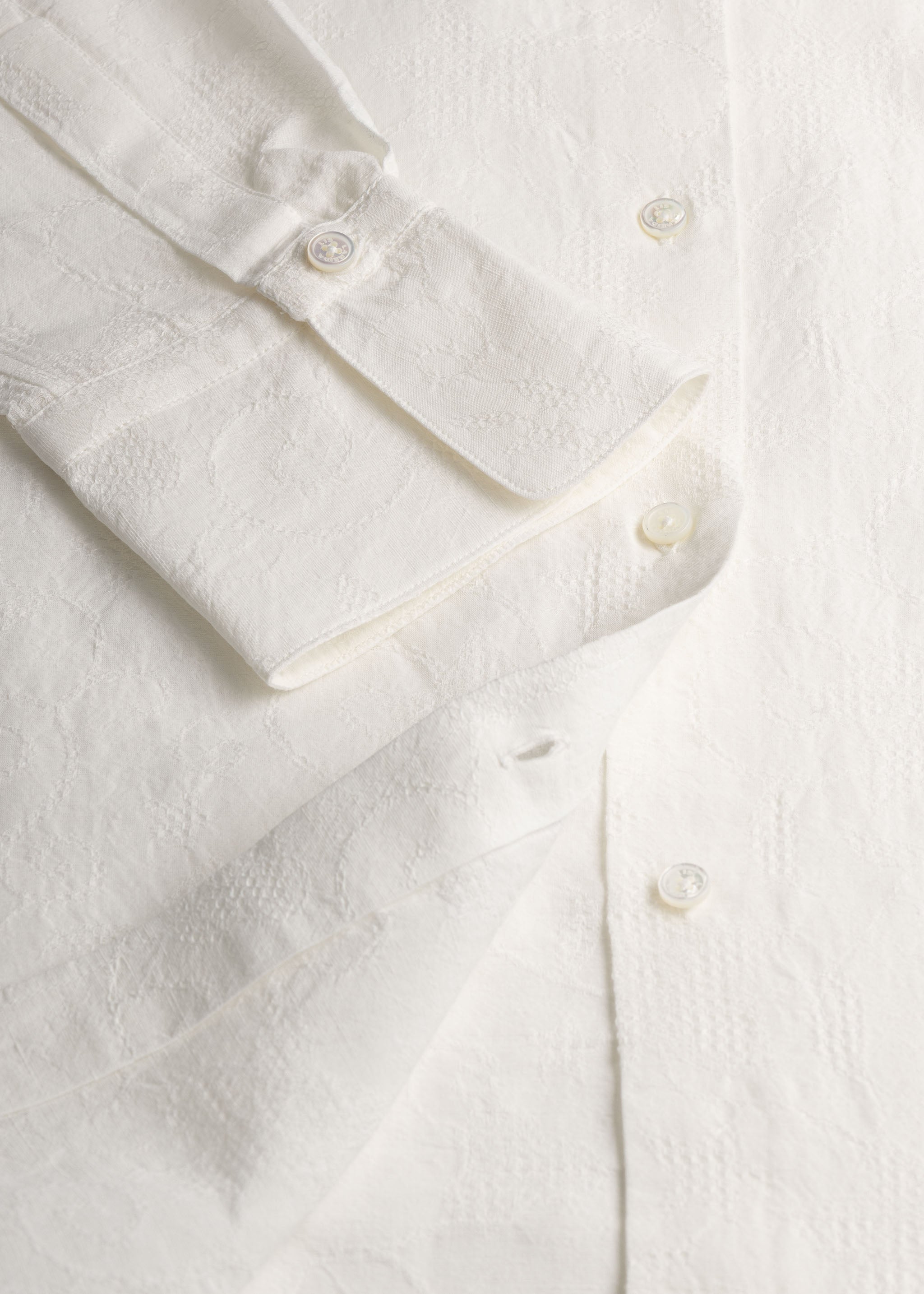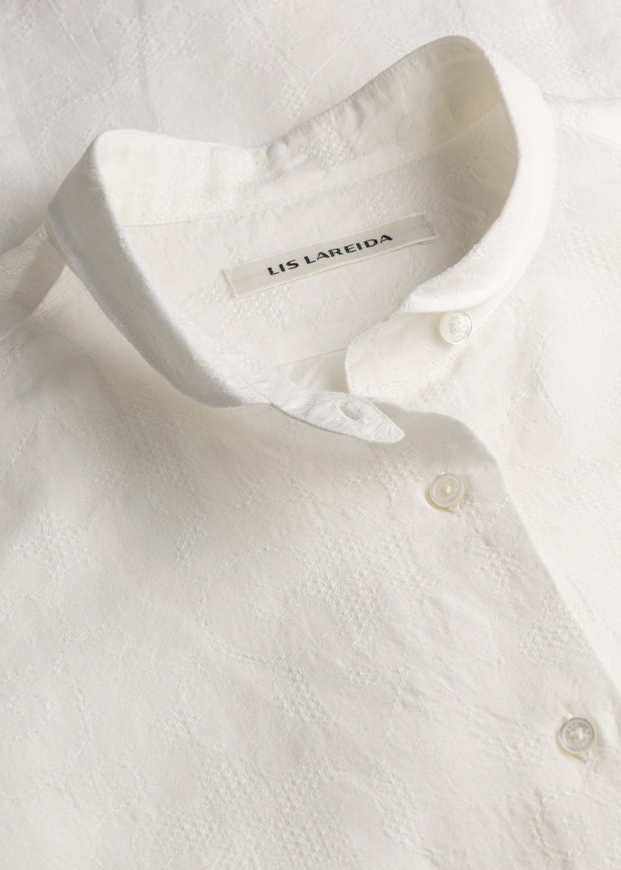 Patterned blouse 'Dalicia' by Lis Lareida, subtle boy collar, back yoke with box pleat, full button placket, sleeves with button cuffs, rounded hem.