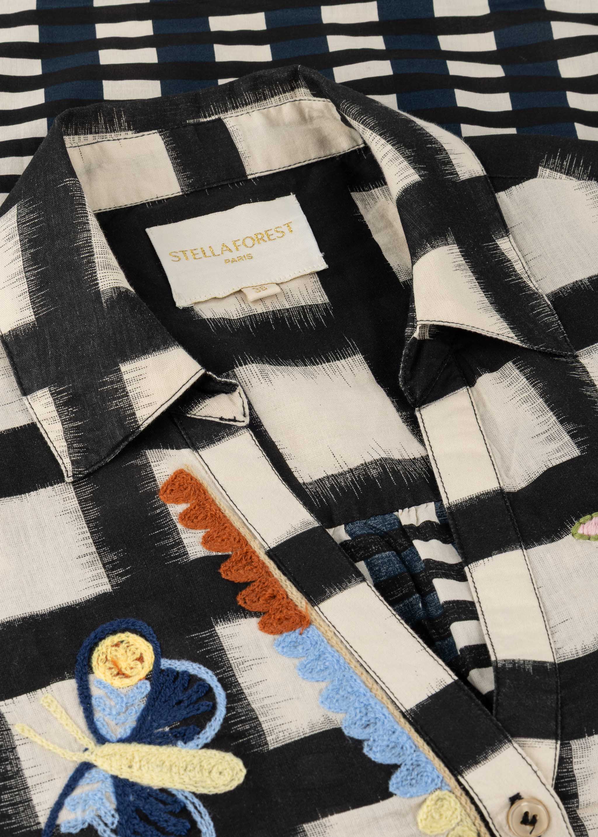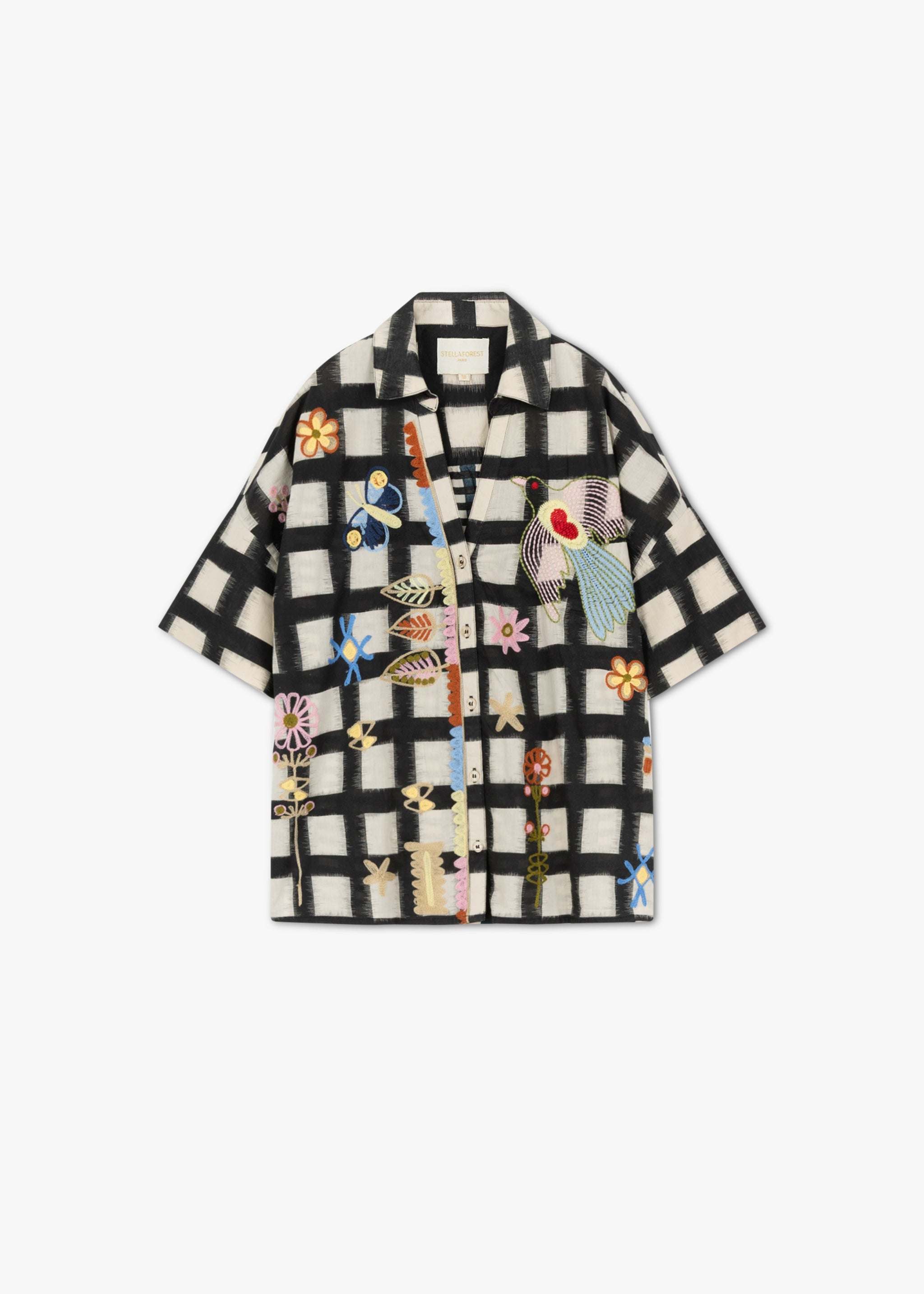 Loose-fitting 'Flora' shirt blouse by Stella Forest with embroidery, classic V-neck collar, back yoke with pleats, dropped shoulders, button placket, straight hem, soft feel.