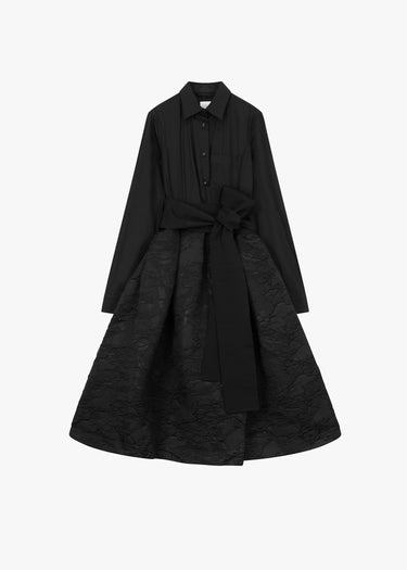 Shirt dress by Sara Roka, patterned skirt with two side pockets, asymmetric closure, classic collar, left patch pocket, full button placket, long sleeves with one button each, removable sash and midi length.