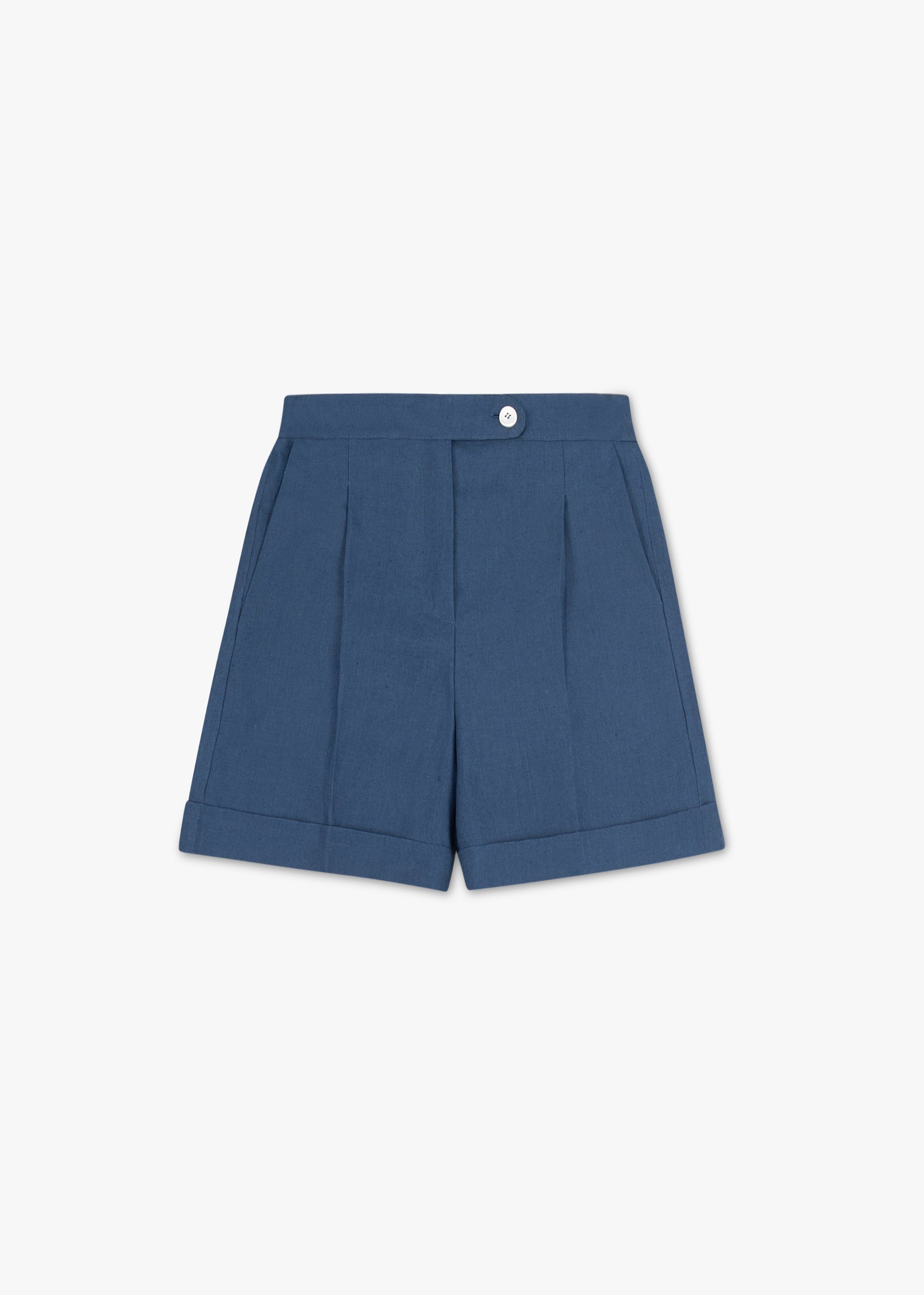 'Bermudini' shorts by Pialea, closes with button and zipper, waistband and pressed creases, waist darts at the back waistband, side pockets, one small back pocket, hem with turn-up.