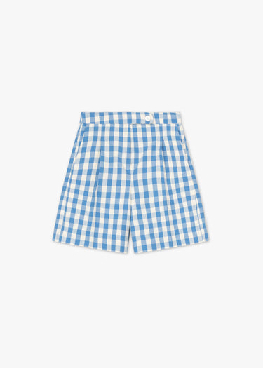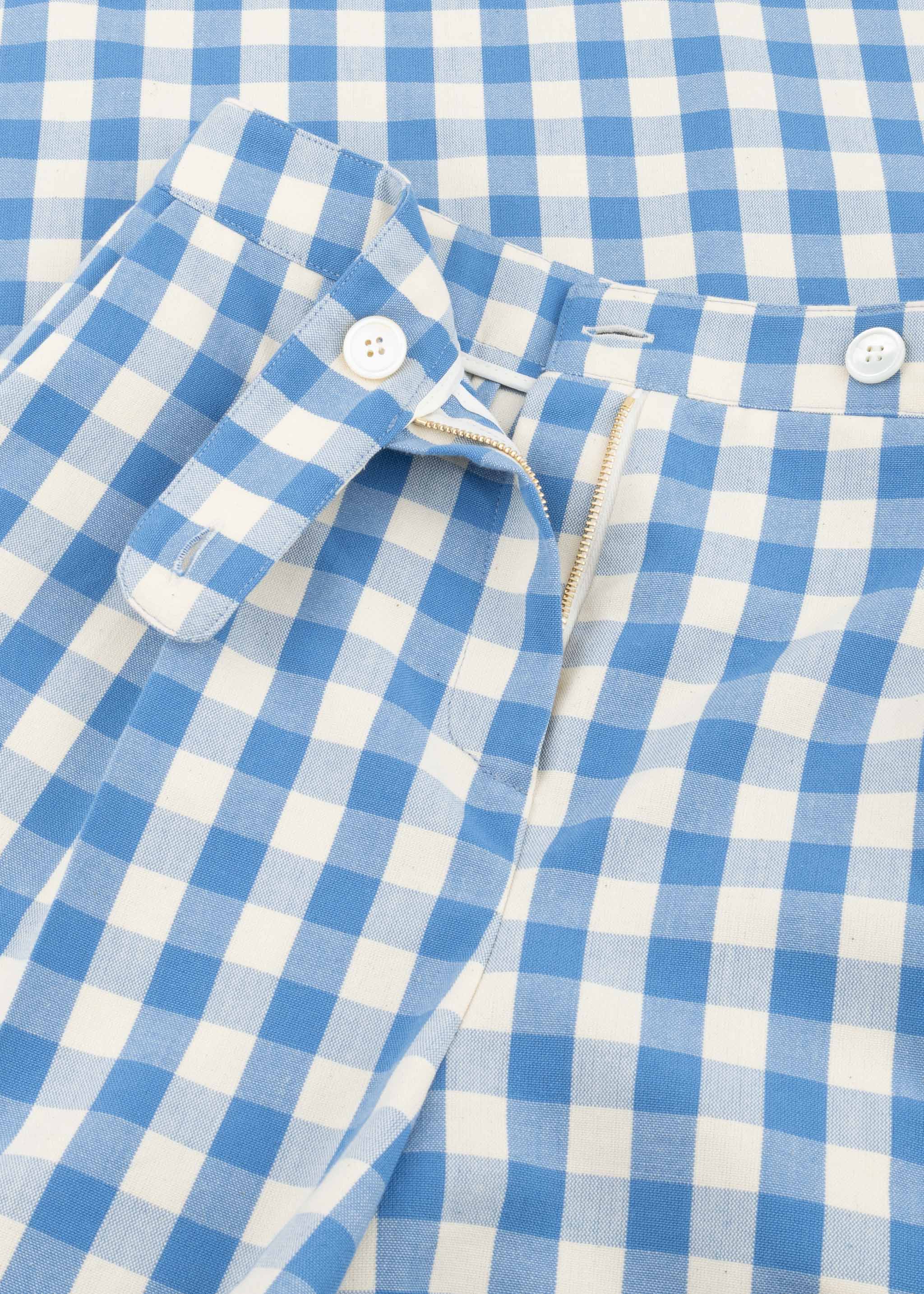 Checkered 'Bermudini' shorts by Pialea, closes with button and zipper, waistband and pressed creases, waist darts at the back waistband, side pockets, one small back pocket, hem with turn-up.