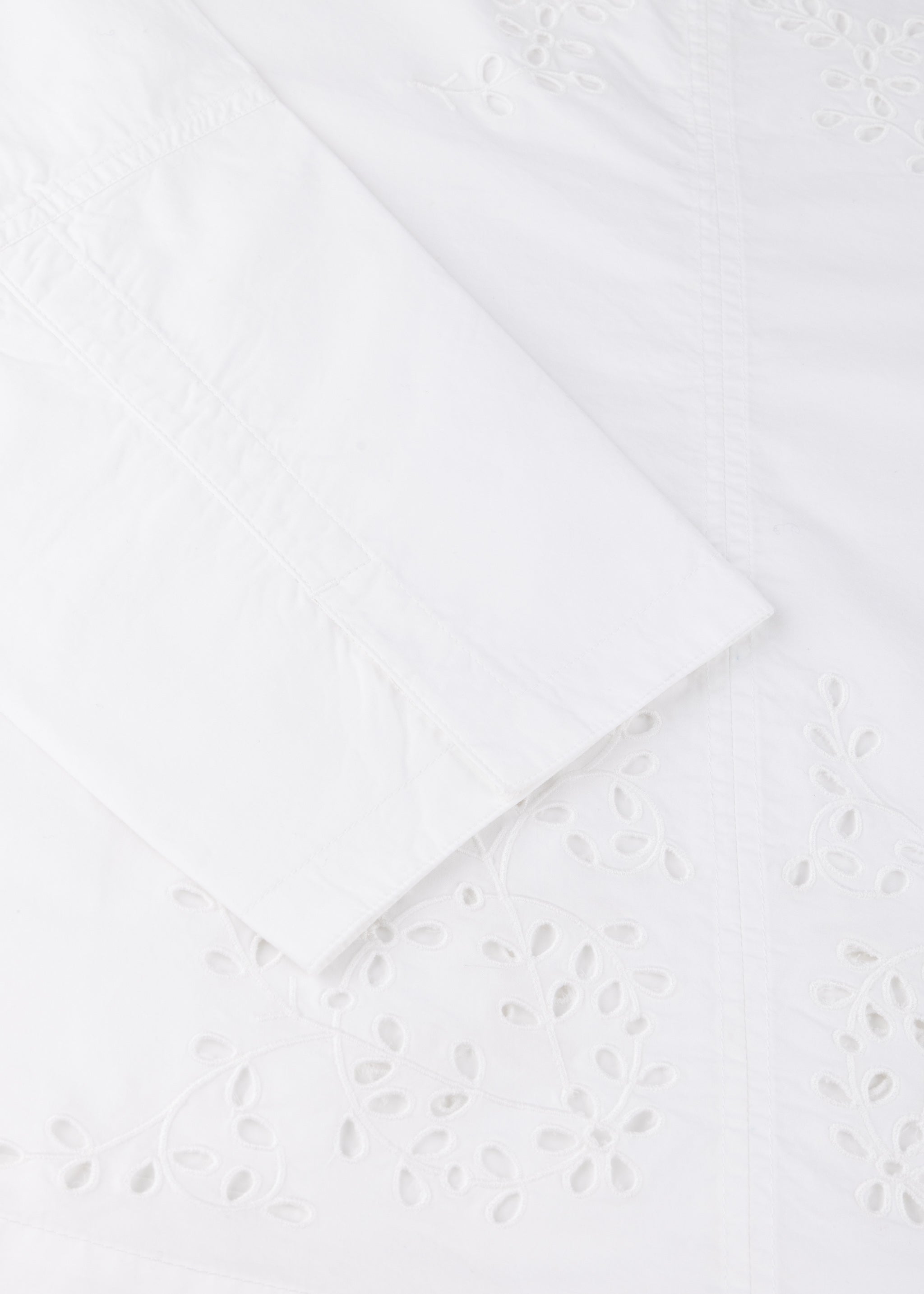 Hip-length blouse 'Hansel' by Soeur made of fine cotton with eyelet embroidery, round neckline with teardrop closure, long kimono sleeves with wide cuffs and slit, boxy and wide cut, intended to be worn shapeless, straight hem, fine material, slightly transparent.
