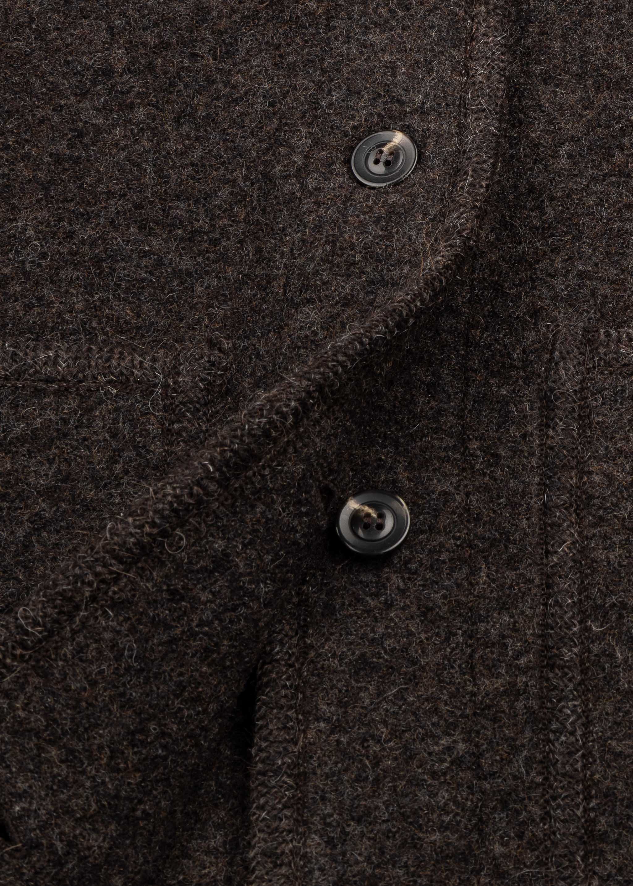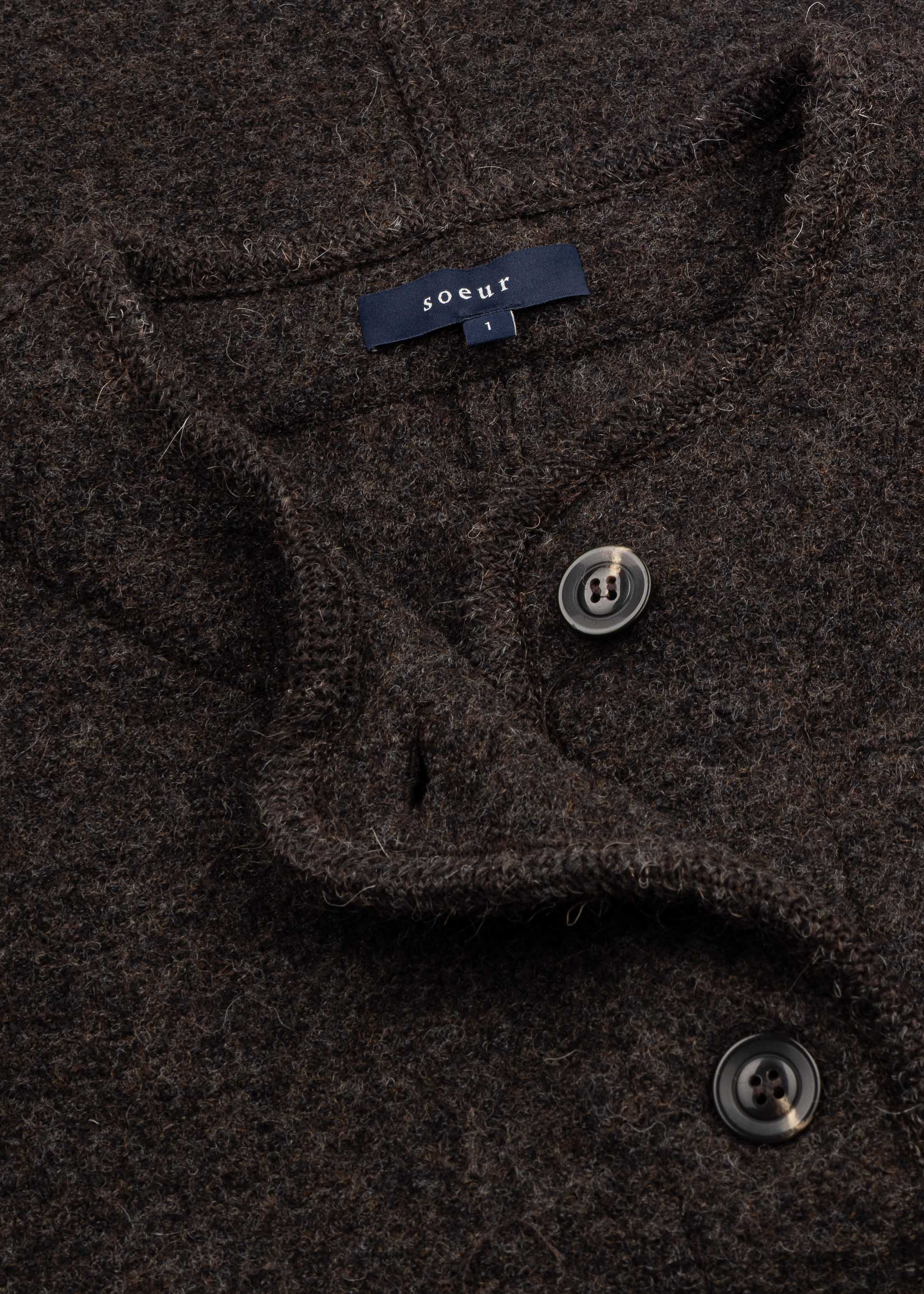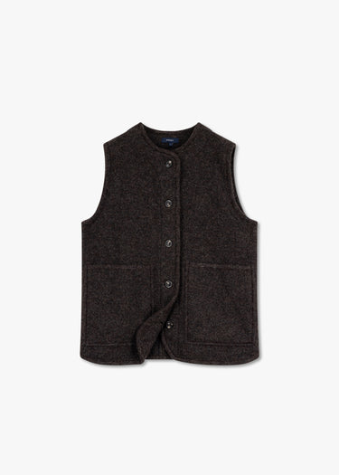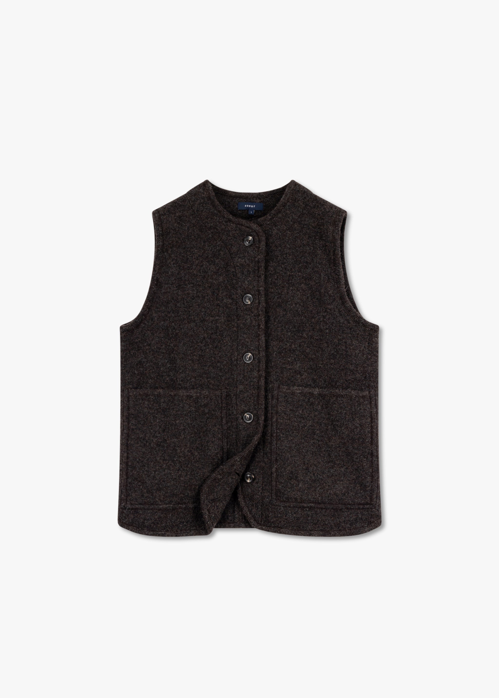 Loose-fitting 'Chicago' gilet by Soeur made of boiled virgin wool, featuring a round neck, button placket, two patch pockets, a rounded hem at the front, and an unlined finish.