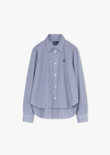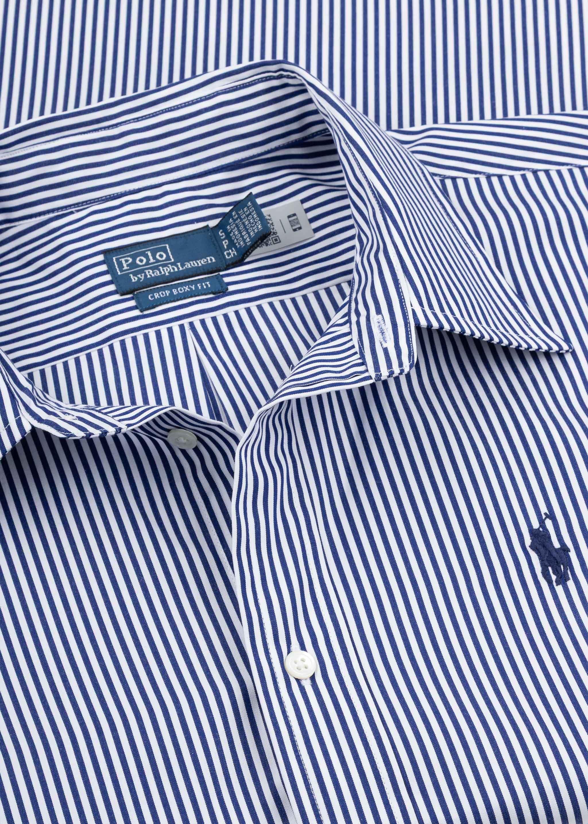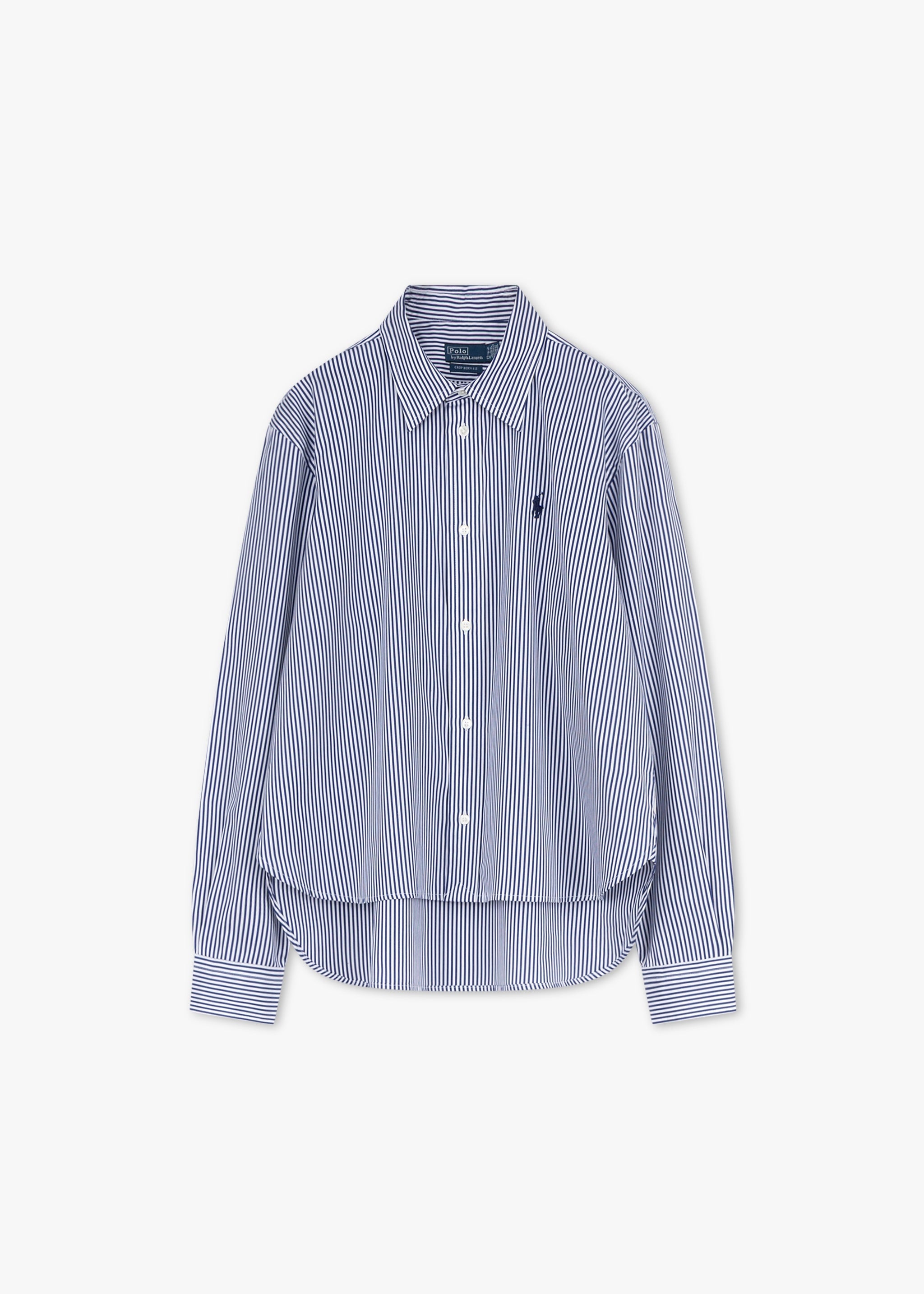 Loose-fitting blouse by Polo Ralph Lauren, classic collar, back yoke with box pleat, full button placket, slightly dropped shoulders, long sleeves with buttoned cuffs, embroidered pony logo, high-low hem.