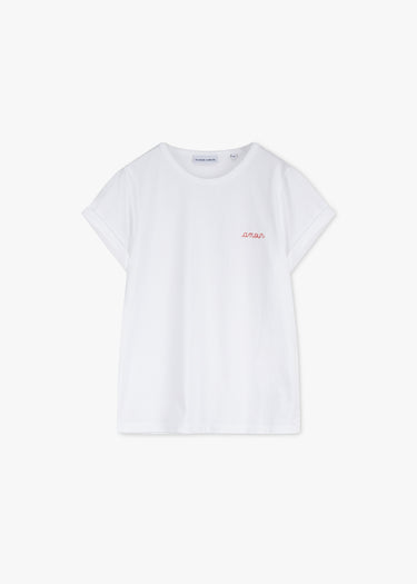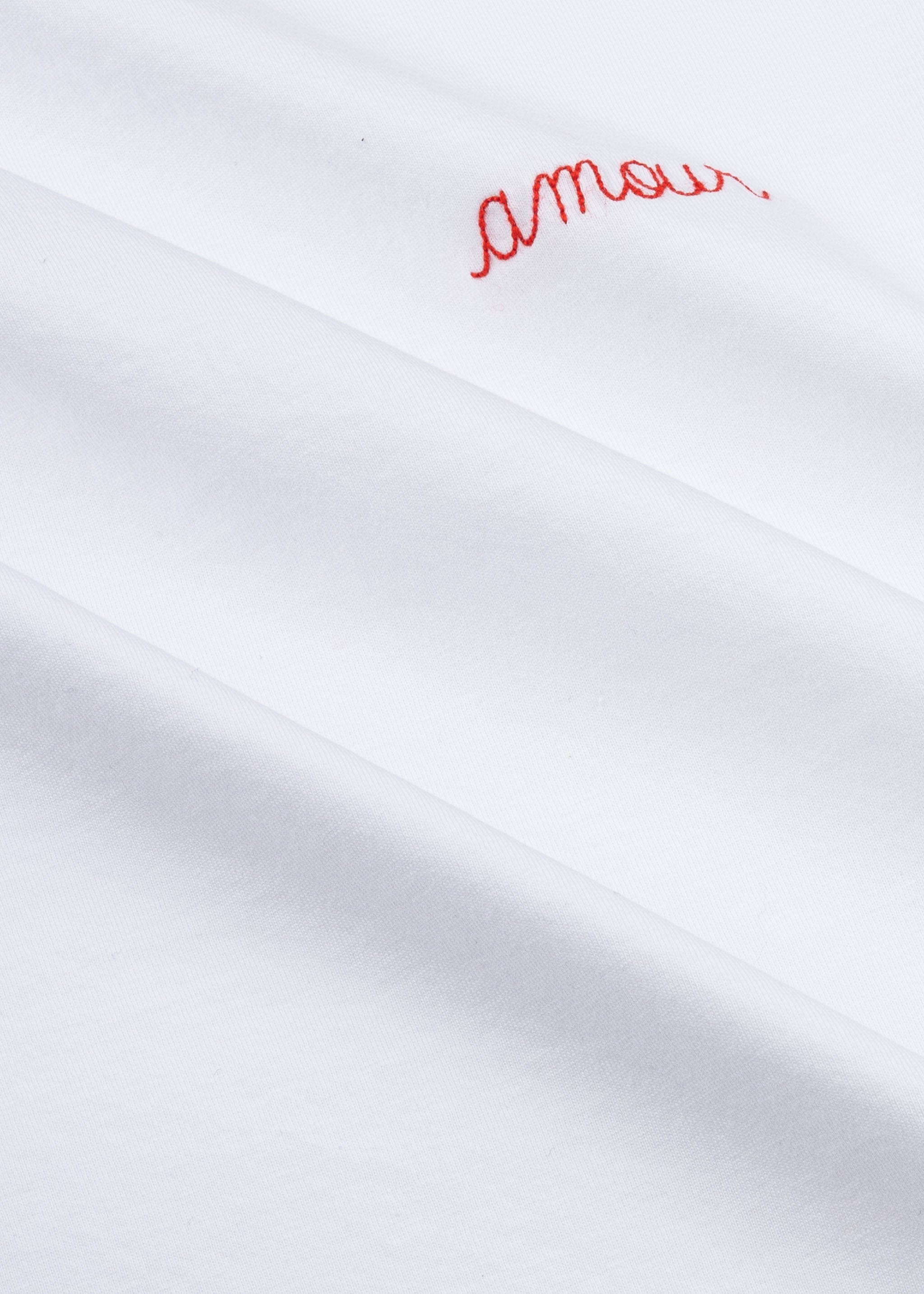 Shirt 'Poitou' by Maison Labiche, ribbed round neck, short sleeves with turn-up, 'Amour' embroidery, straight hem.