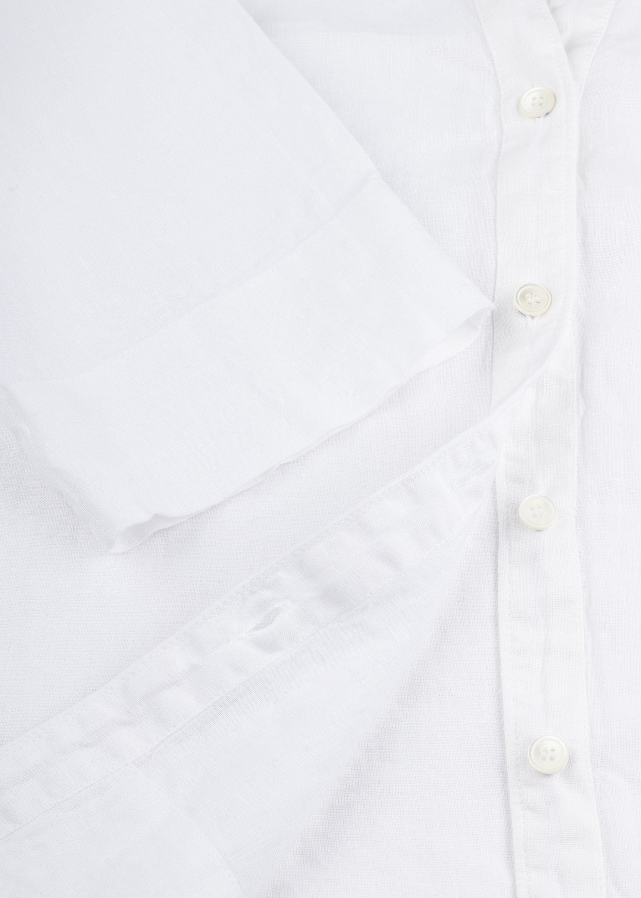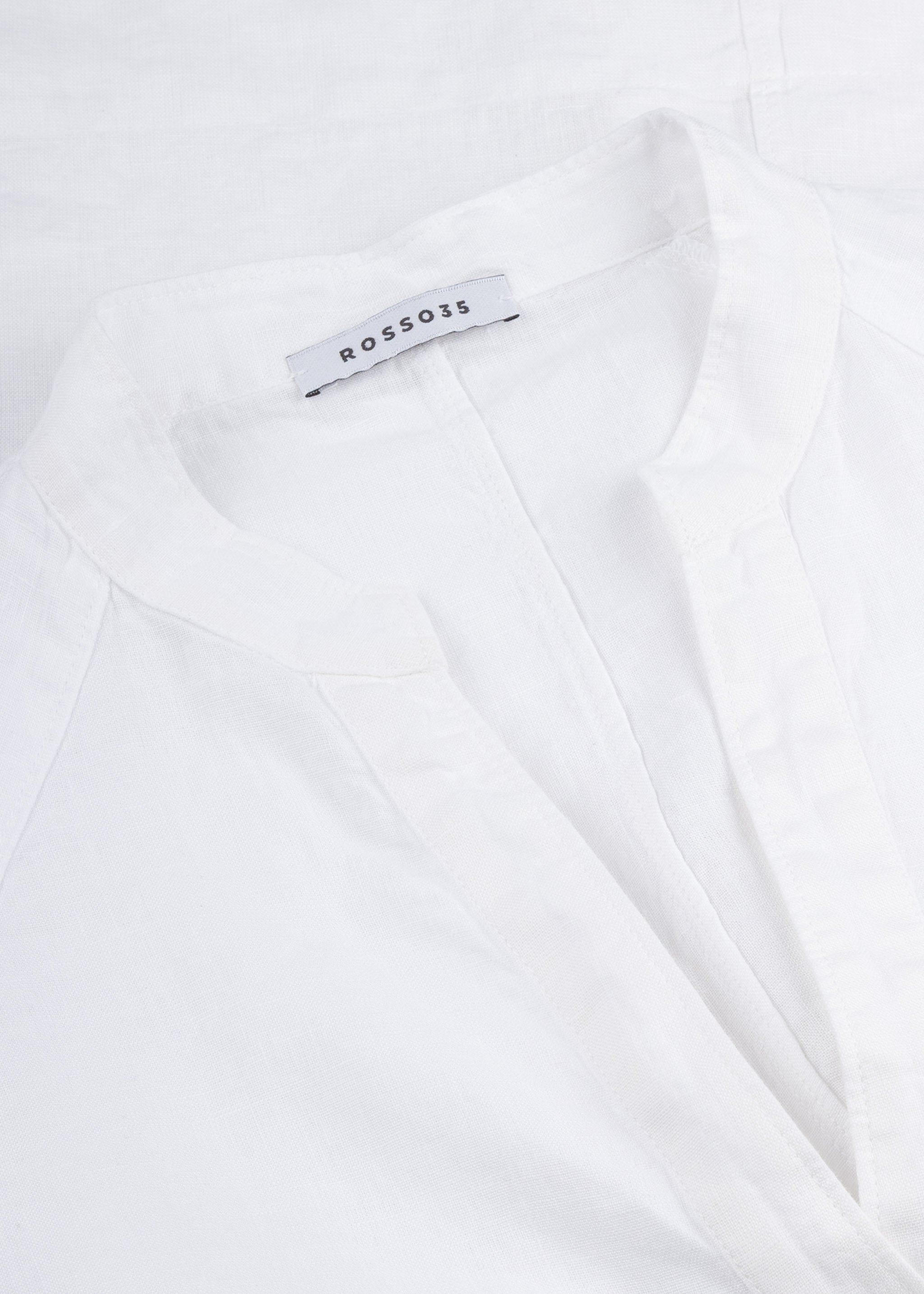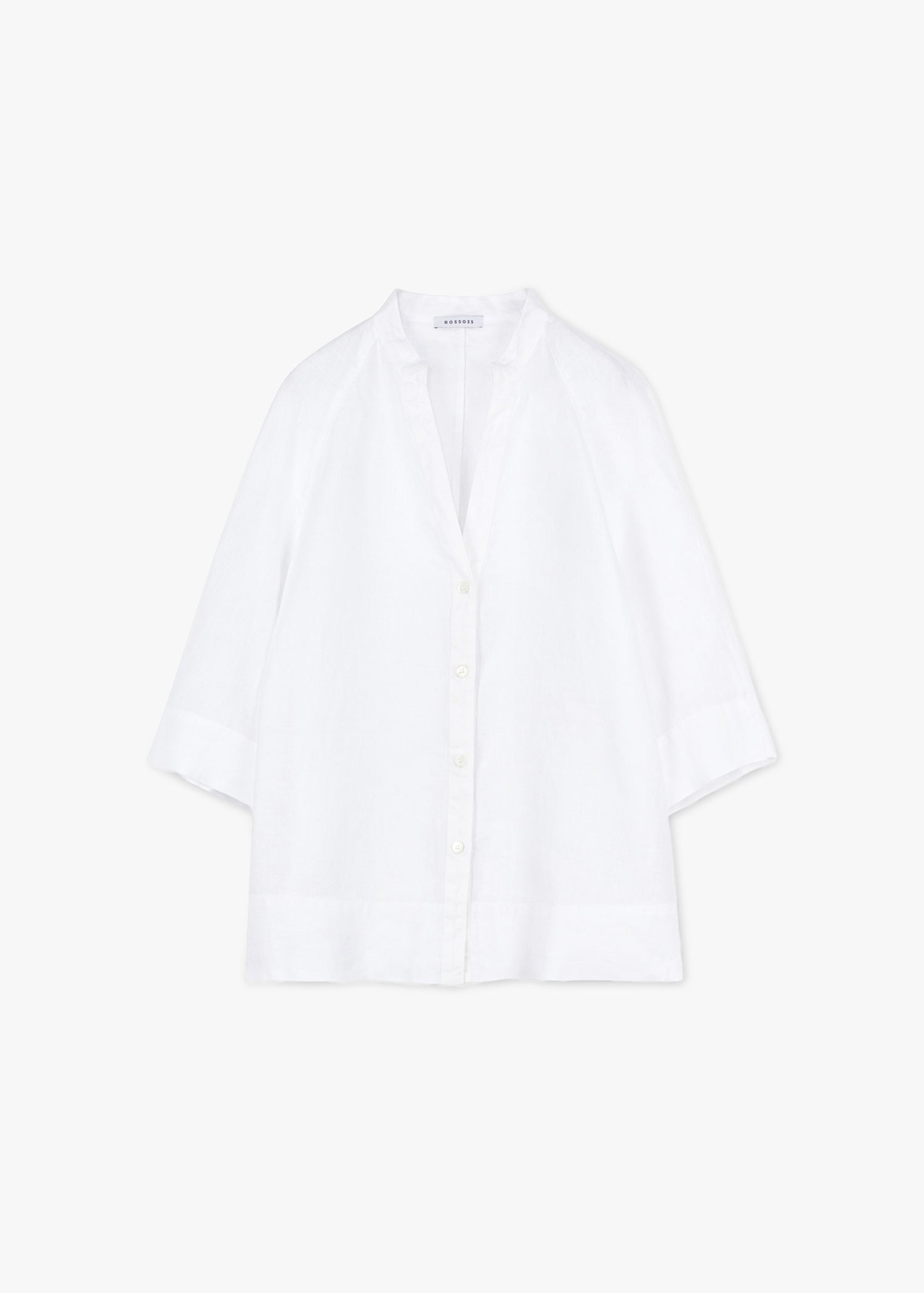 Blouse by Rosso35 made of linen, stand-up collar with V-neck, 3/4 raglan sleeves, button placket, straight hem with side slits.