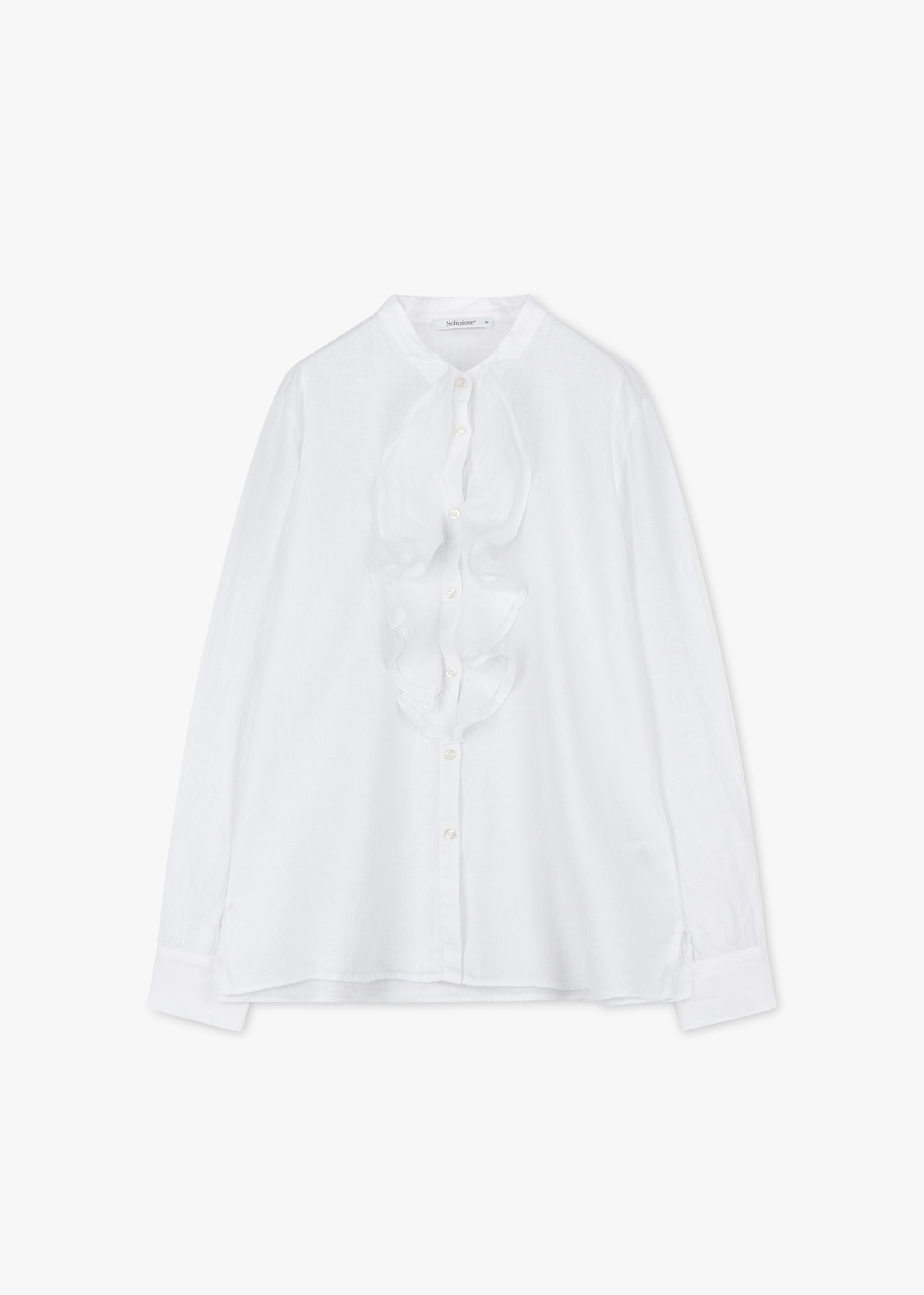 Loose blouse from Soluzione, round neckline, button placket with flounces, long sleeves with buttoned cuffs, rounded hem, slightly transparent, soft feel.