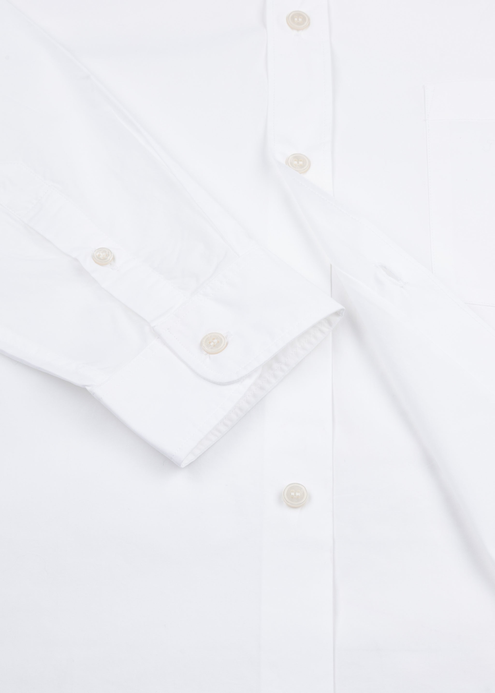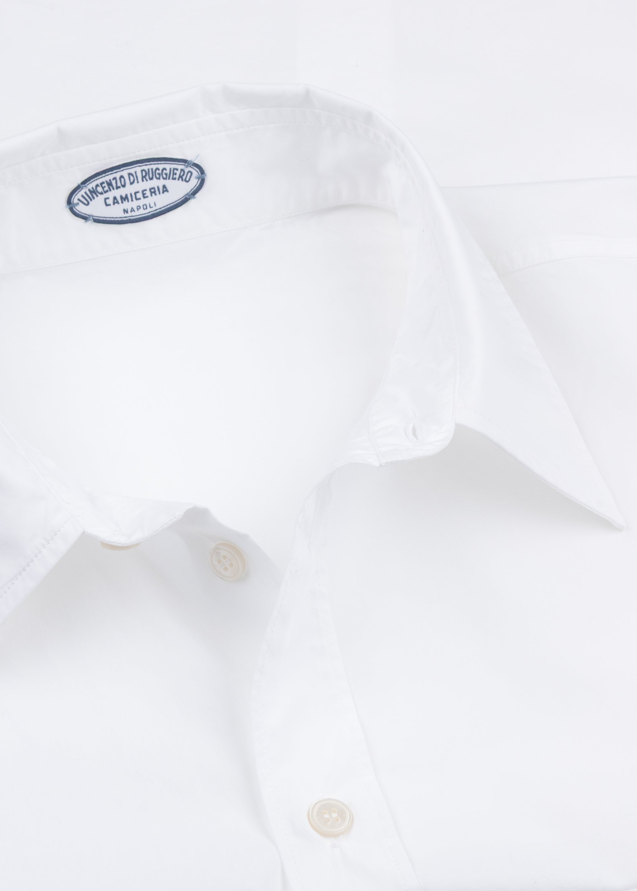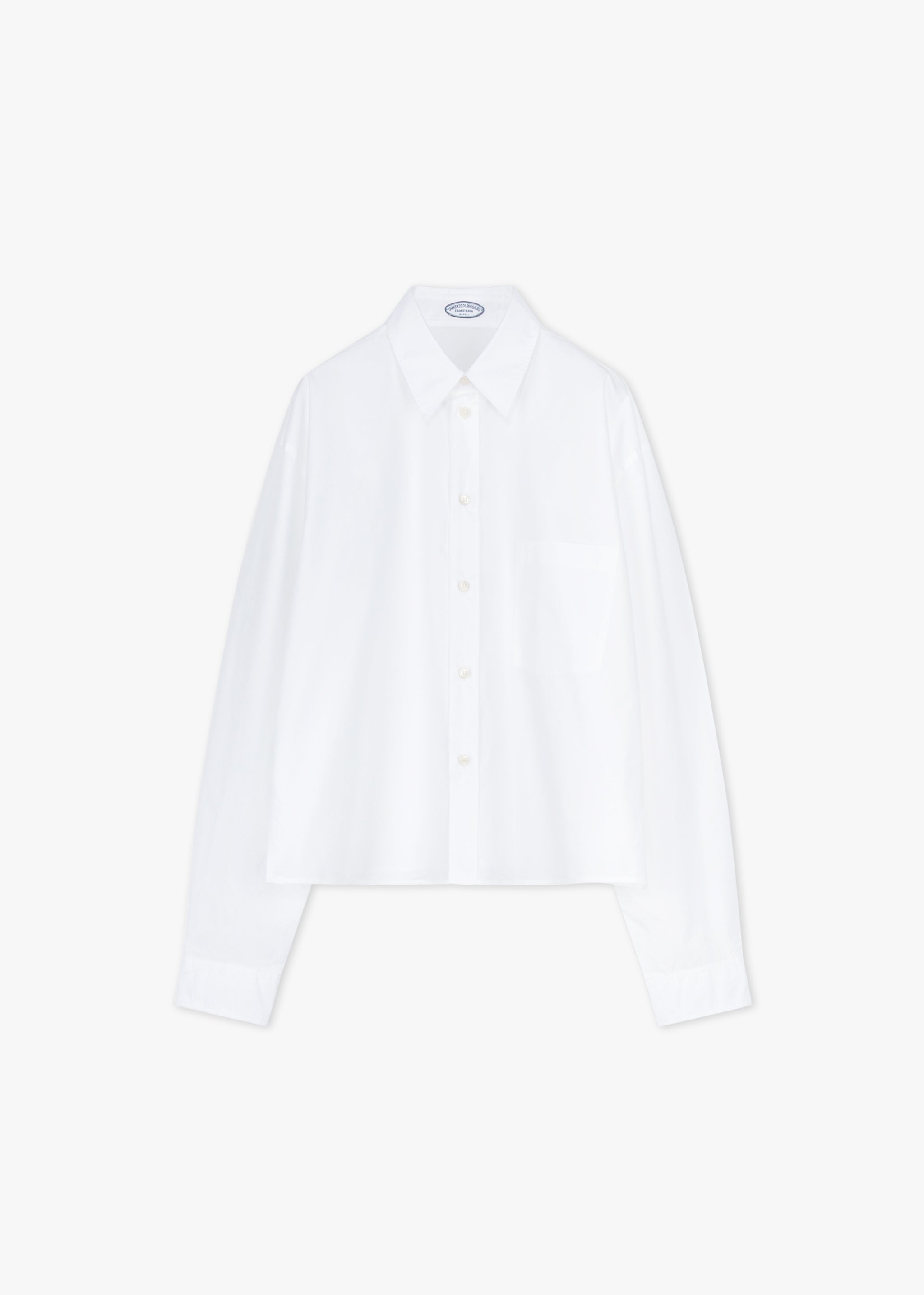 Hip-length blouse 'Angela' by Vincenzo Di Ruggiero made of fine cotton, classic collar, dropped shoulders, long sleeves with buttoned cuffs, full button placket, straight hem.