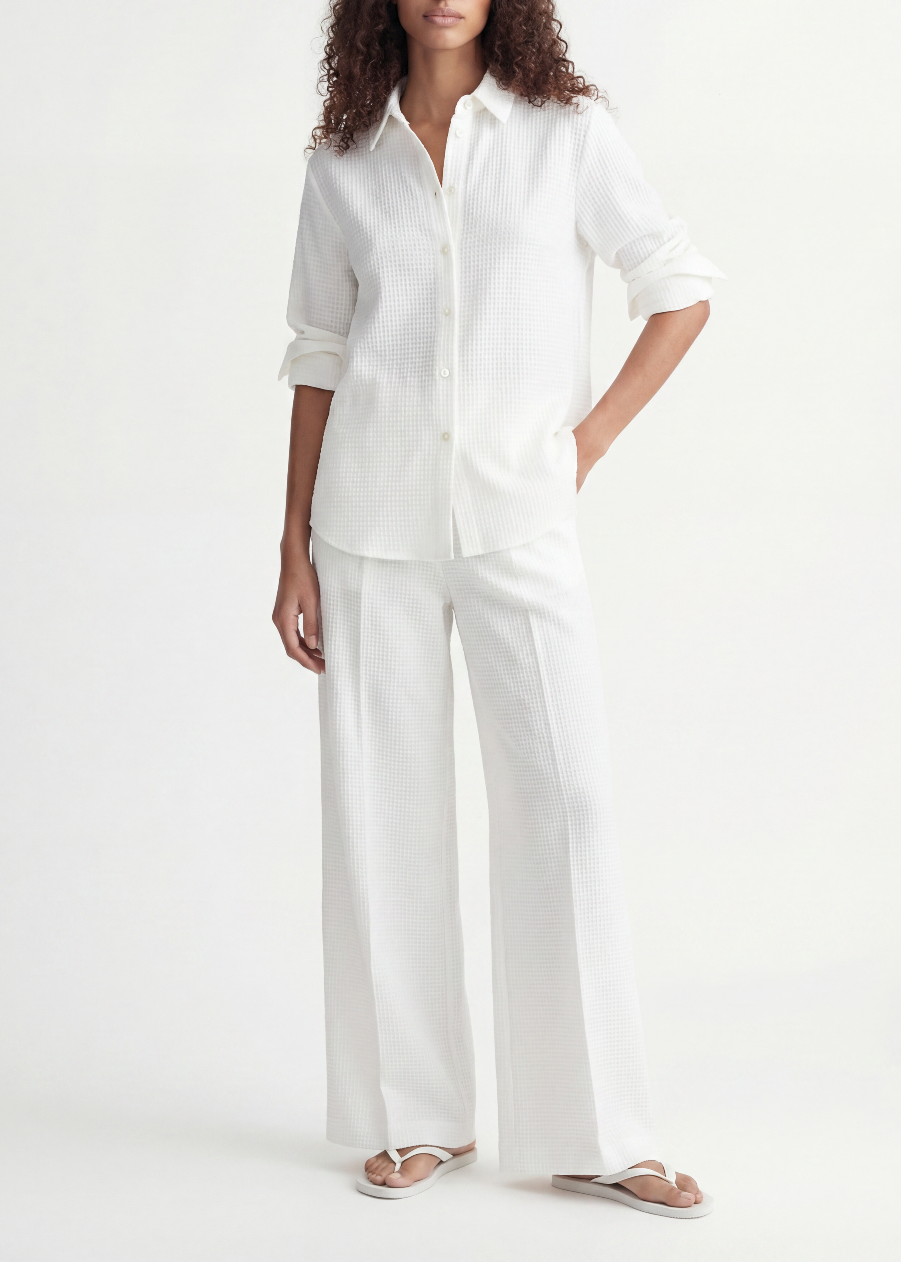 'Woman Shirt' by PiaLea, classic collar, long sleeves with wide buttoned cuffs, slightly rounded hem, structured.