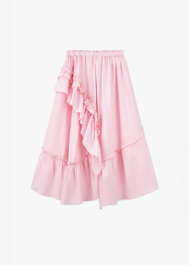 Midi skirt by YMC made of soft organic cotton with asymmetric ruffles, elastic waistband with drawstring, double layer.