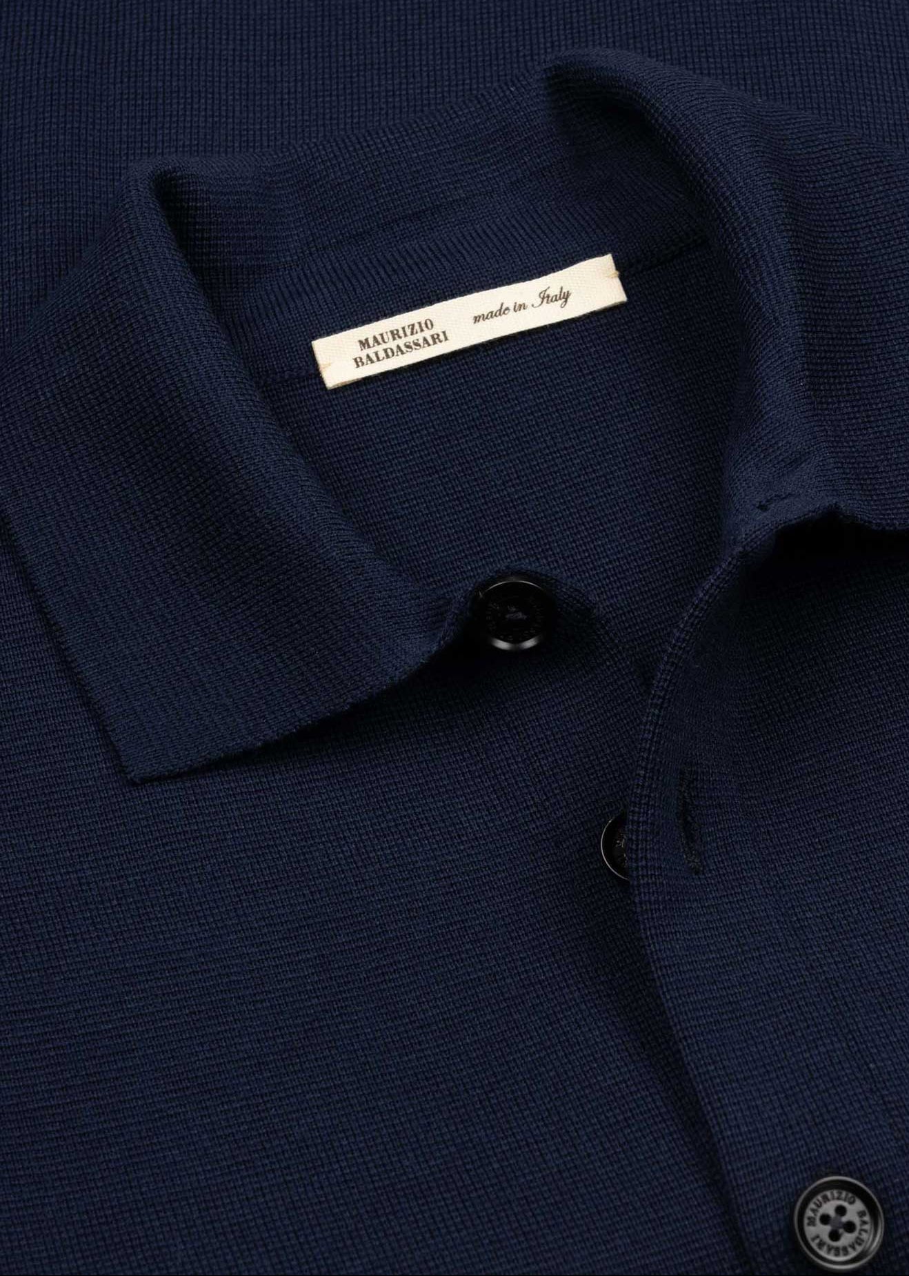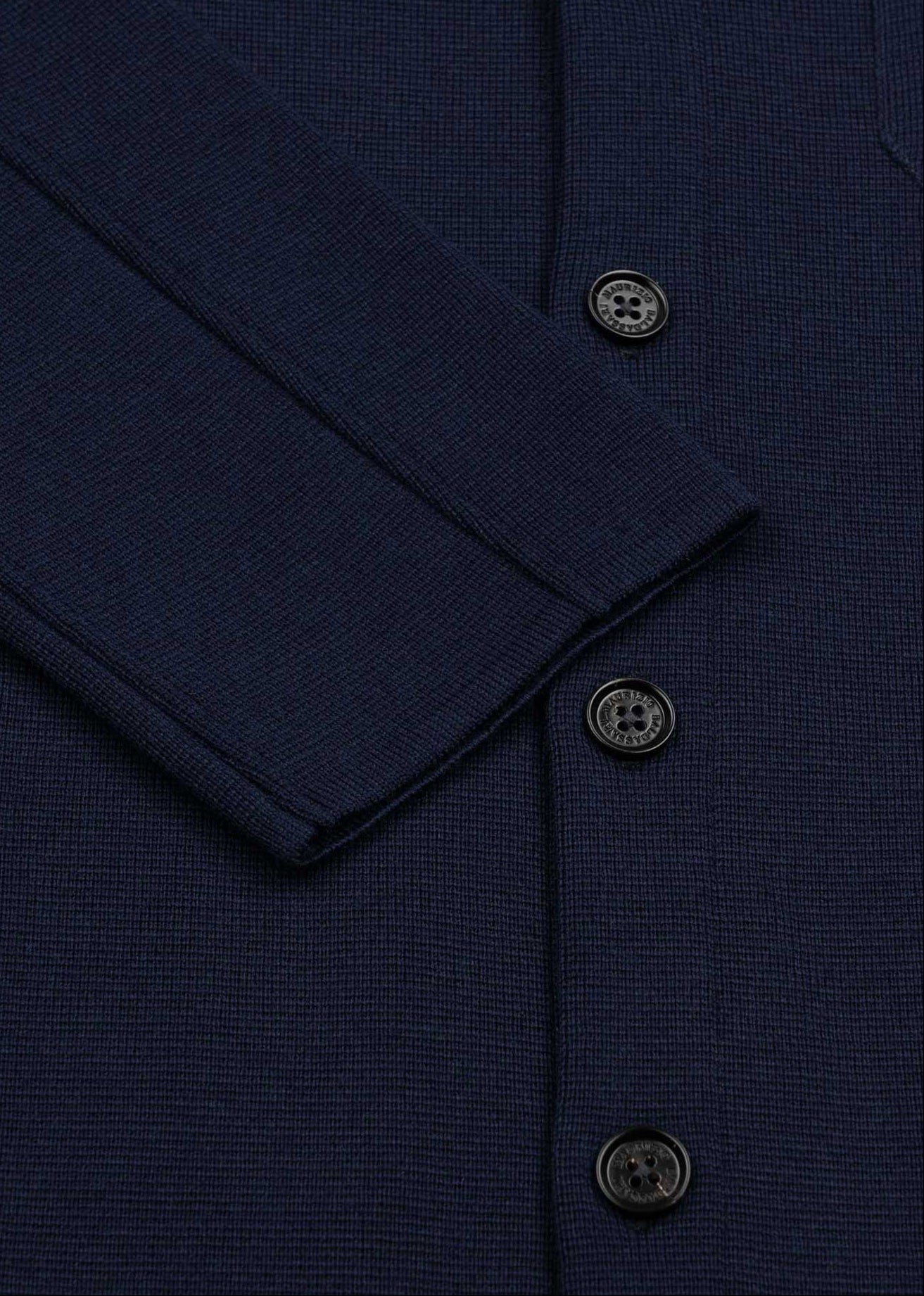 Strukturierte Strickjacke 'Milan Stitch' von Maurizio Baldassari aus Schurwolle, klassischer Kragen, Rückenpasse, durchgehende Knopfleiste, eine aufgesetzte Brusttasche, zwei Eingriffstaschen, abgerundeter Saum.