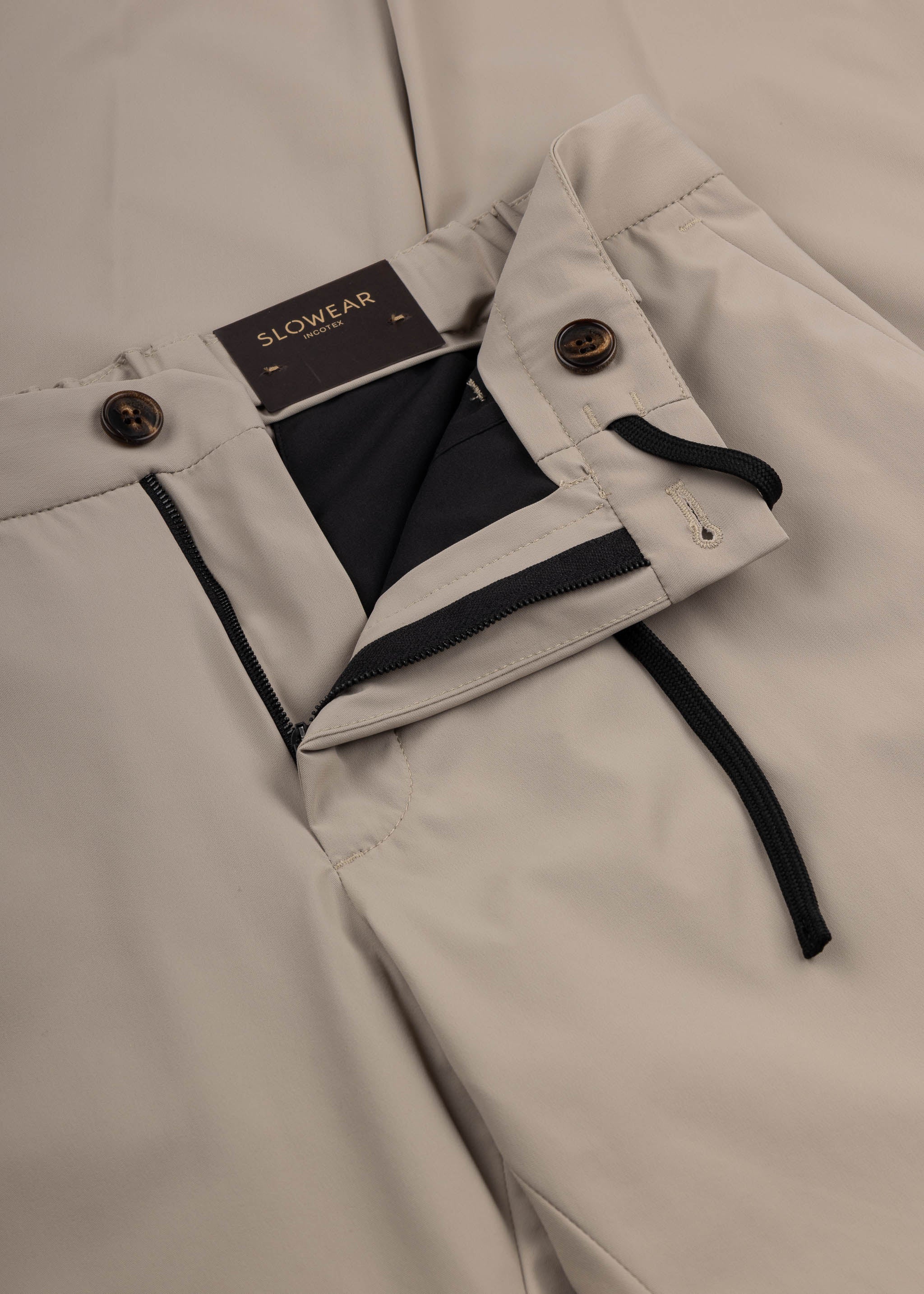 Knitterfreie Hose von Incotex aus leistungsstarken technischen Stoffen, Gürtelschlaufen, Knopf- und Reißverschluss, elastischer Bund mit Tunnelzug, Bügelfalten, Eingriffstaschen, Paspelgesäßtaschen, offener Beinsaum zur individuellen Längenanpassung.
