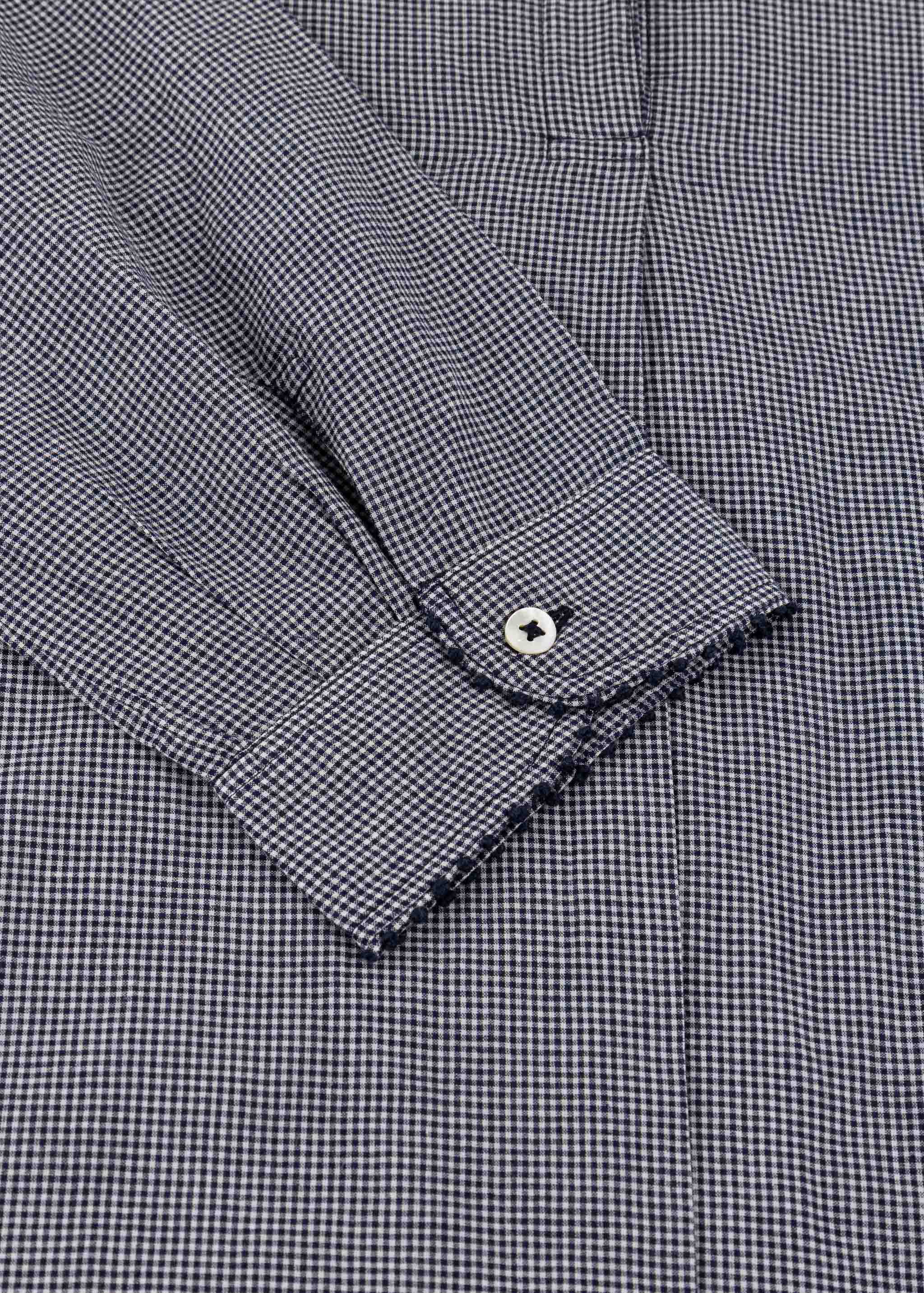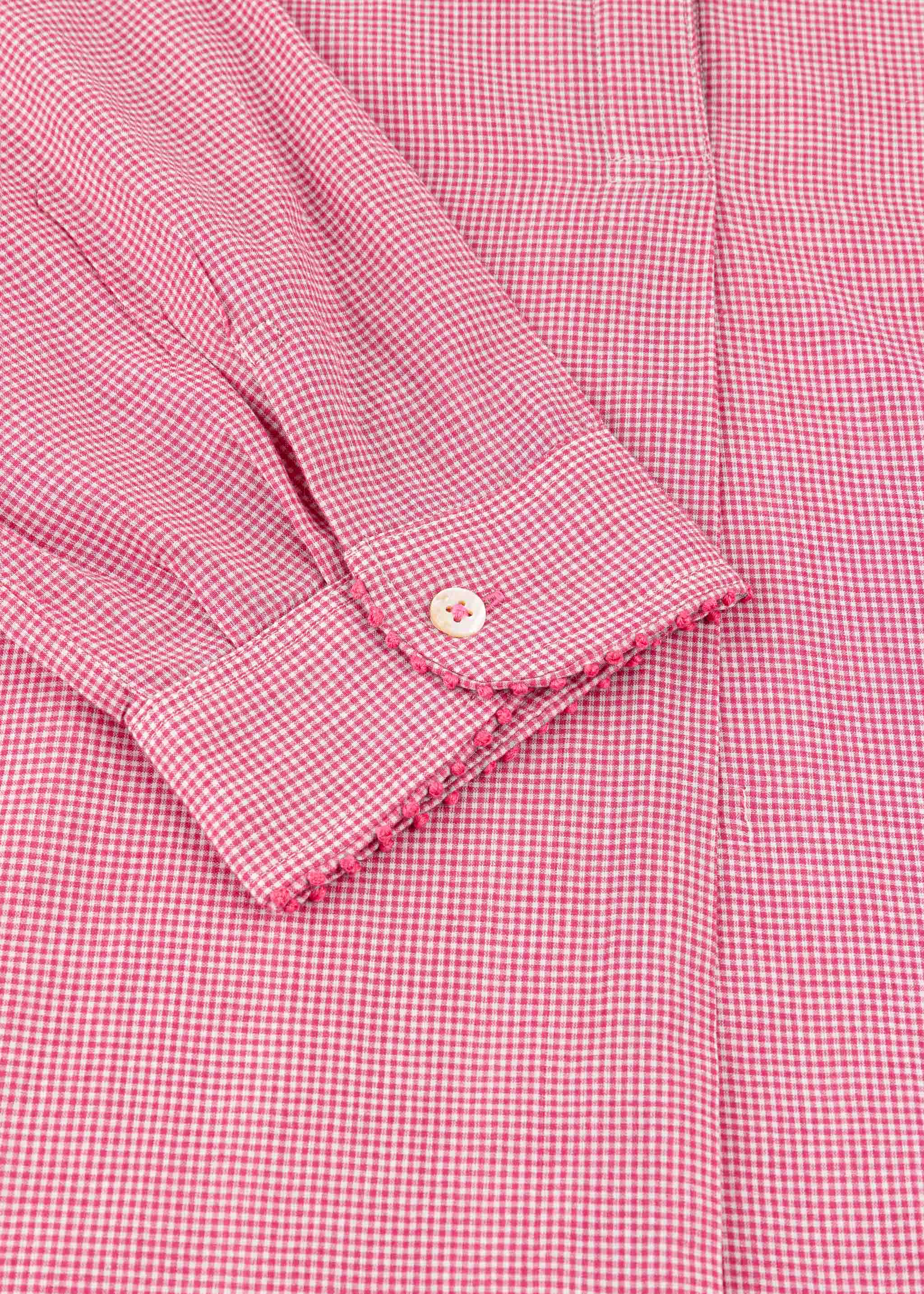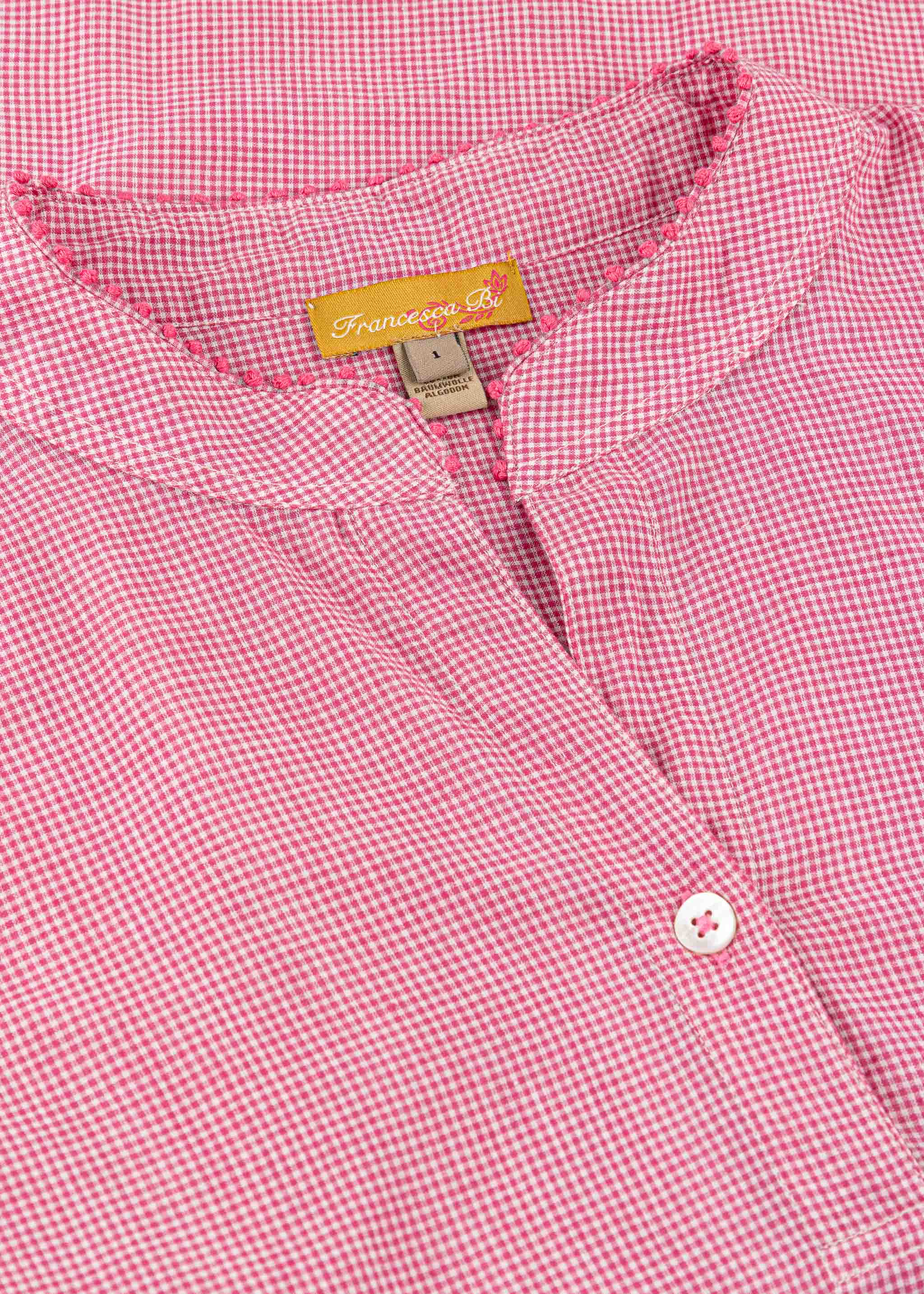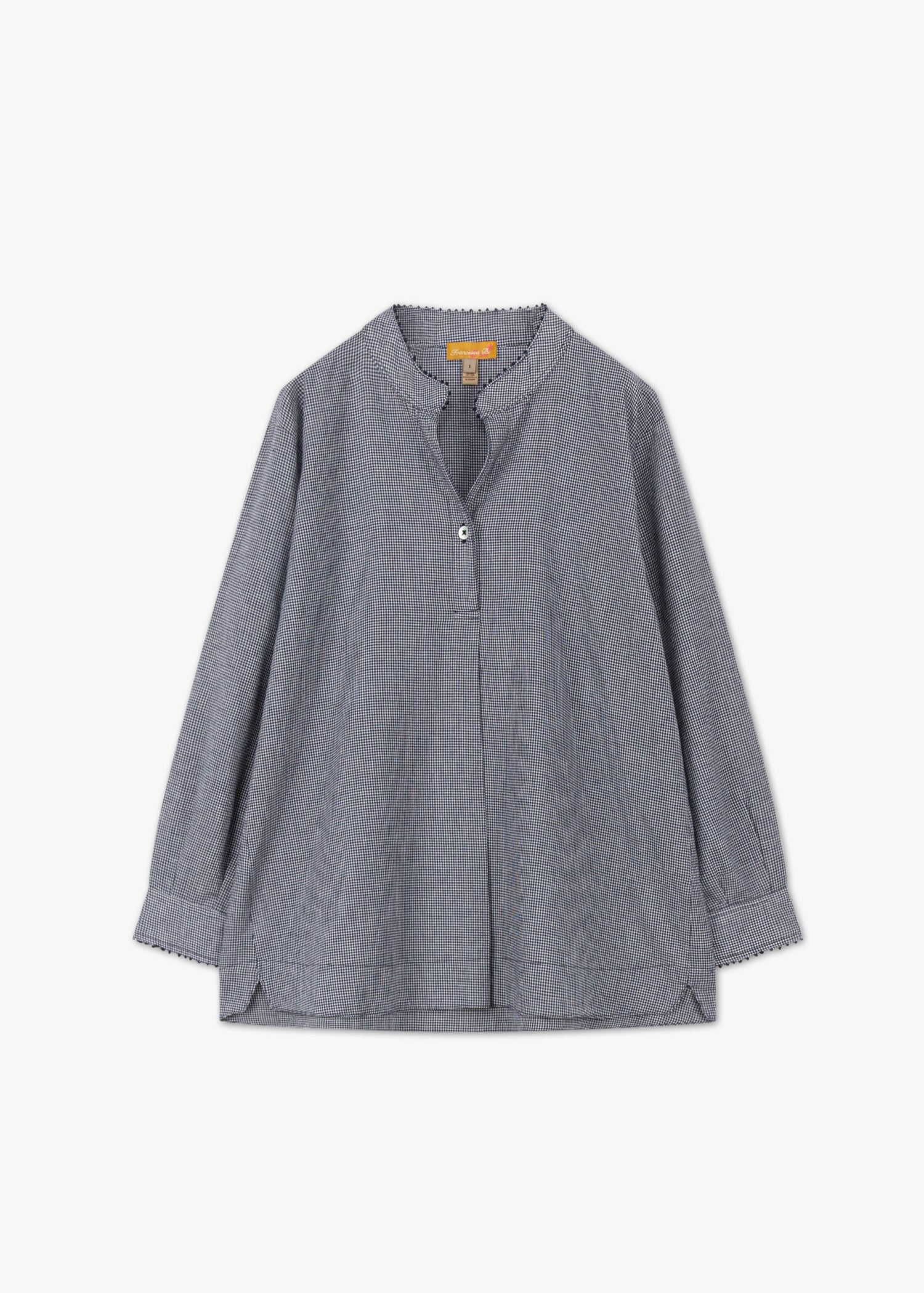 Handgefertigte Bluse von Francesca Bassi aus Baumwolle zum Schlupfen, Stehkragen mit kurzer Knopfleiste, passgenaue Schultern, verkürzte Ärmel mit Knopfmanschetten, Knötchenverzierung an Kragen und Manschetten, Vokuhila-Saum, weicher Griff.