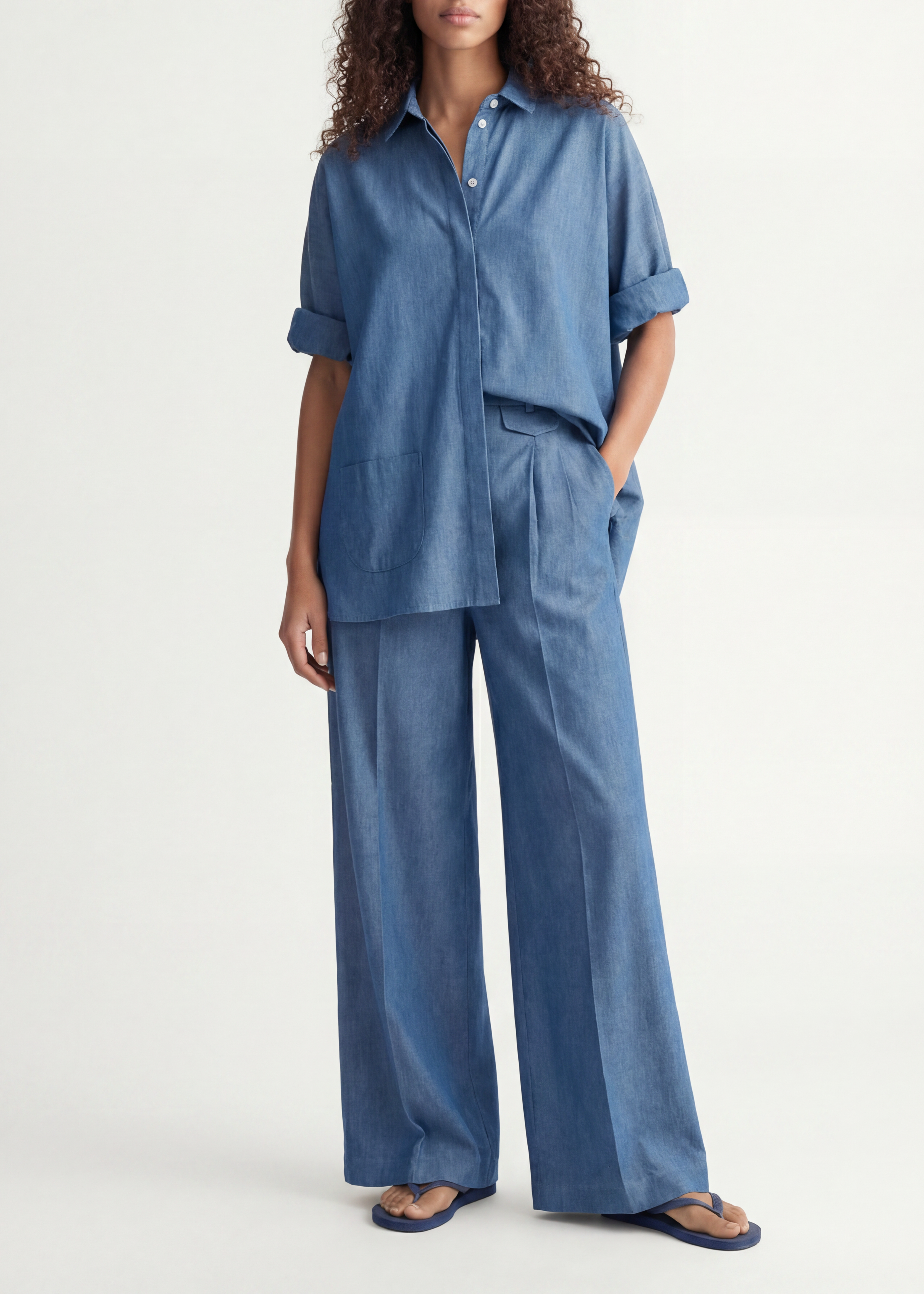 Lockere Bluse von PiaLea aus feinem Denim, spitzer Kragen, verdeckte Knopfleiste, kurze Ärmel mit Umschlag, zwei aufgesetzte Taschen, abgerundeter Saum, feines Material.
