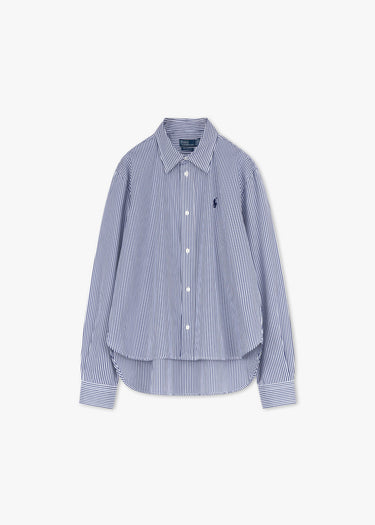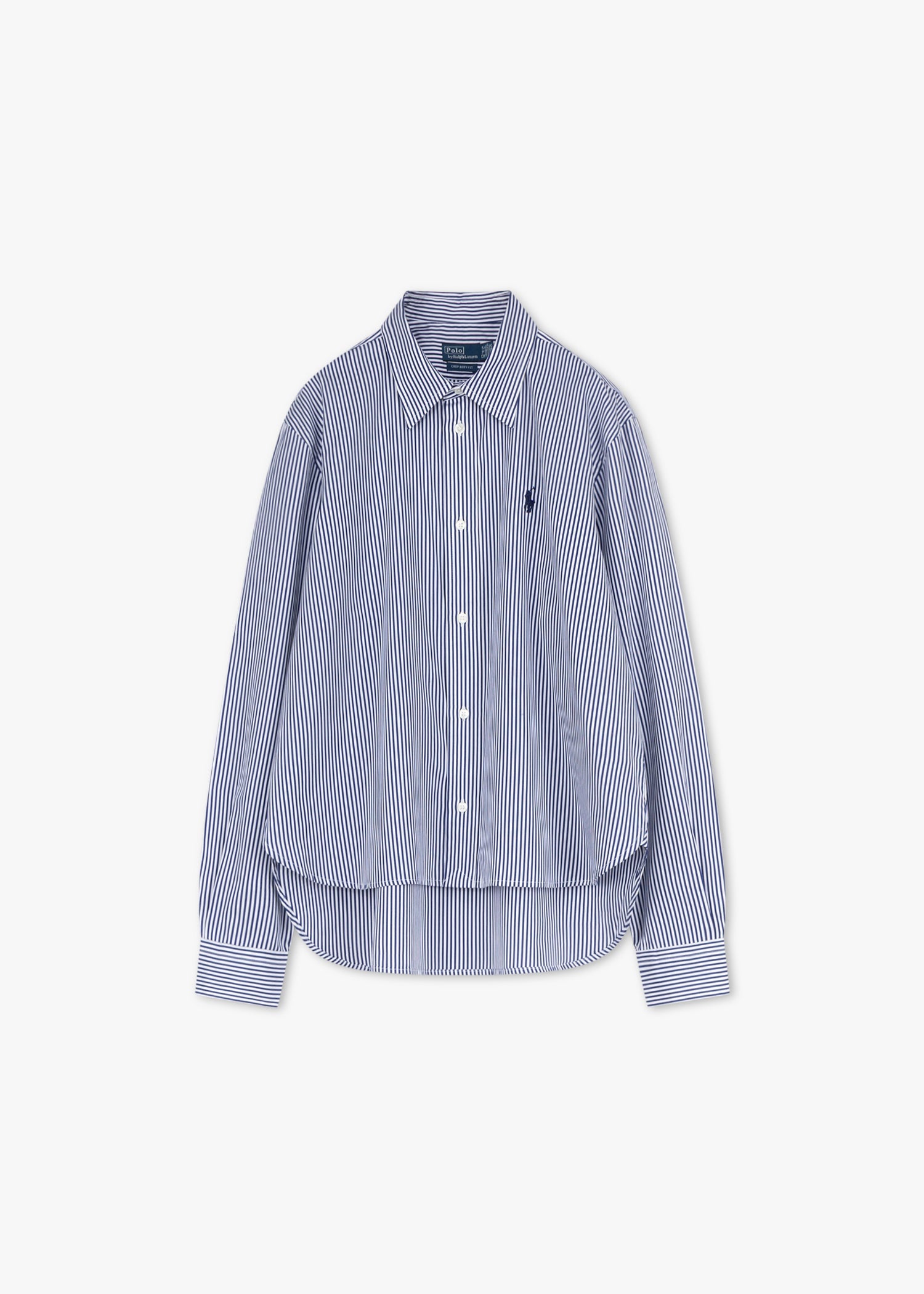 Lockere Bluse von Polo Ralph Lauren, klassischer Kragen, Rückenpasse mit Quetschfalte, durchgehende Knopfleiste, leicht überschnittene Schultern, lange Ärmel mit Knopfmanschette, gesticktes Pony-Logo, Vokuhila-Saum.