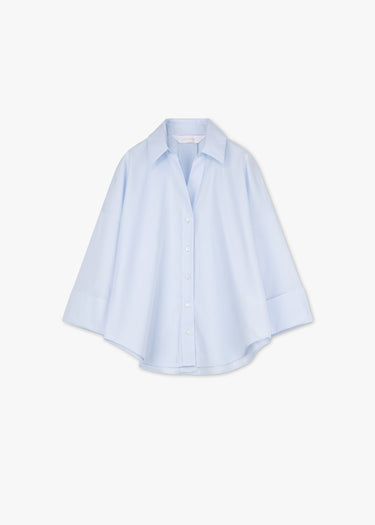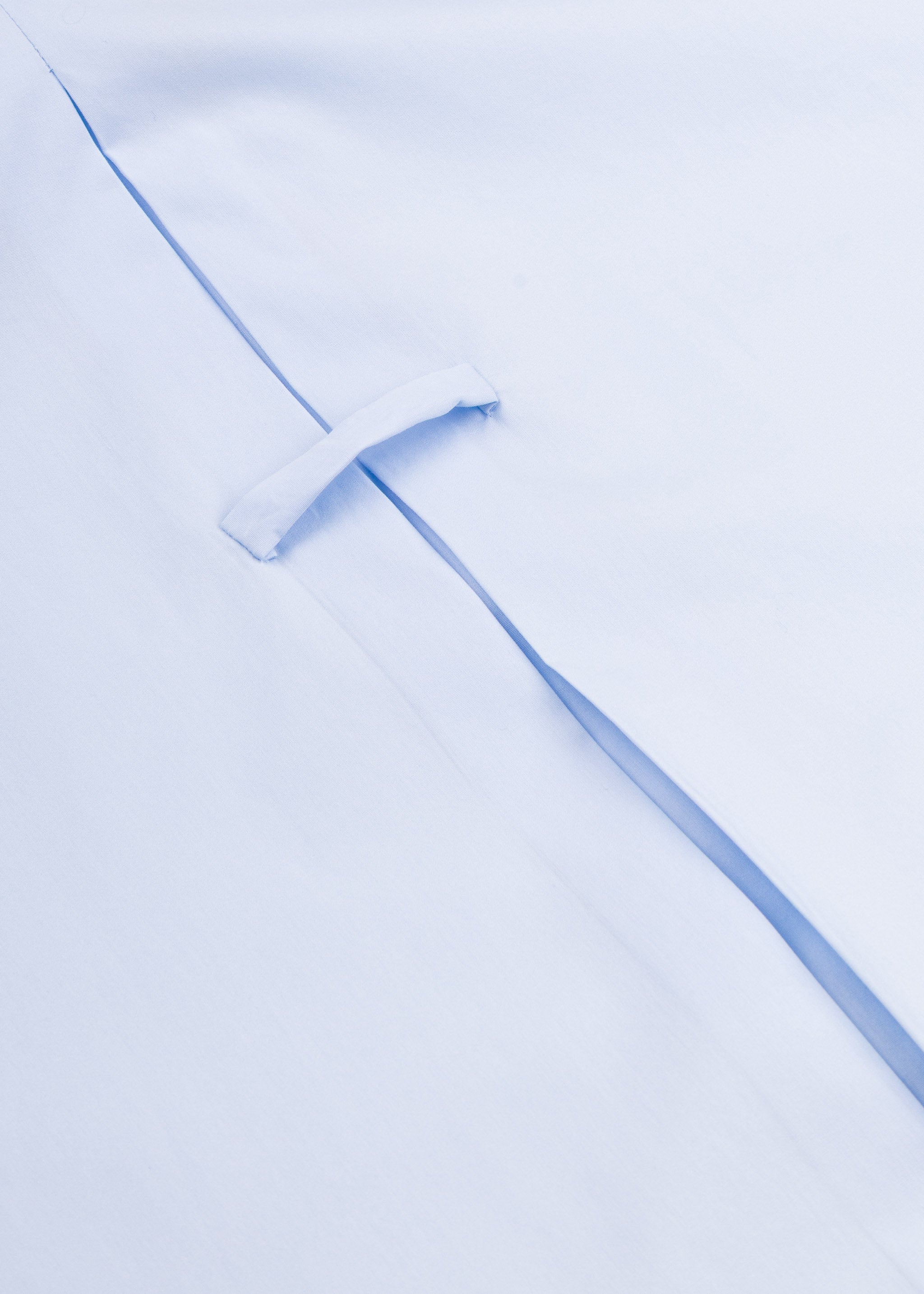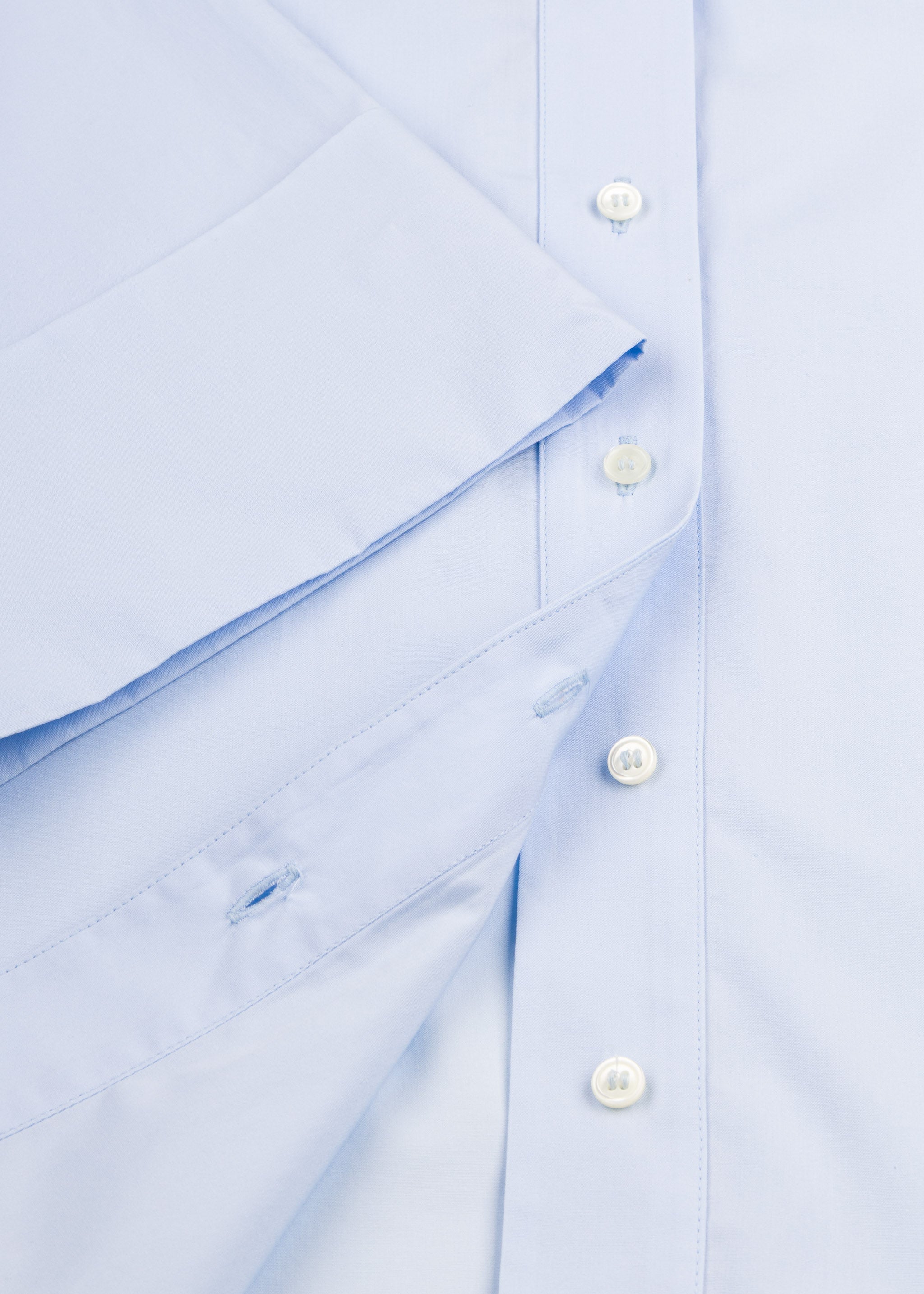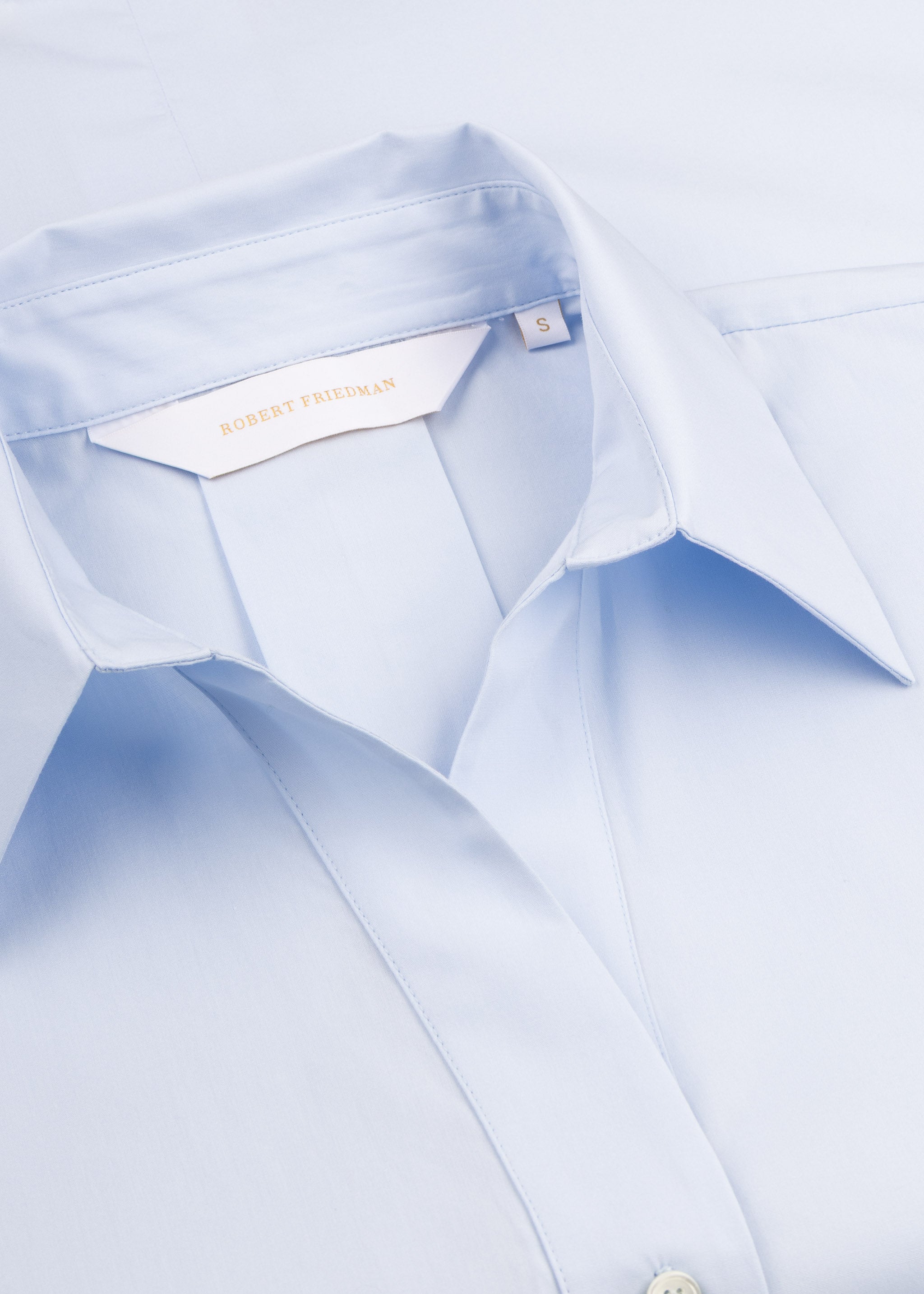 Bluse 'Saba' von Robert Friedman aus feiner Baumwolle, klassischer Kragen mit V-Ausschnitt, Rückenpasse mit Kellerfalte, überschnittene Schultern, Knopfleiste, 3/4 Ärmel mit breiter Manschette, abgerundeter Saum.