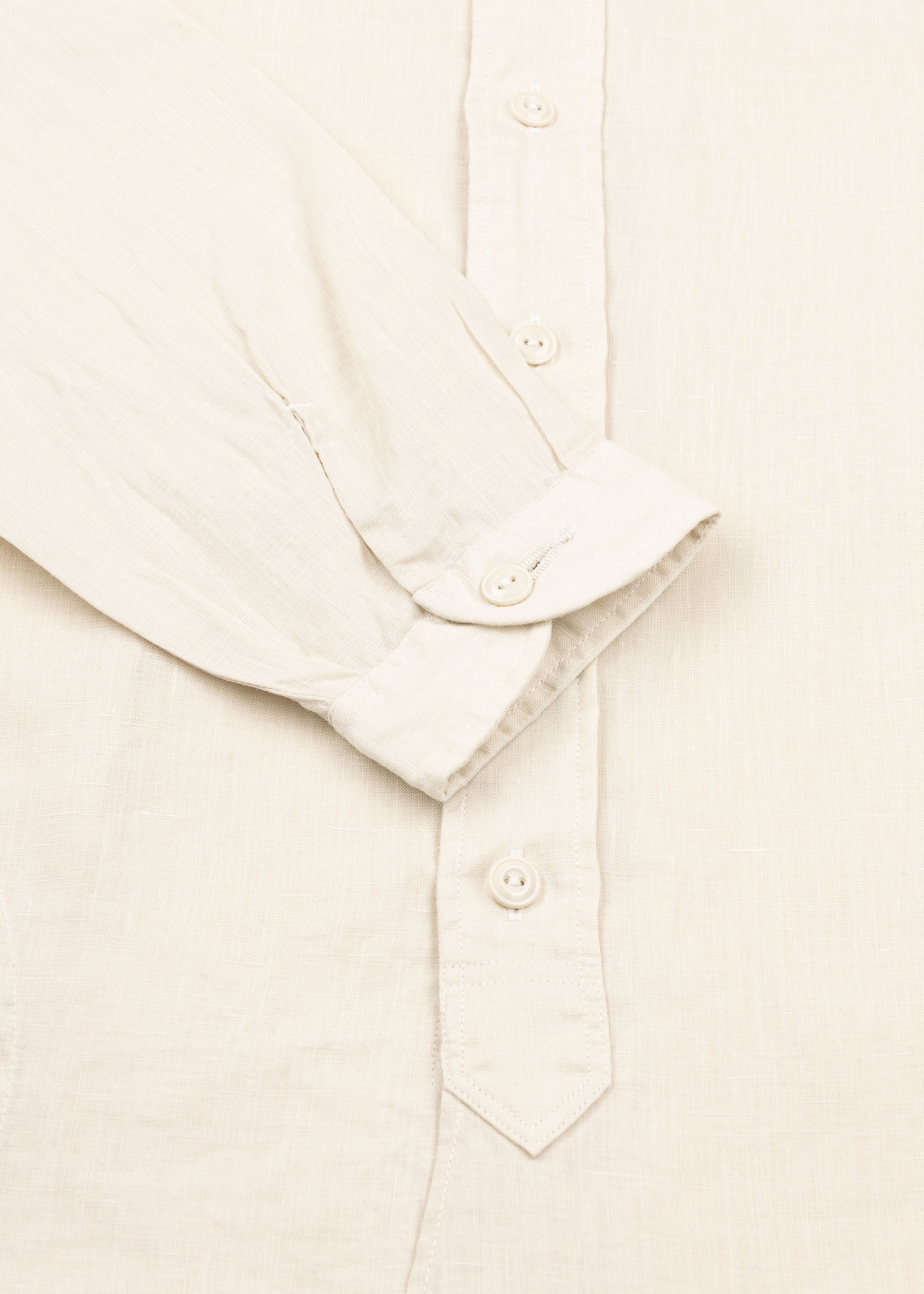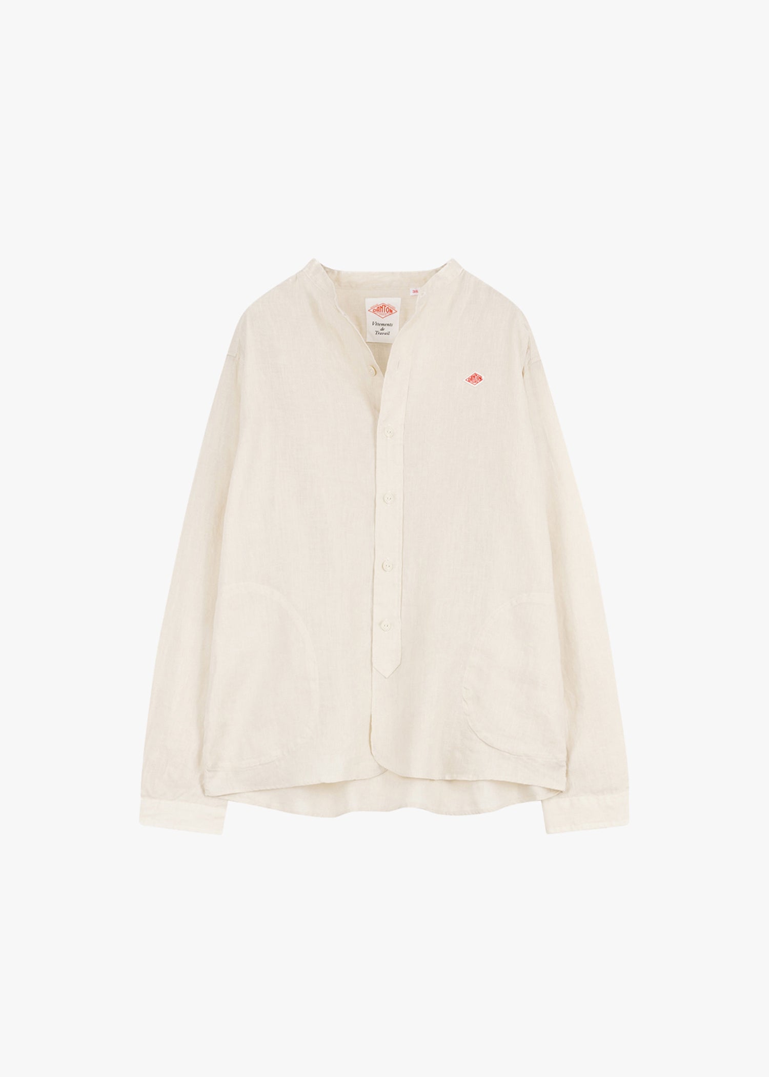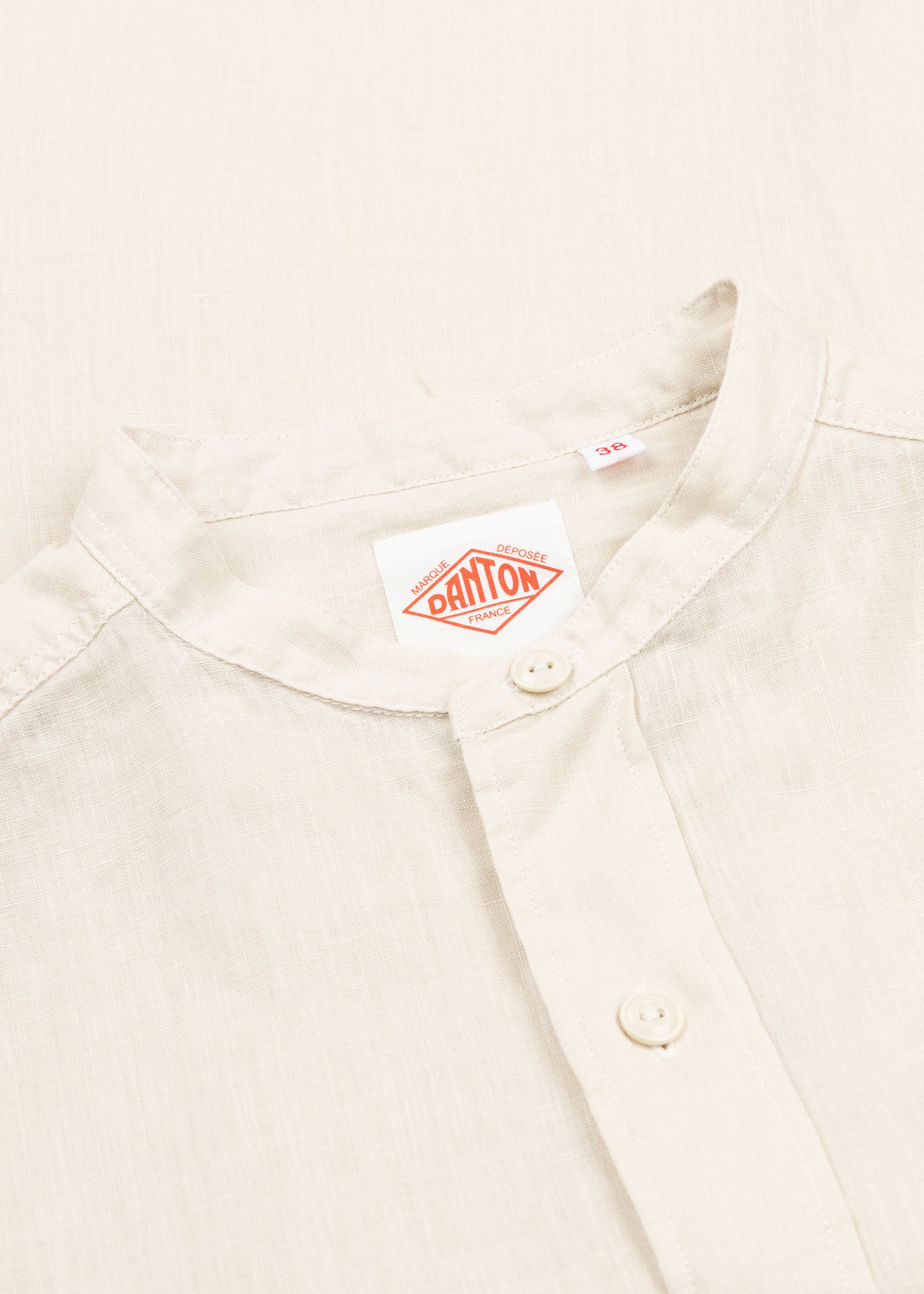 Bluse von Danton aus Leinen, Stehkragen, durchgehende Knopfleiste, Ärmel mit Knopfmanschette, Rückenpasse mit gelegten Falten, Eingriffstaschen, abgerundeter Saum.