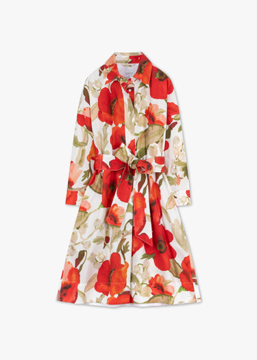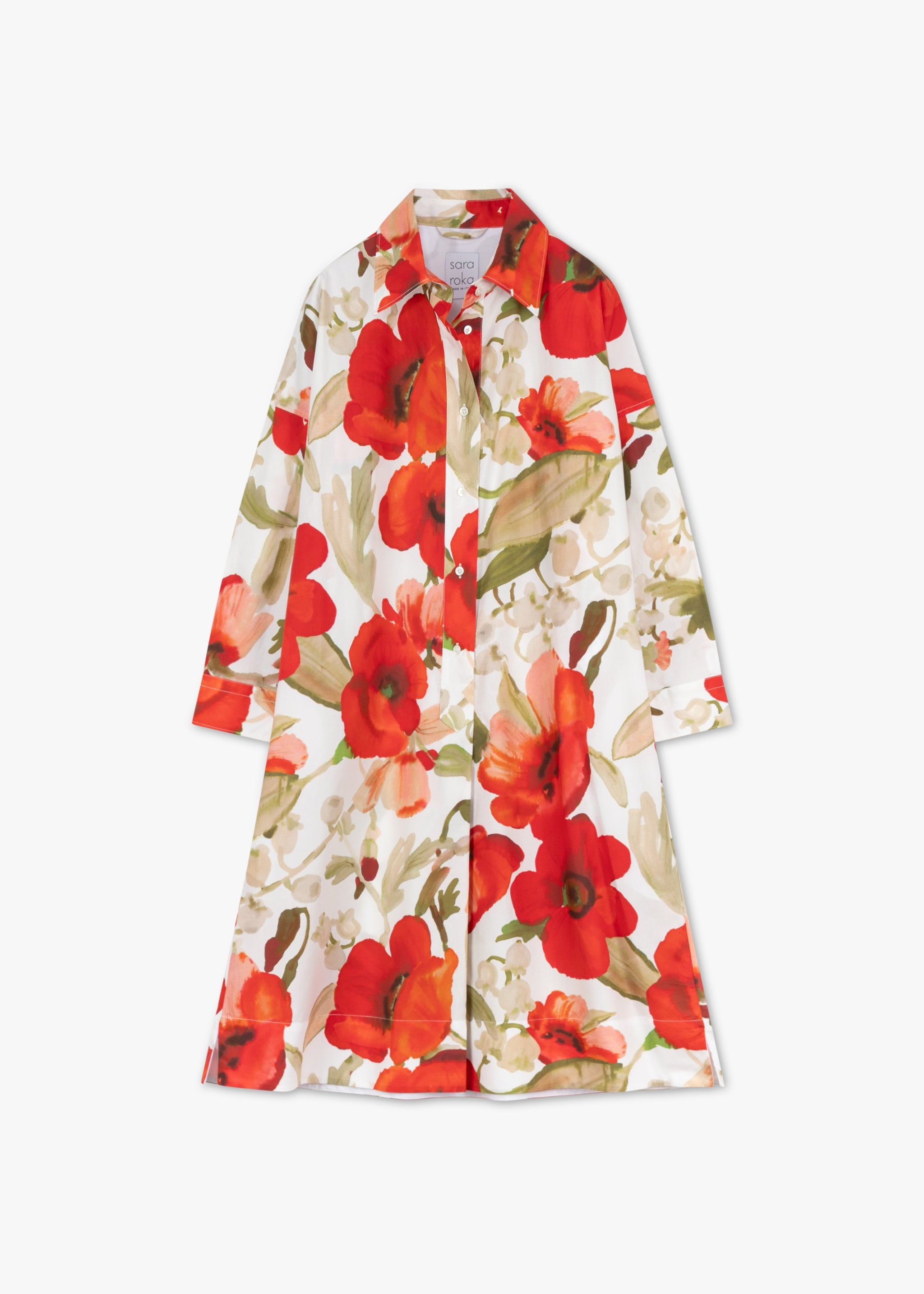 Geblümtes Midi-Blusenkleid 'Ekatery' von Sara Roka aus Baumwolle, klassischer Kragen mit kurzer Knopfleiste, überschnittenen Schultern, 3/4 Ärmel mit Knopfmanschetten, Rückenpasse mit Quetschfalten, seitliche Eingriffstaschen, abnehmbarer Taillengürtel, gerader Saum.