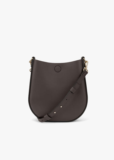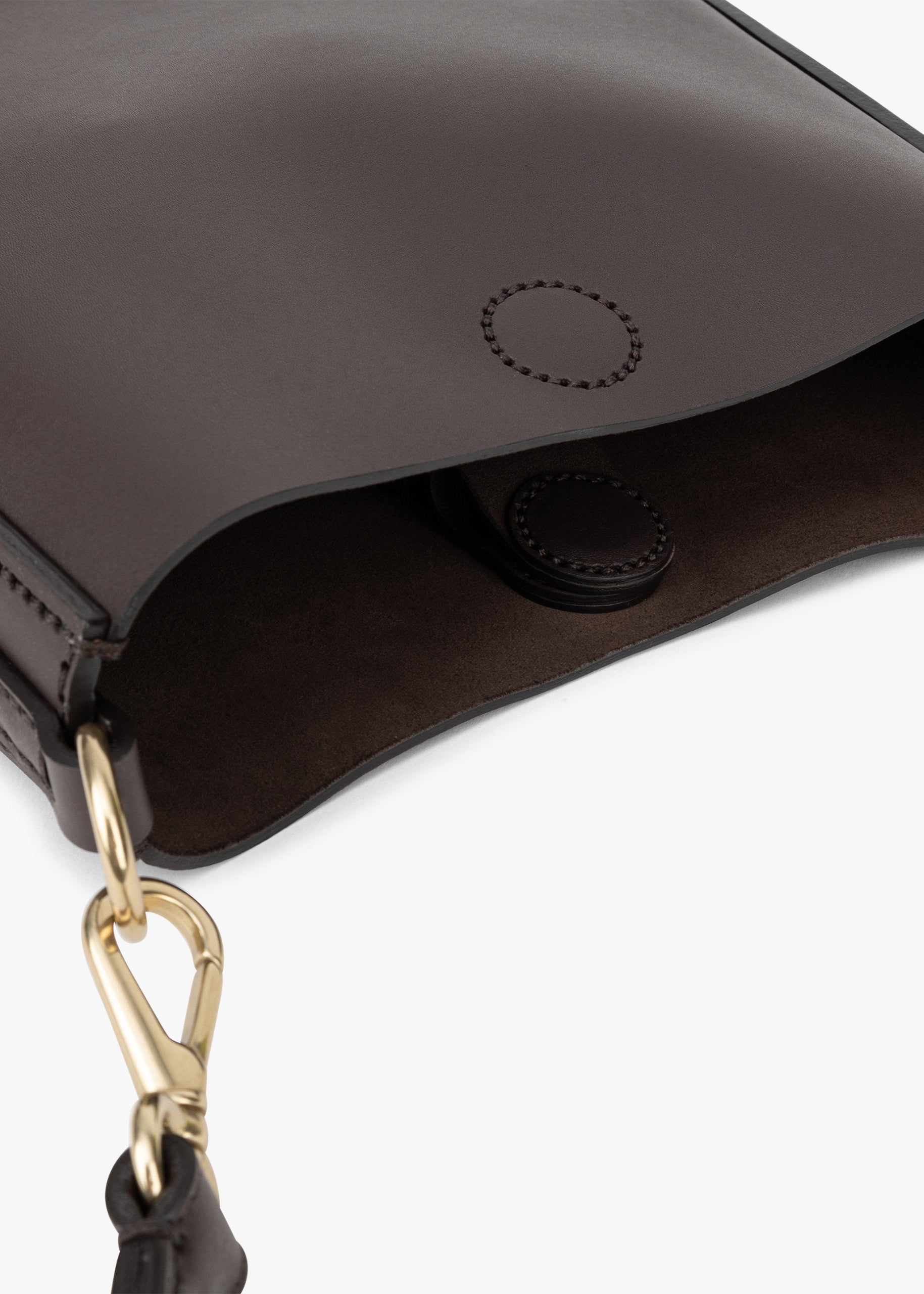 Halbrunde Tasche 'Loop' von Stiebich + Rieth aus weichem Rindsleder, Magnetverschluss, kurzer handgenähter Griff und langer Schulterriemen mit Karabinern aus Messing, Handstichdetails, eine Innentasche, handgenäht.