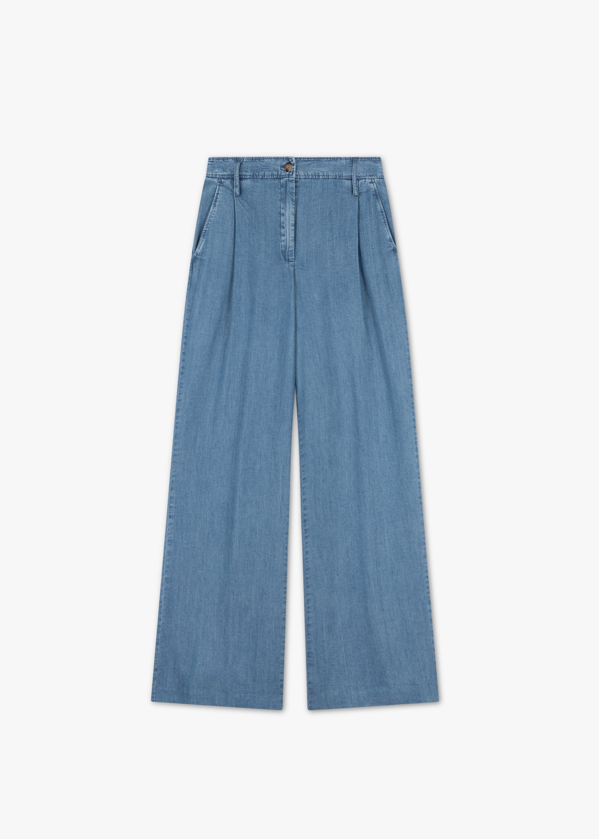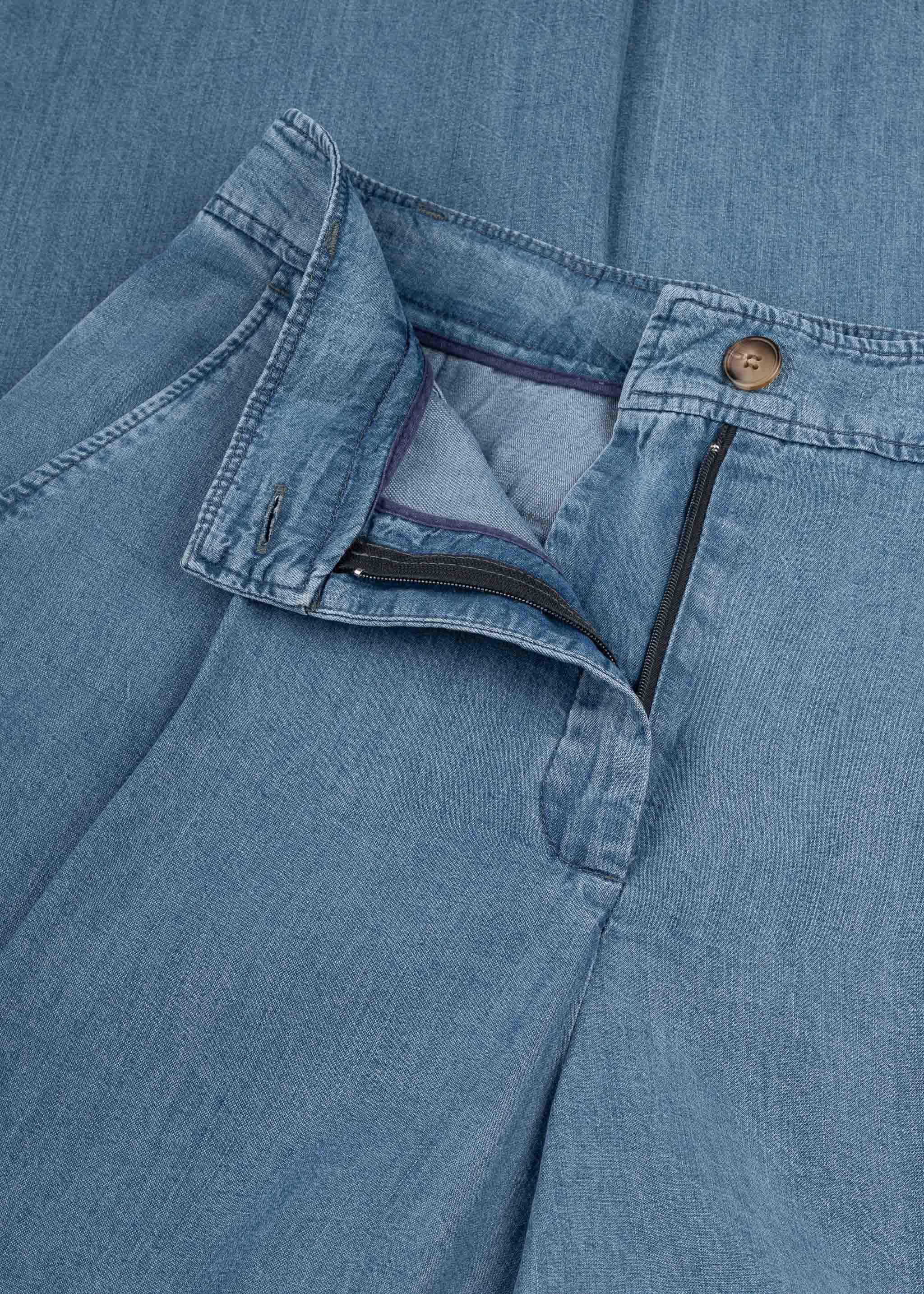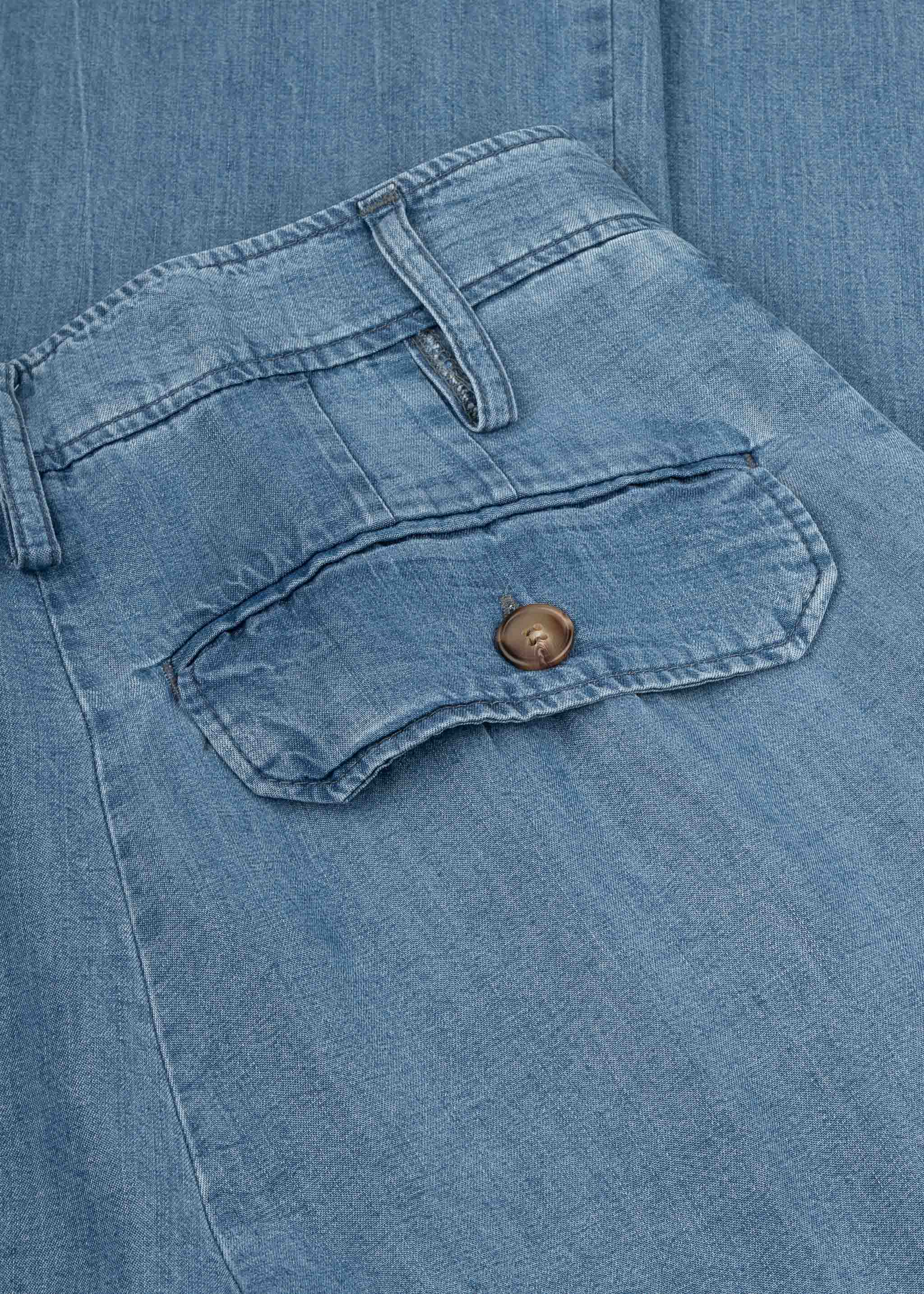 Ultraleichte Hose 'Ginger' von Kiltie aus feinem Tencel im Denim-Look mit weitem Bein, Gürtelschlaufen, Knopf- und Reißverschluss, Taillenabnäher, Bundfalten, eine Gesäßtasche mit Patte.