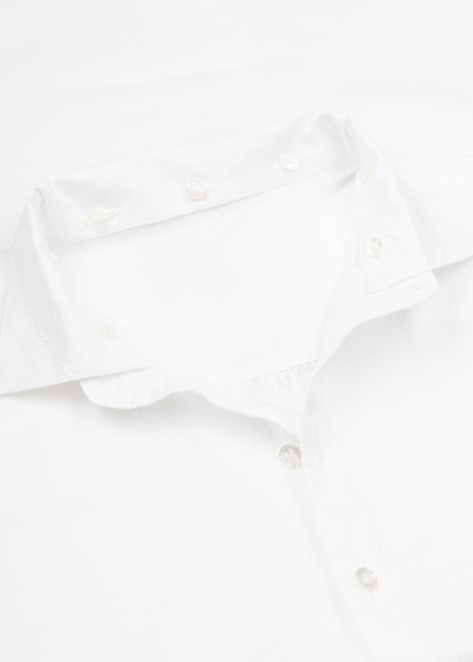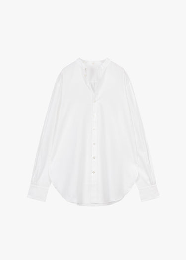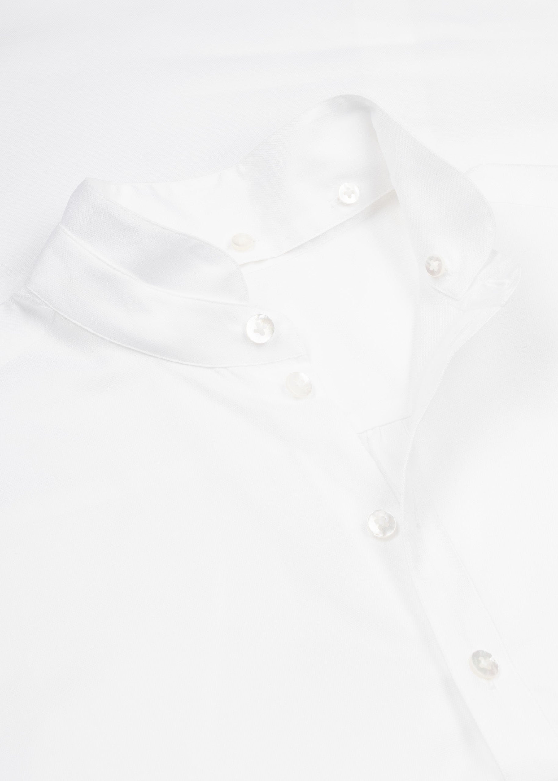 Popeline Bluse 'Duelist' von Yindigo AM, Stehkragen mit verschiedenen Krägen zum anknöpfen, leicht überschnittene Schultern, durchgehende Perlmuttknopfleiste, Rückenpasse mit Falten, lange Ärmel mit Knopfmanschette, abgerundeter Saum.