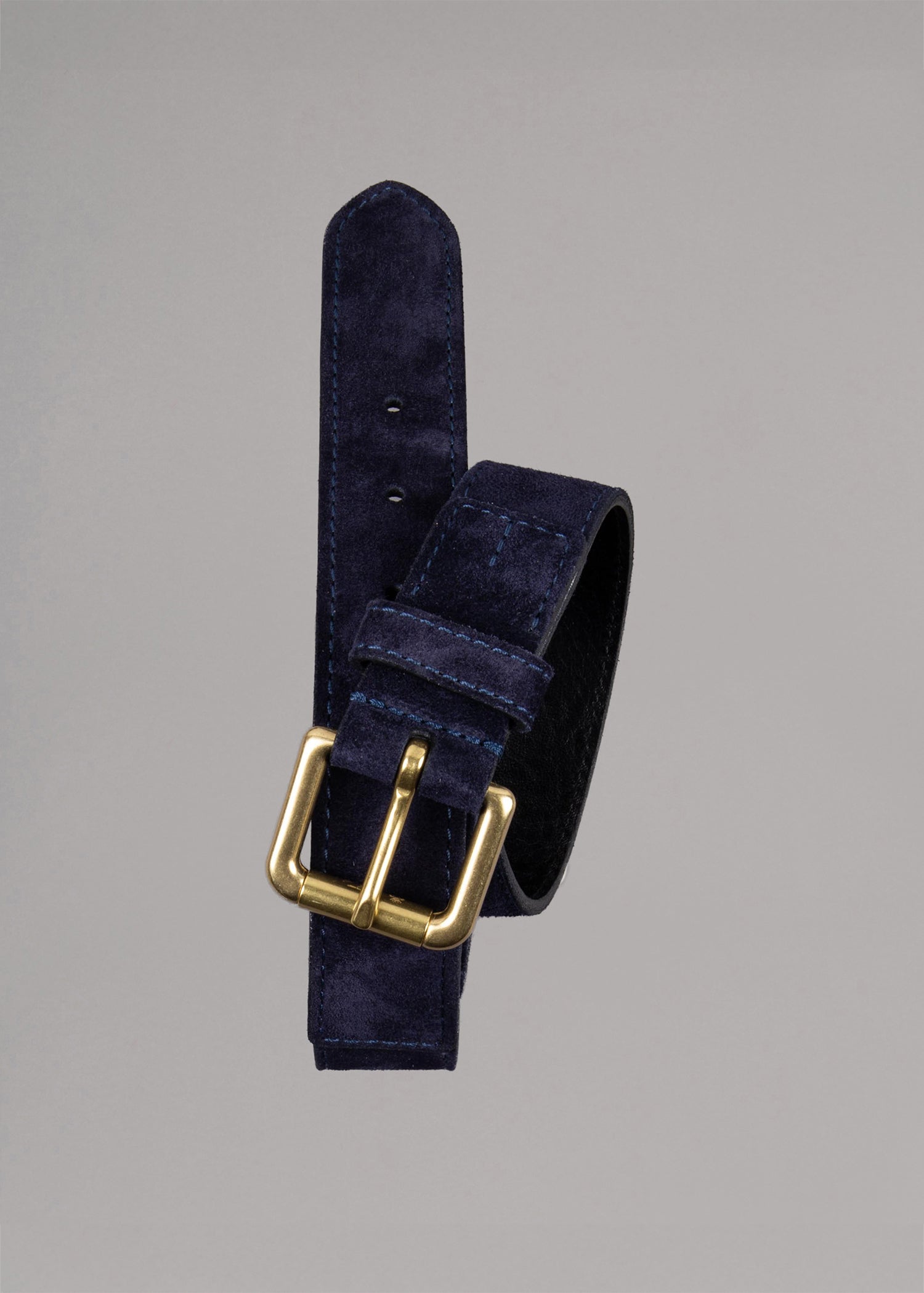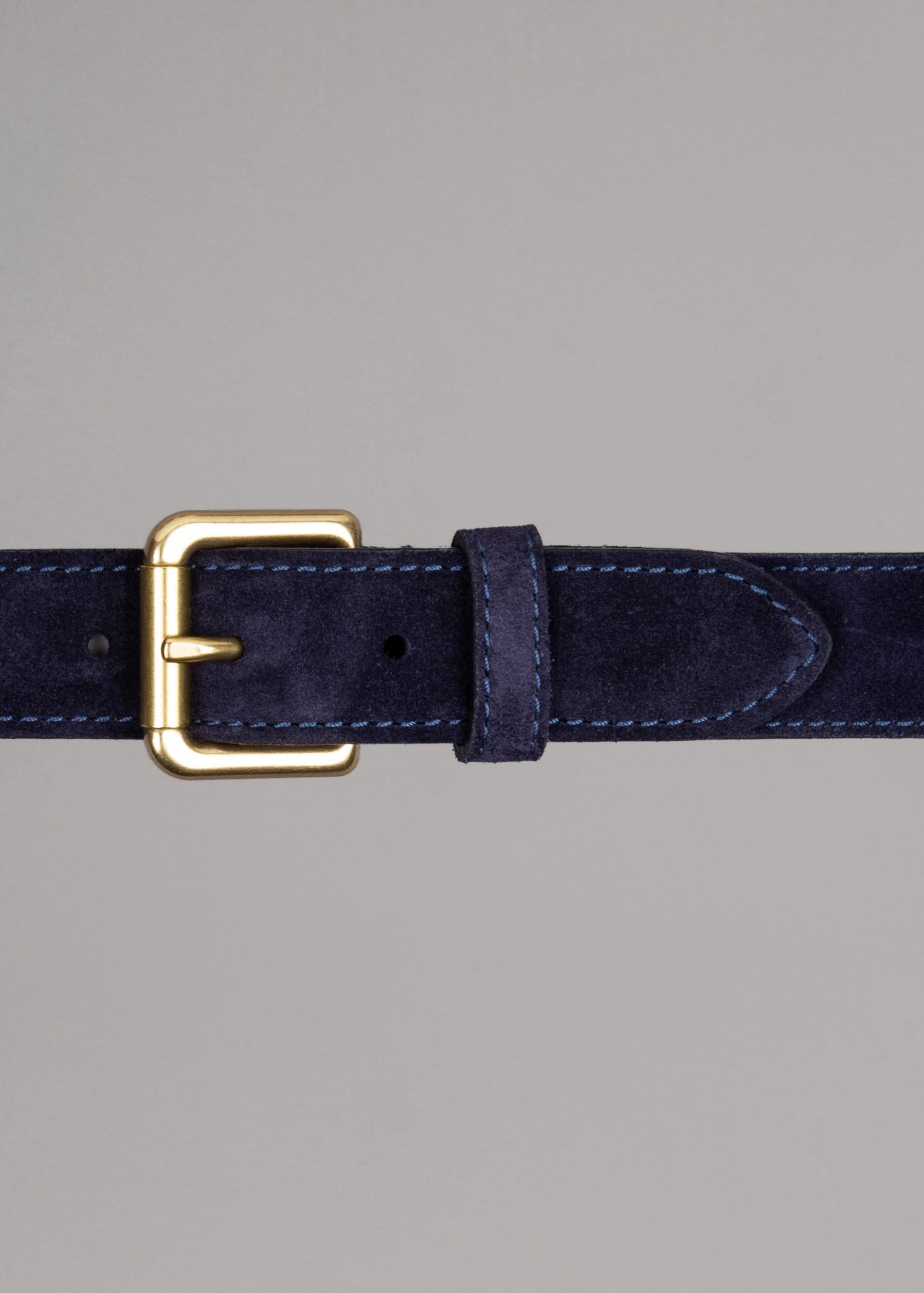 Dunkelblauer Wildleder Gürtel der italienischen Marke Felisi mit goldener Schnalle.