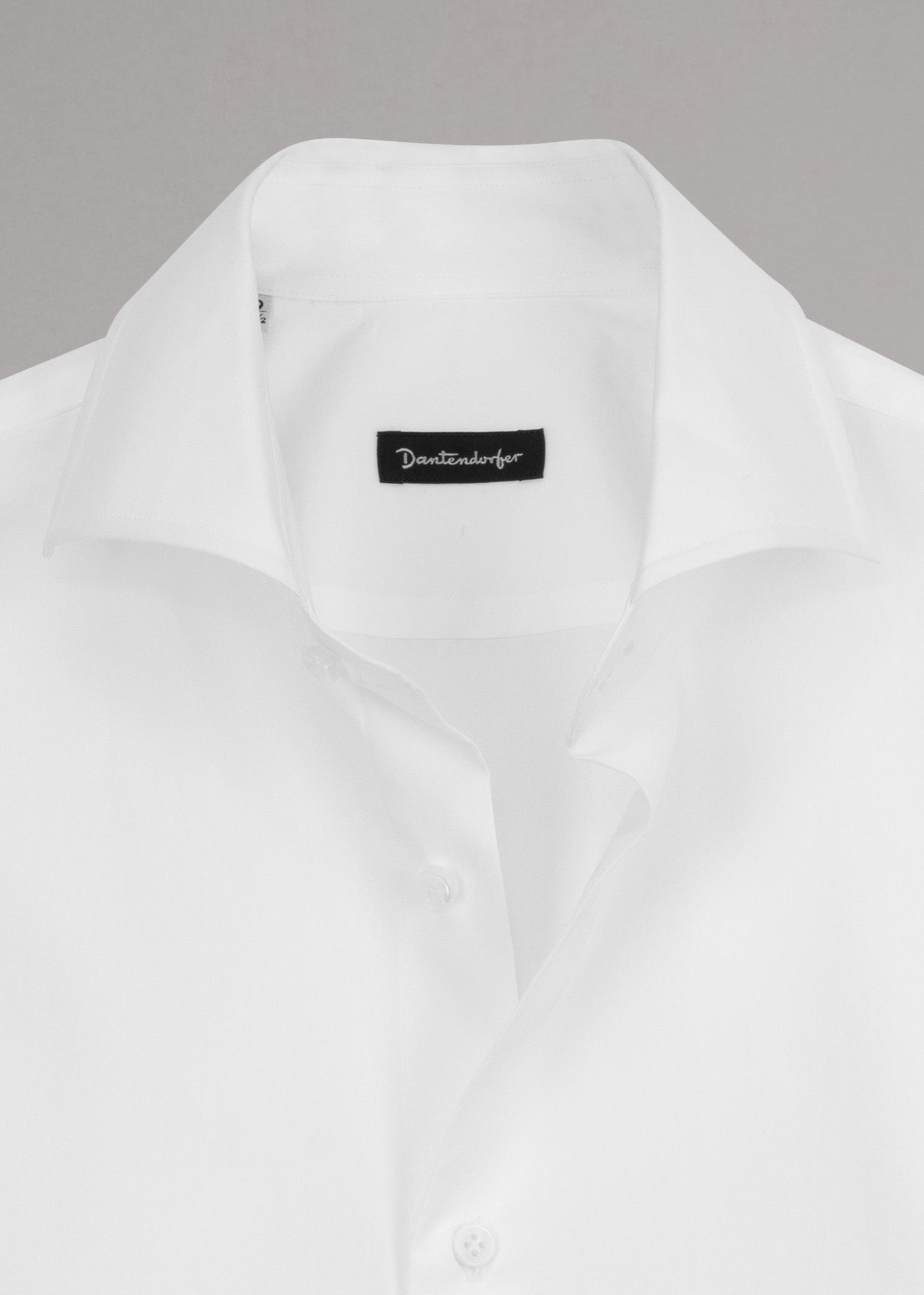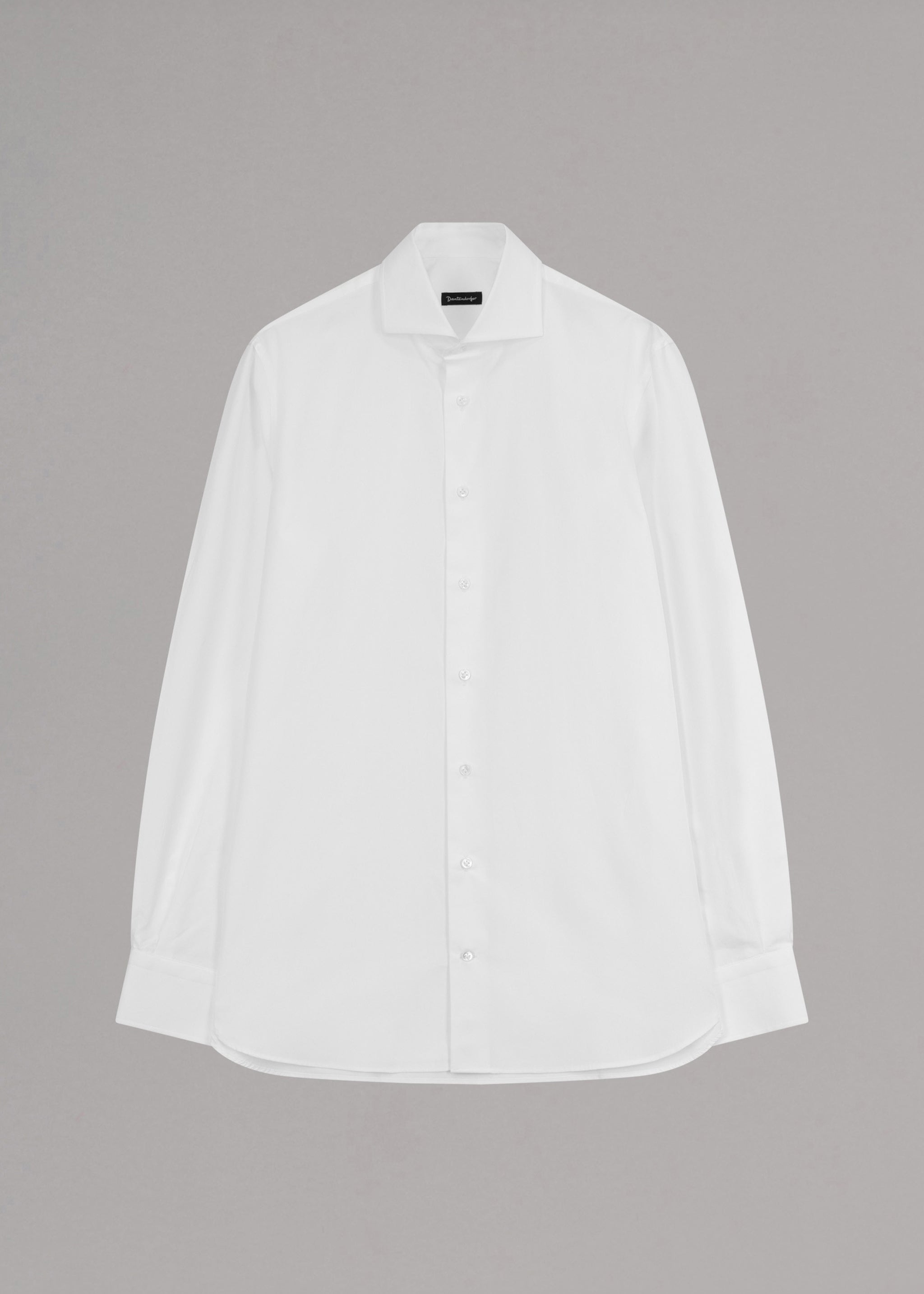 Baumwollhemd von Dantendorfer, Haifischkragen, lange Ärmel mit Knopfmanschette, durchgehende Knopfleiste, abgerundeter Saum.