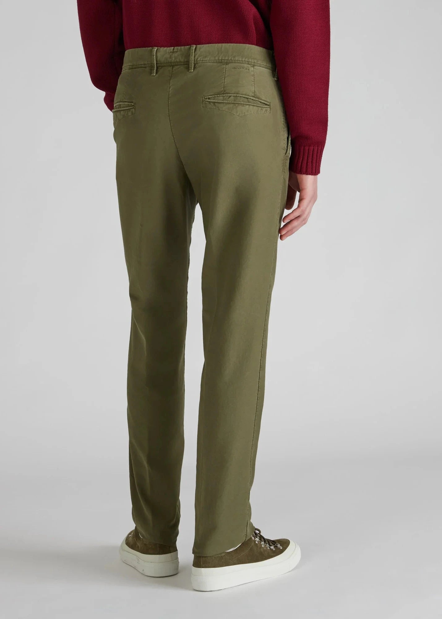 Slim-Fit Hose von Incotex aus Stretch-Baumwolle, Gürtelschlaufen, Knopf- und Reißverschluss, Bügelfalten, Eingriffstaschen, Paspelgesäßtaschen.