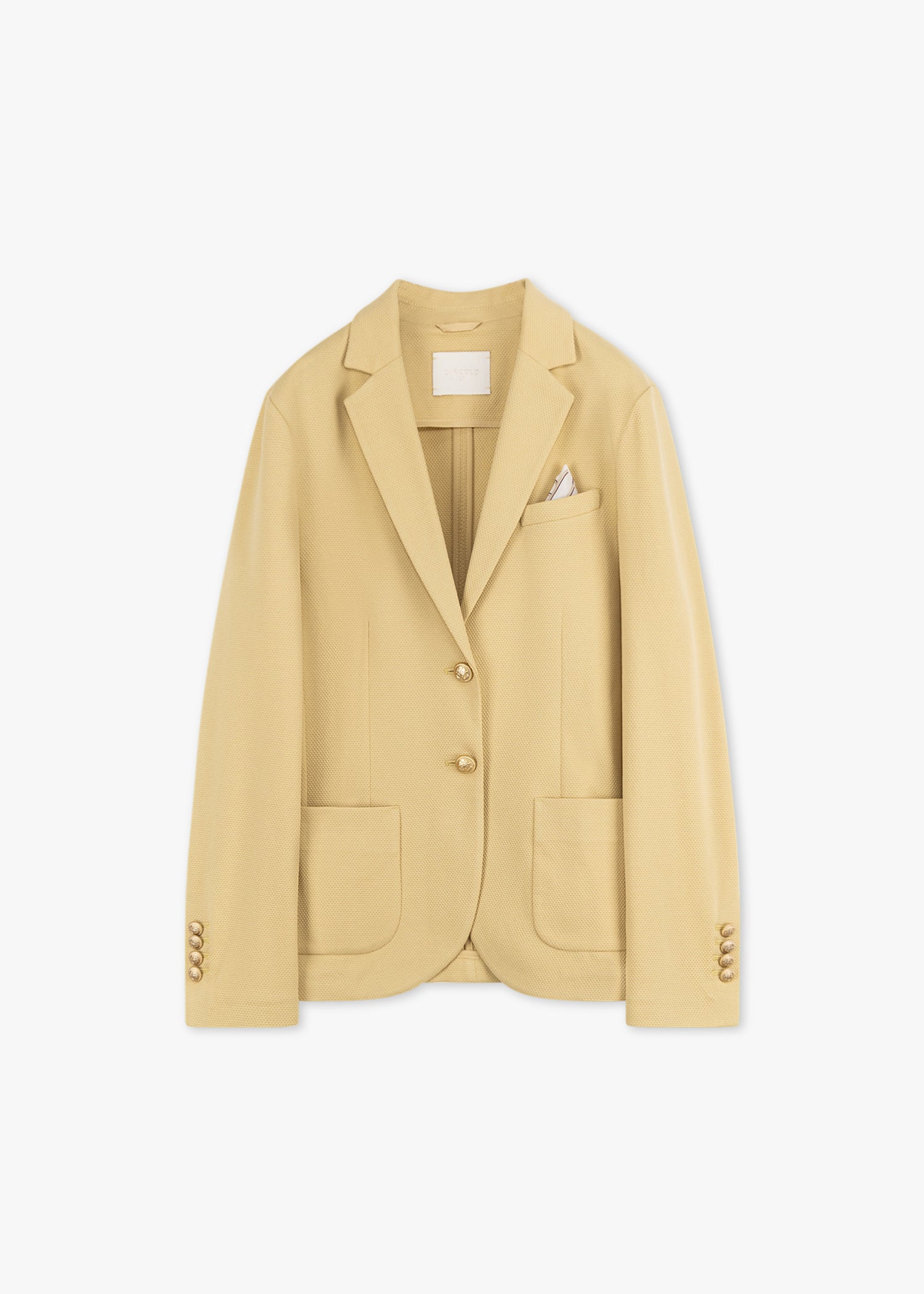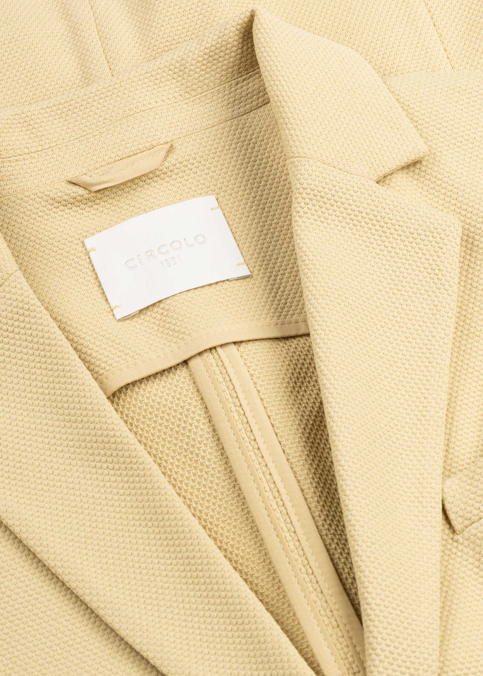 Schmaler Blazer 'Oxford' von Circolo 1901 mit feiner Wabenstruktur, fallendes Revers, lange Ärmel mit Knopfmanschette, Statementknöpfe, eine Brusttasche mit eingenähtem Stecktuch, zwei aufgesetzte Taschen, Abnäher im Vorder- und Rückenteil, leicht abgerundeter Saum, ungefütterte Verarbeitung.