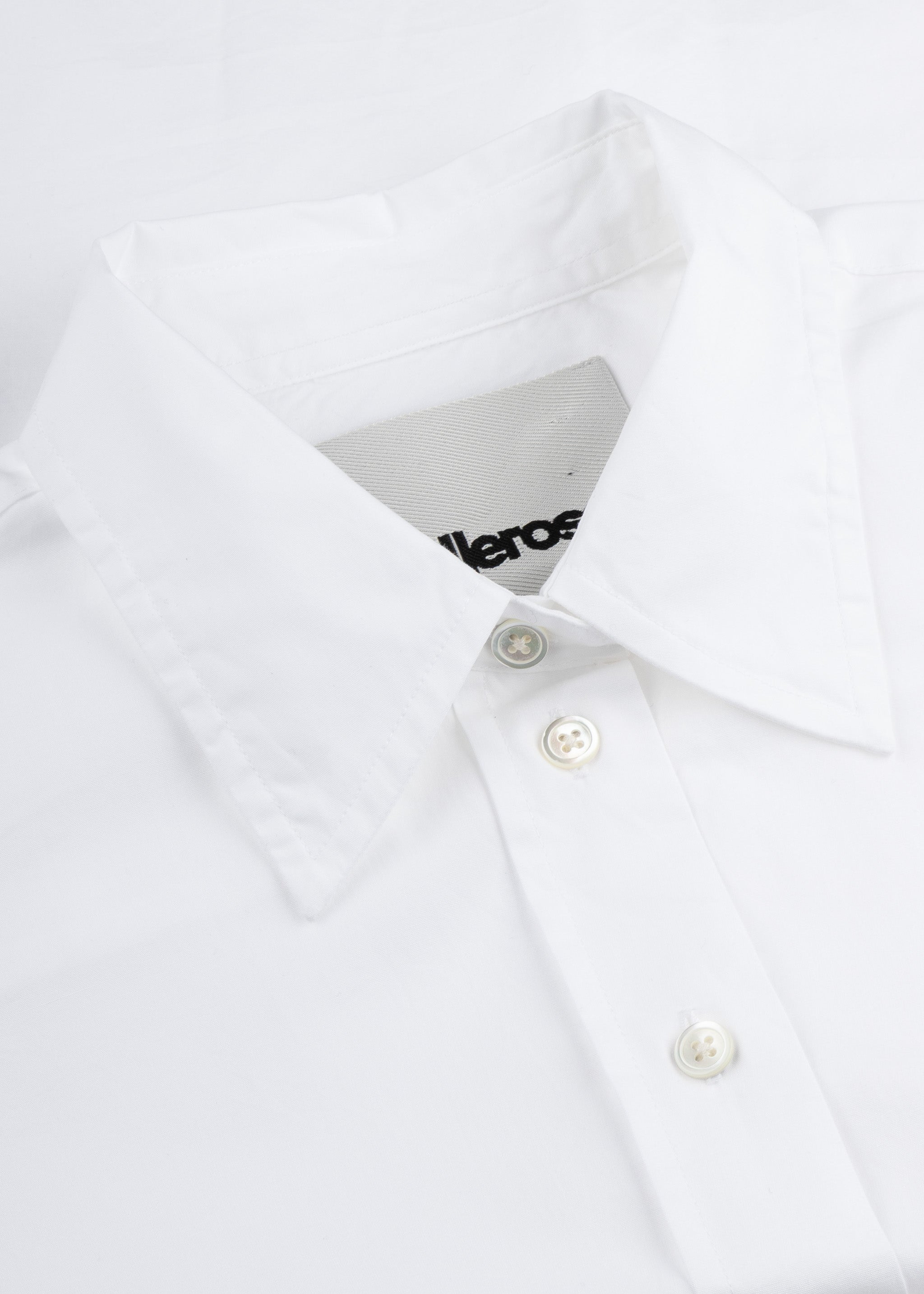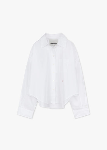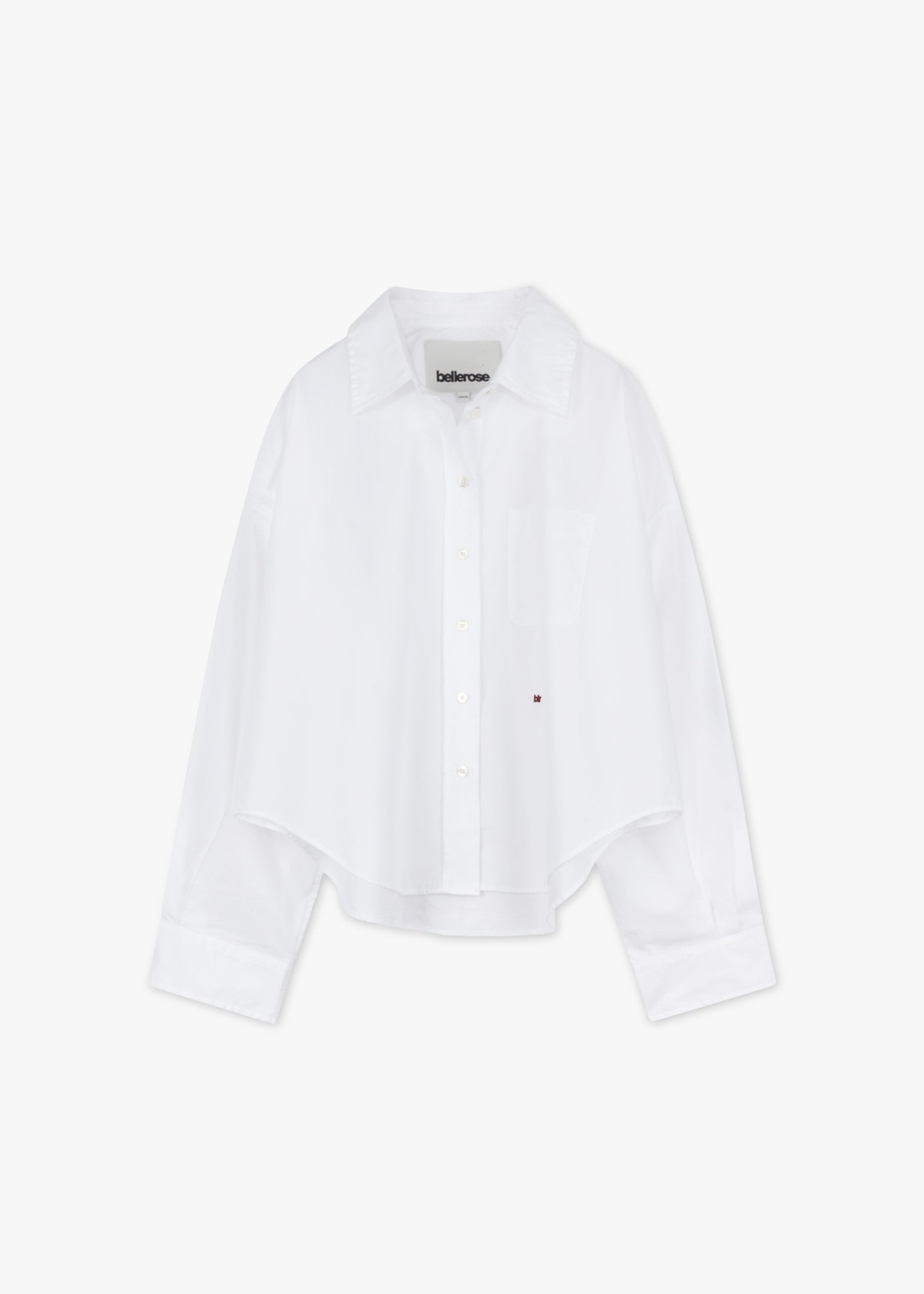 Cropped Bluse 'Ginger' von Bellerose aus weicher Baumwolle, klassischer Kragen, überschnittene Schultern, lange Ärmel mit Knopfmanschetten, durchgehende Knopfleiste, eine Brusttasche, kleine Logo-Stickerei, Rückenpasse, Vokuhila-Saum.