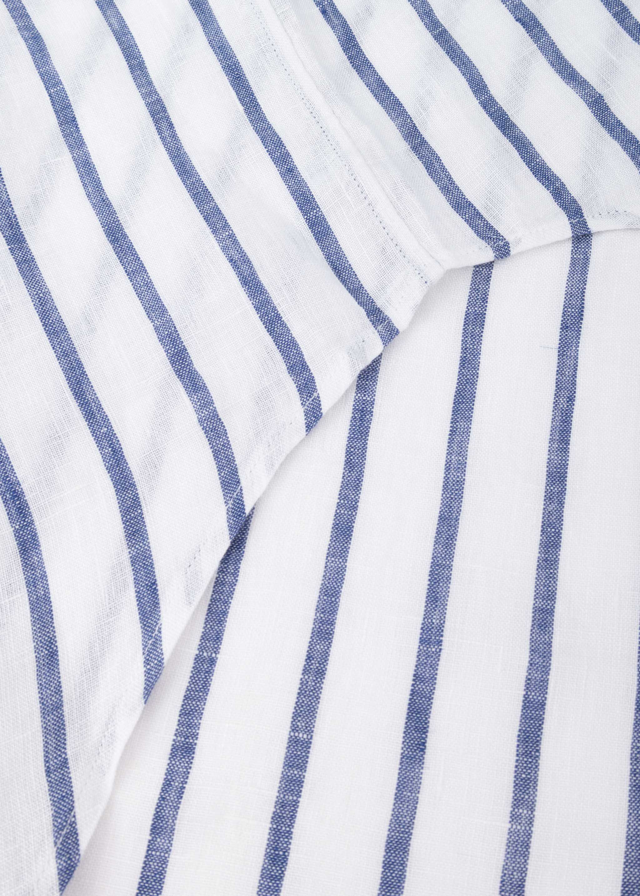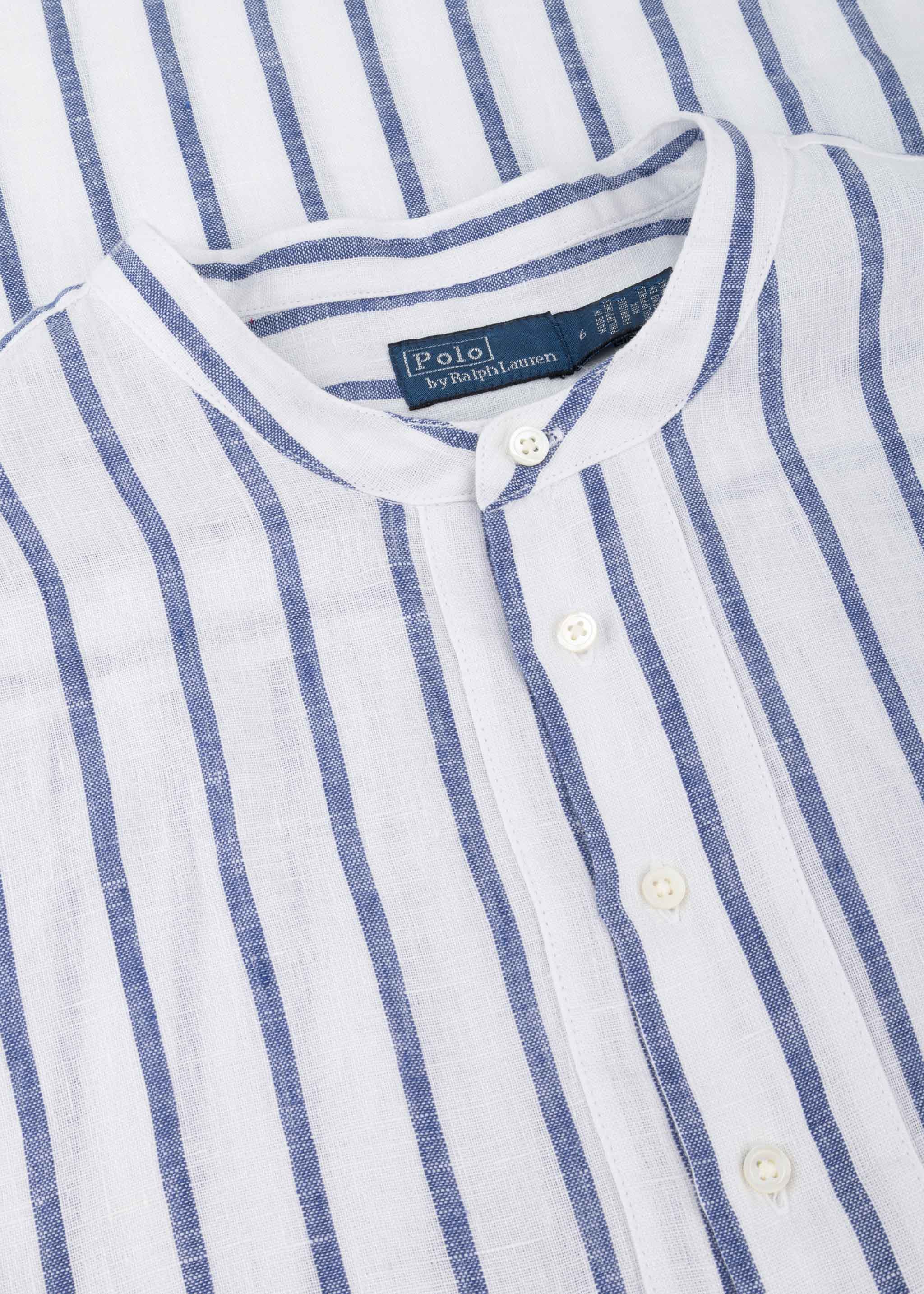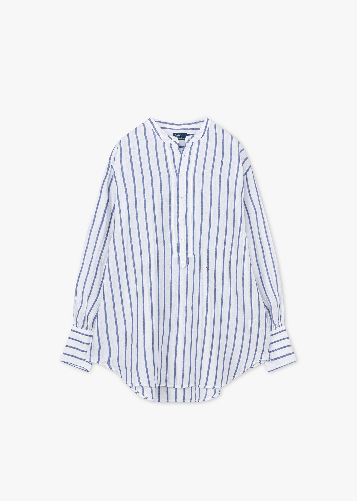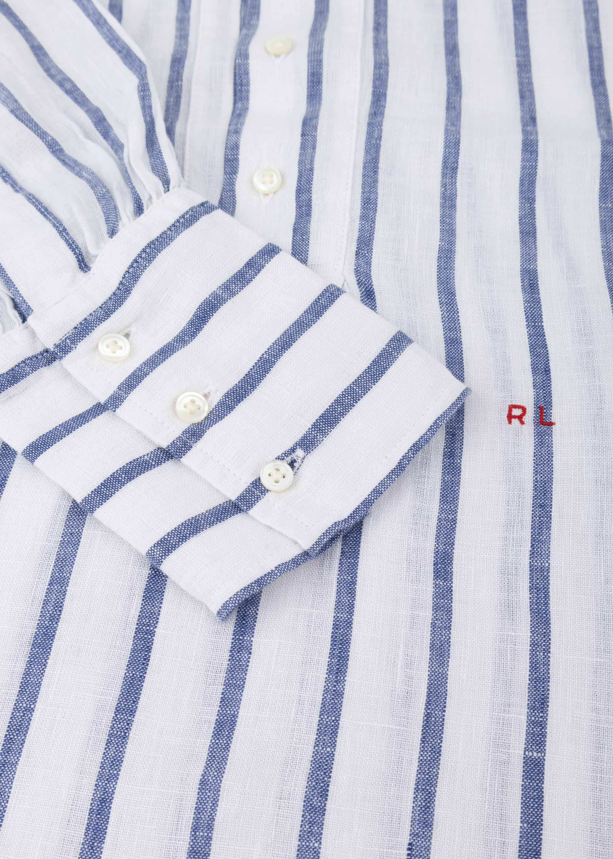 Gestreifte Hemdbluse von Polo Ralph Lauren aus luftigem Leinen zum Schlupfen, Stehkragen mit kurzer Knopfleiste, Rückenpasse mit gelegten Falten, überschnittene Schultern, lange Ballonärmel mit verlängerten Knopfmanschetten, gesticktes Logo, Vokuhila-Saum, bewusst locker geschnitten.